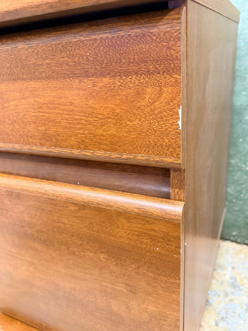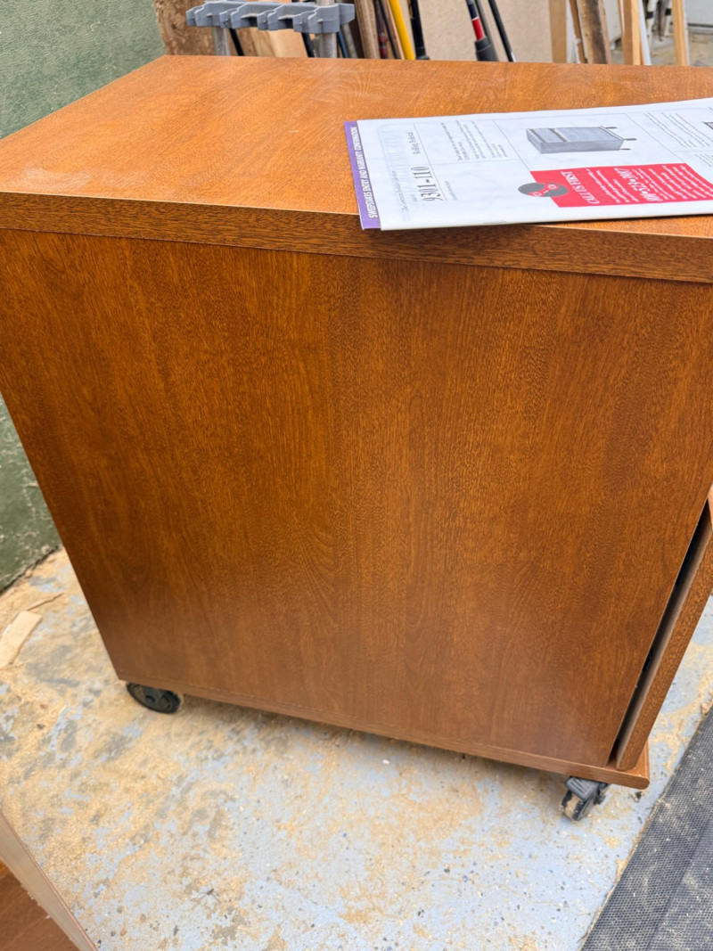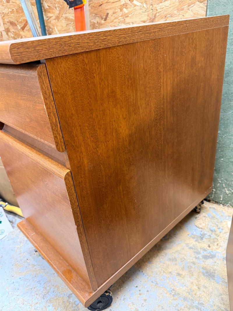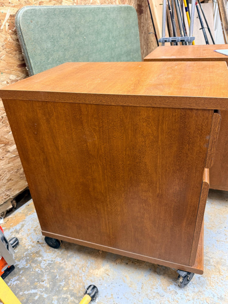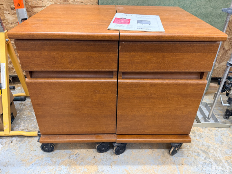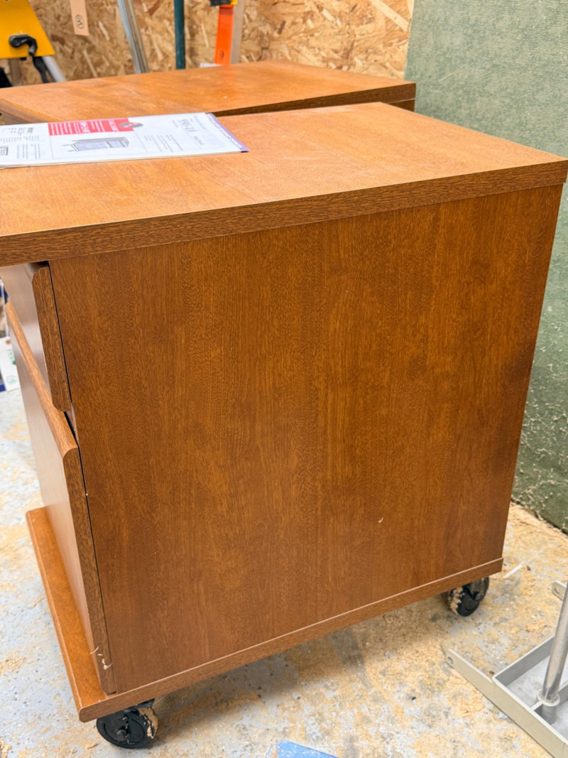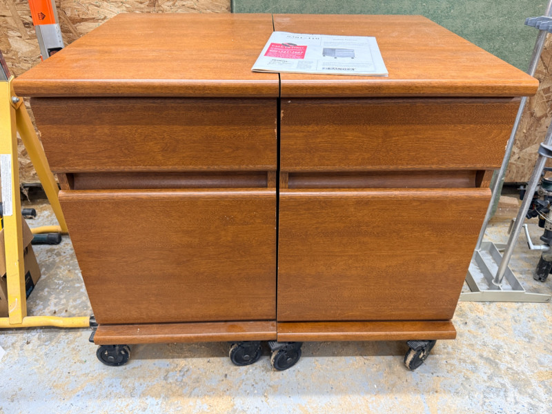 (2) Sauder Rolling Pedestal Drawer Units Nice rolling 2-drawer cabinets, could be file cabinets or additional desk storage Medium brown veneer over MDF 26.75"T x 15.5"W x 23.5"D
