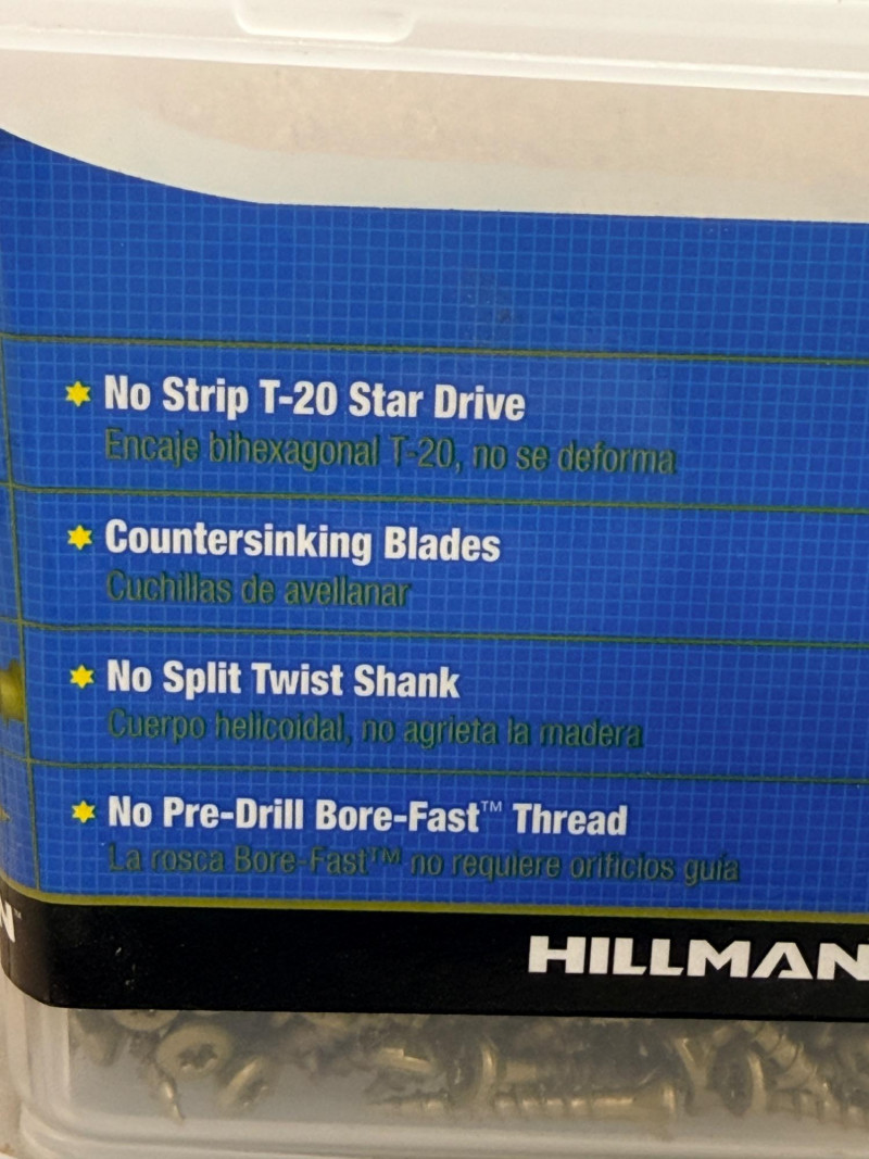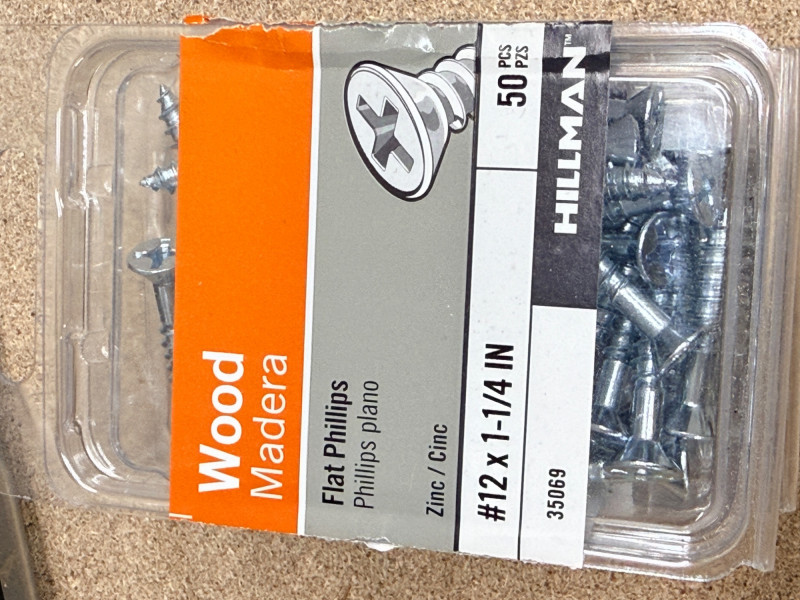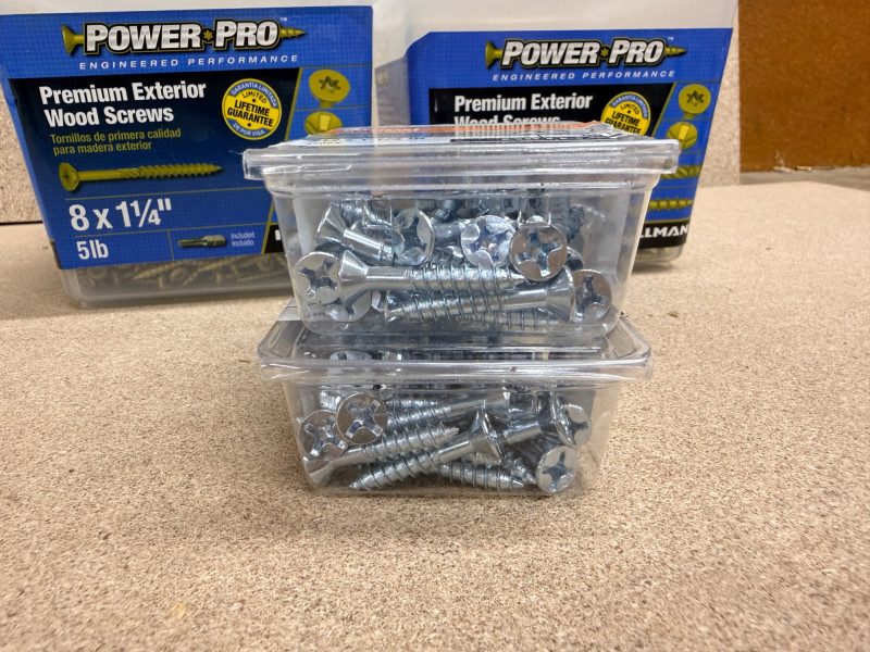 Hillman Power Pro Premium Exterior Wood Screws 8x1-1/2”. One unopened. Hillman Wood screws flat Phillips #12x 1-1/4”. One unopened.