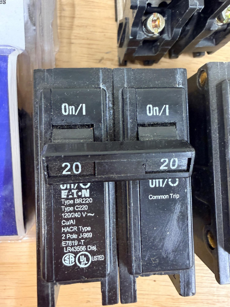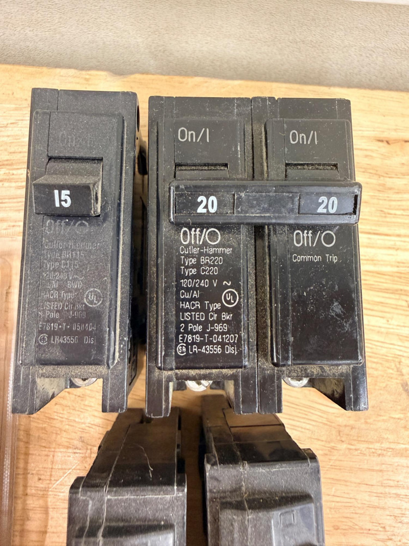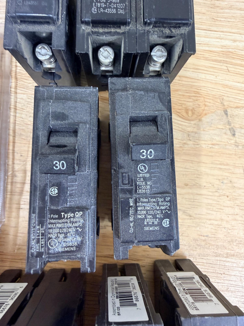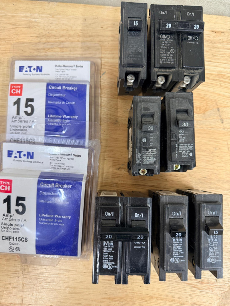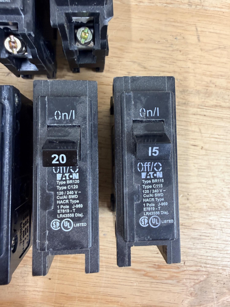 Cutler-Hammer, Eaton and Siemens 15, 20, and 30 amp Circuit Breakers Siemens single pole 15 amp and double pole 20 amp Cutler Hammer (2) single pole 30 amp Eaton double pole 20 amp, single pole 20 and 15 amp (2) Eaton single pole 15 amp.
