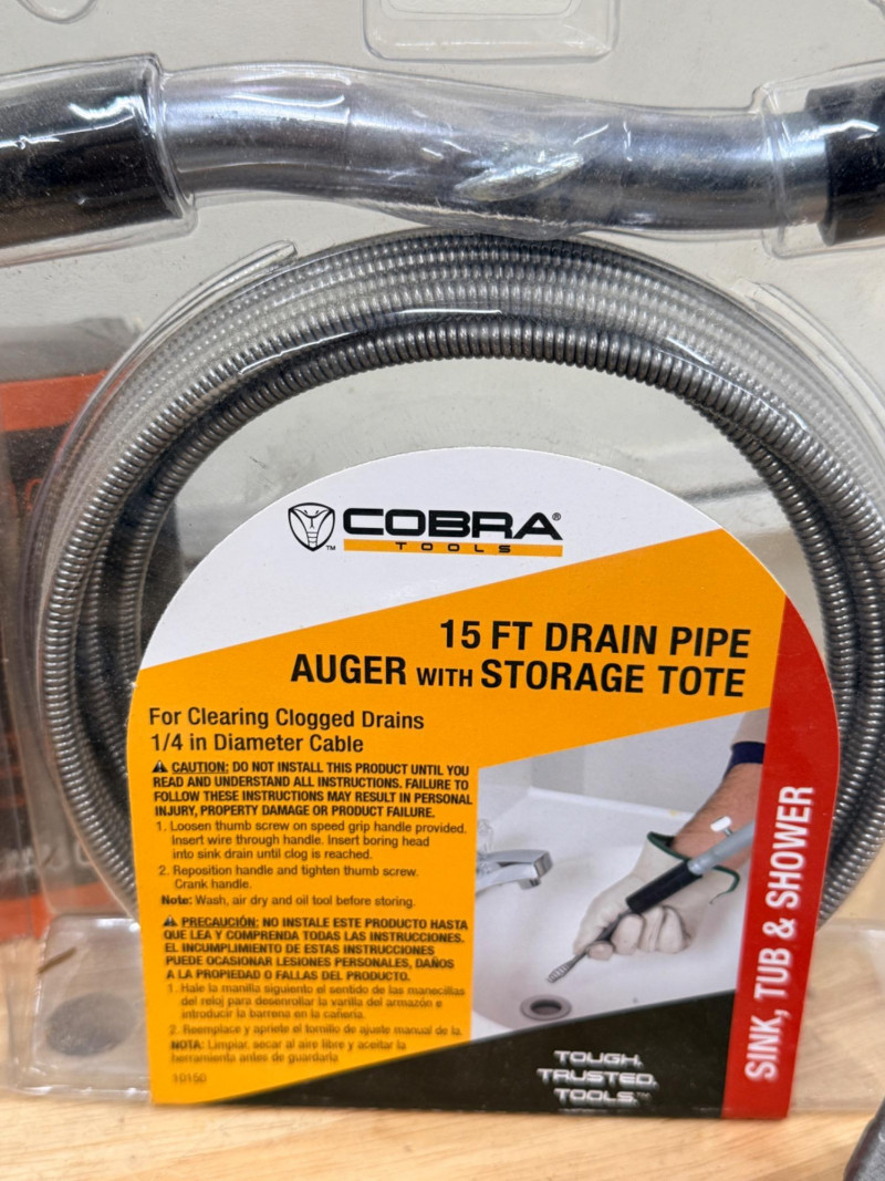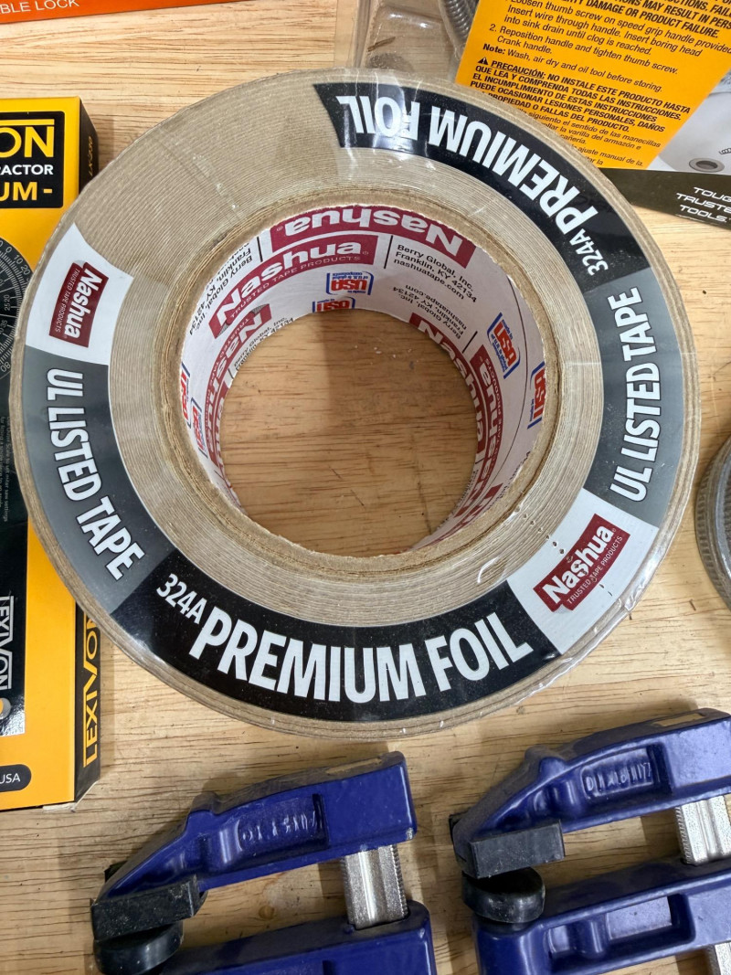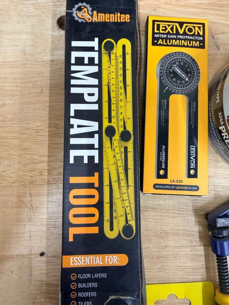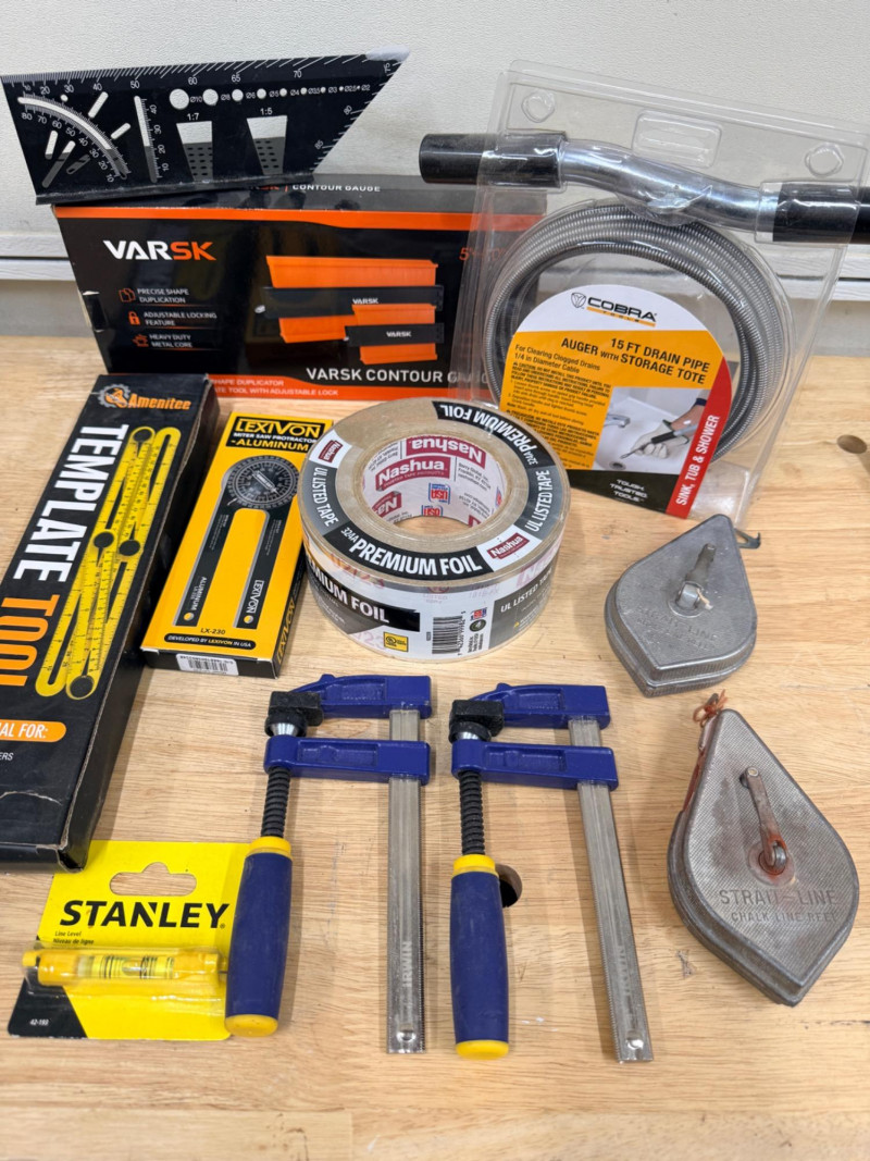 Miscellaneous Hardware & Tools Template tool Varsk Precision shape duplication tool Cobra 15’ drain auger 2.5”x 60 yards Foil Duct Tape 2 Strung Lines 2 Small Irwin Clamps Staley level Miter saw protractor and angle finder