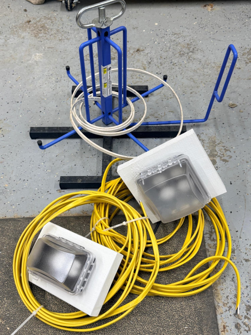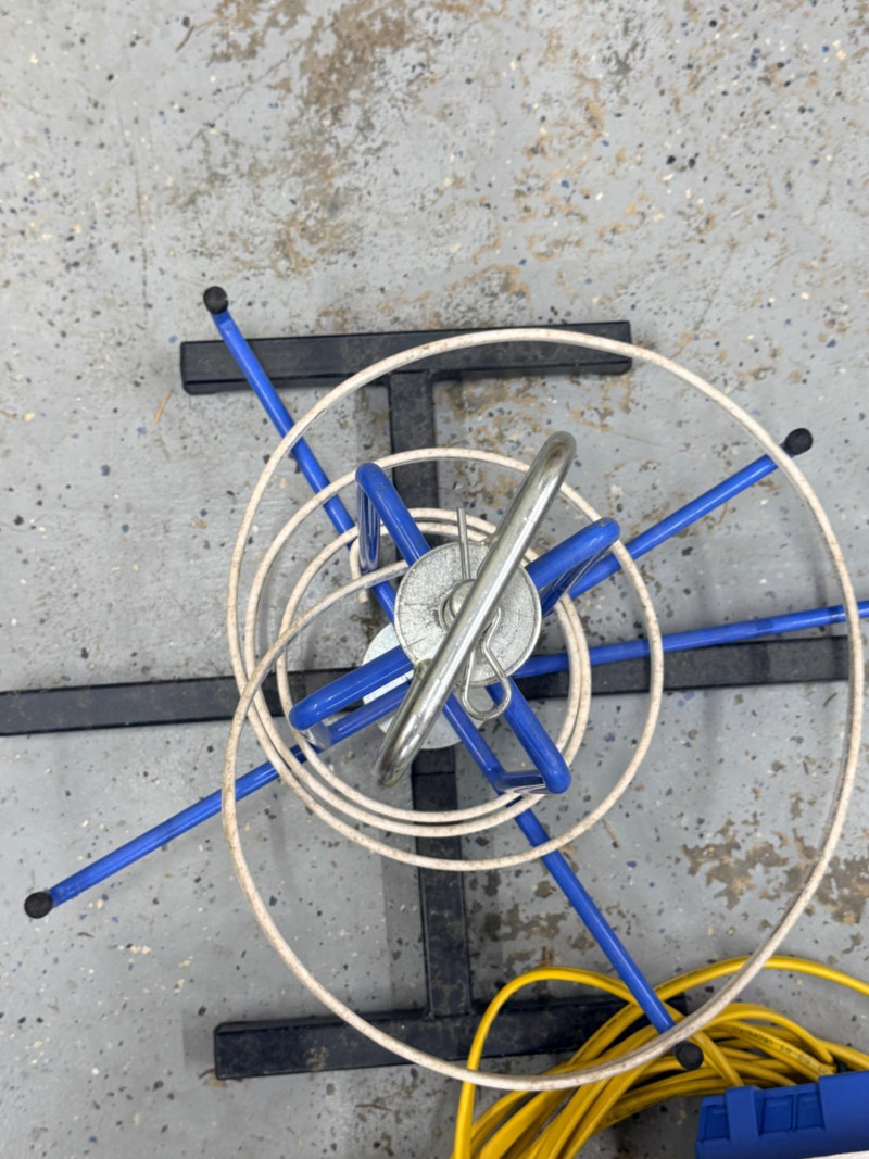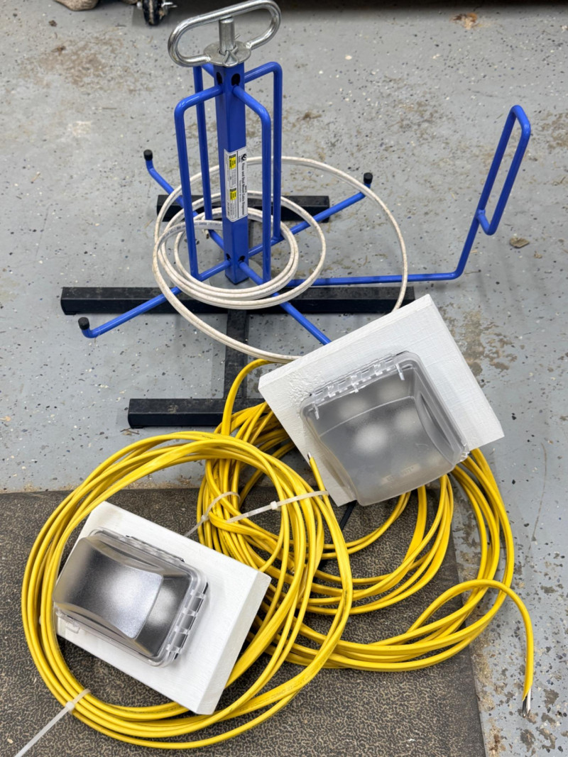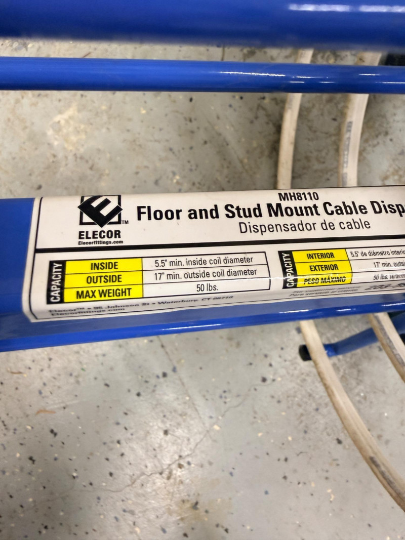 Wire Dispenser, Romex & Electrical Boxes -In and Out Spinning metal wire dispenser is 23”x16”x17” Wire is connected to the boxes which are mounted to a block of wood.
