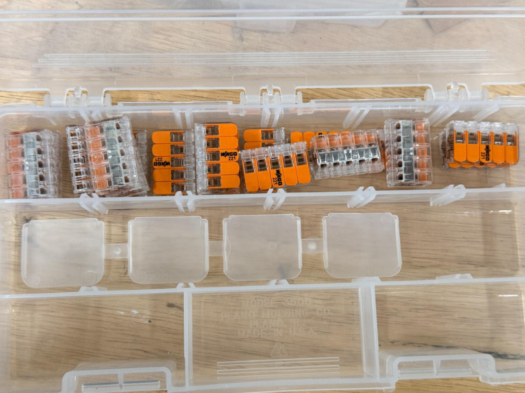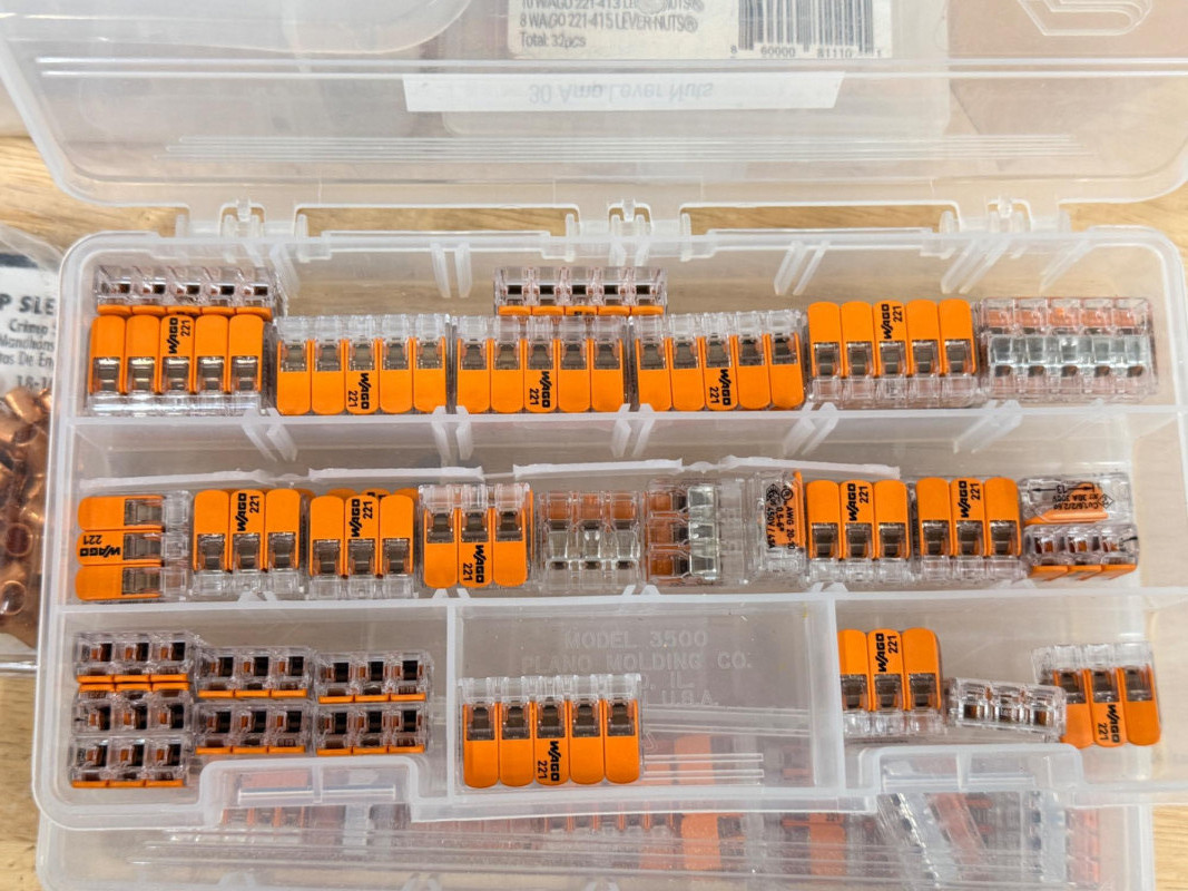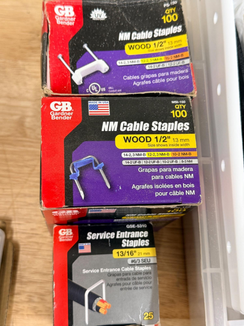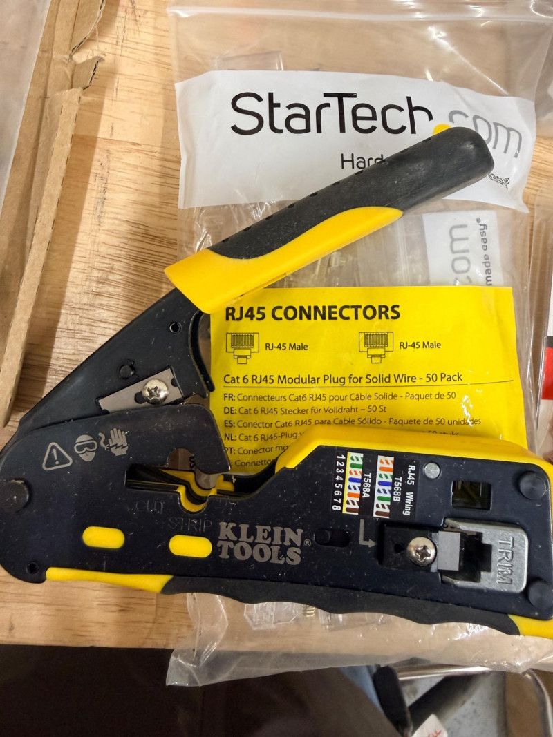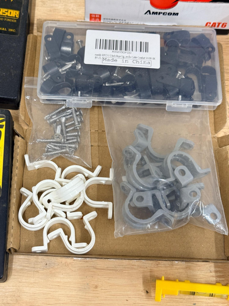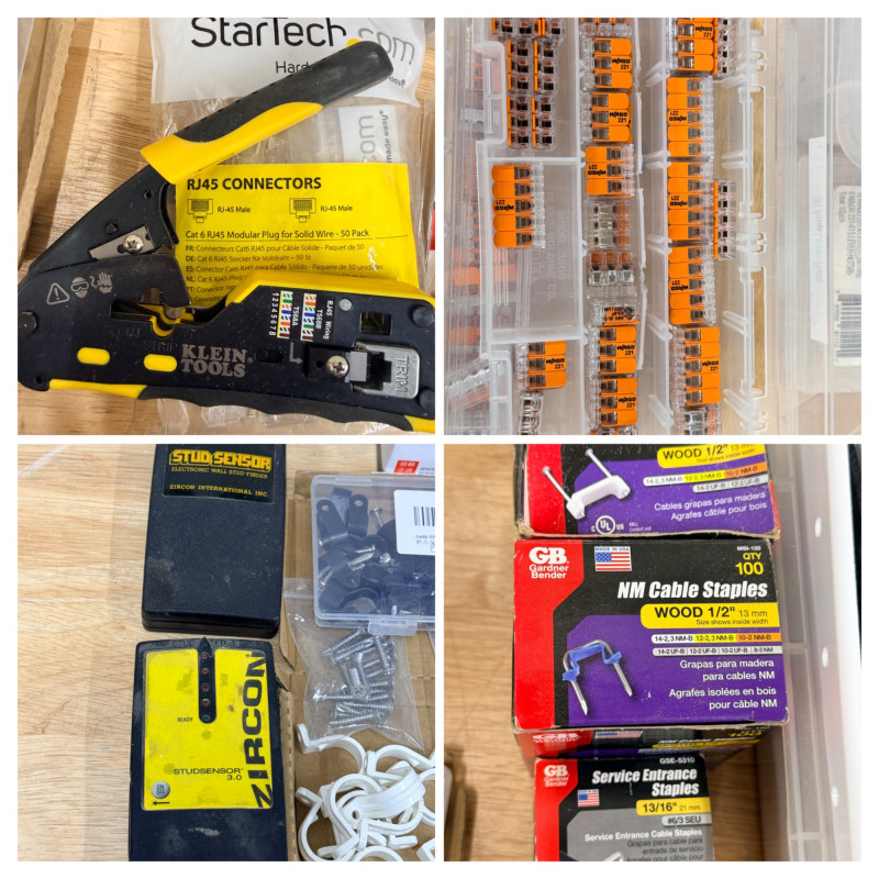 Electrical and Cable Connectors & Crimper, Staples and Covers (2) Stud Finders need batteries Outlet covers and blanks Lever nuts and splicing connectors Klein Tools RJ45 Crimper/cutter RJ45 Connectors Cable Staples