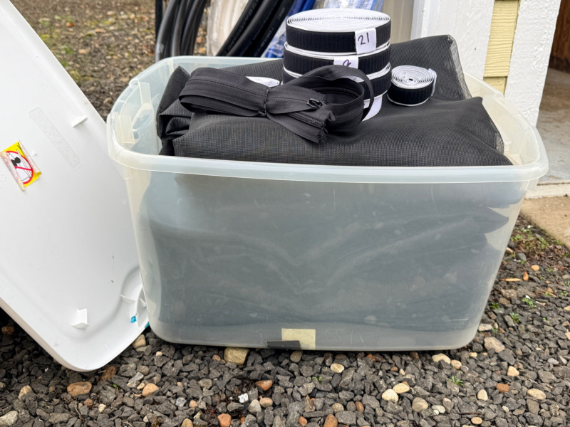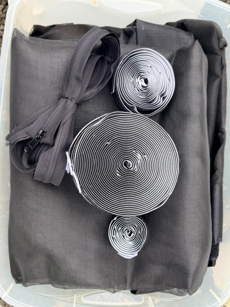 Size unknown. Very large folds of black screening, rolls of Velcro and zippers.