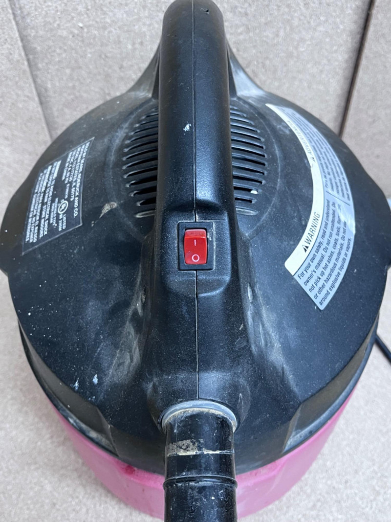 Red and black shop vacuum with handle for easy carrying.