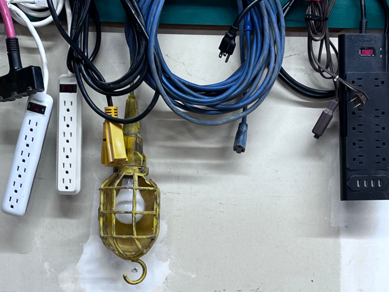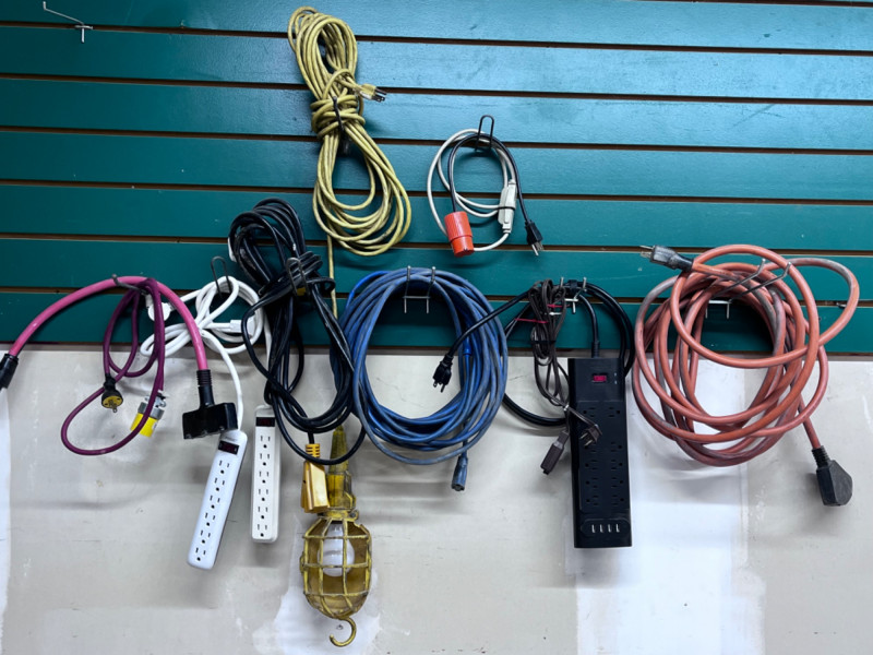 Heavy Duty Electrical Cords Multiple outlet inputs. One hanging light on long cord. Power strips Surge protector with USB's
