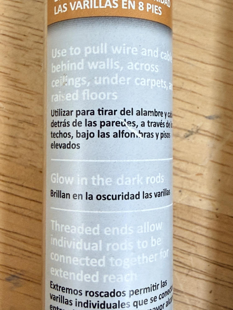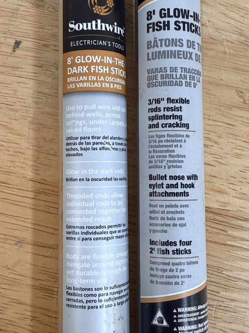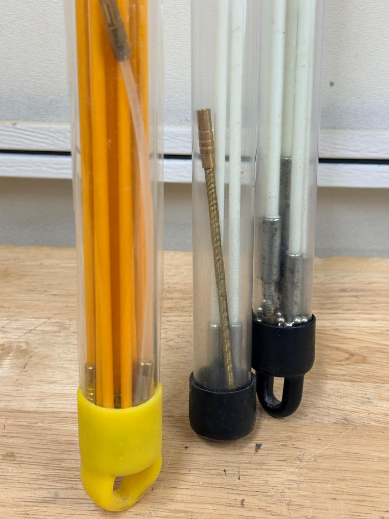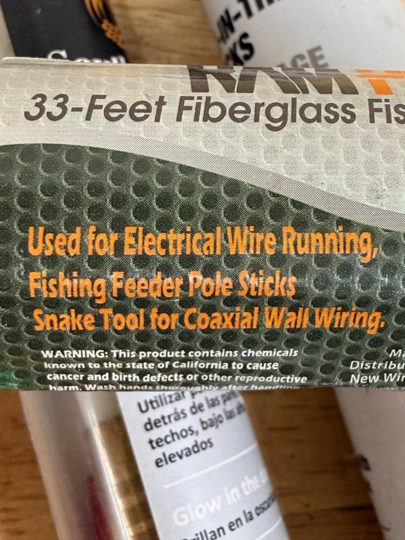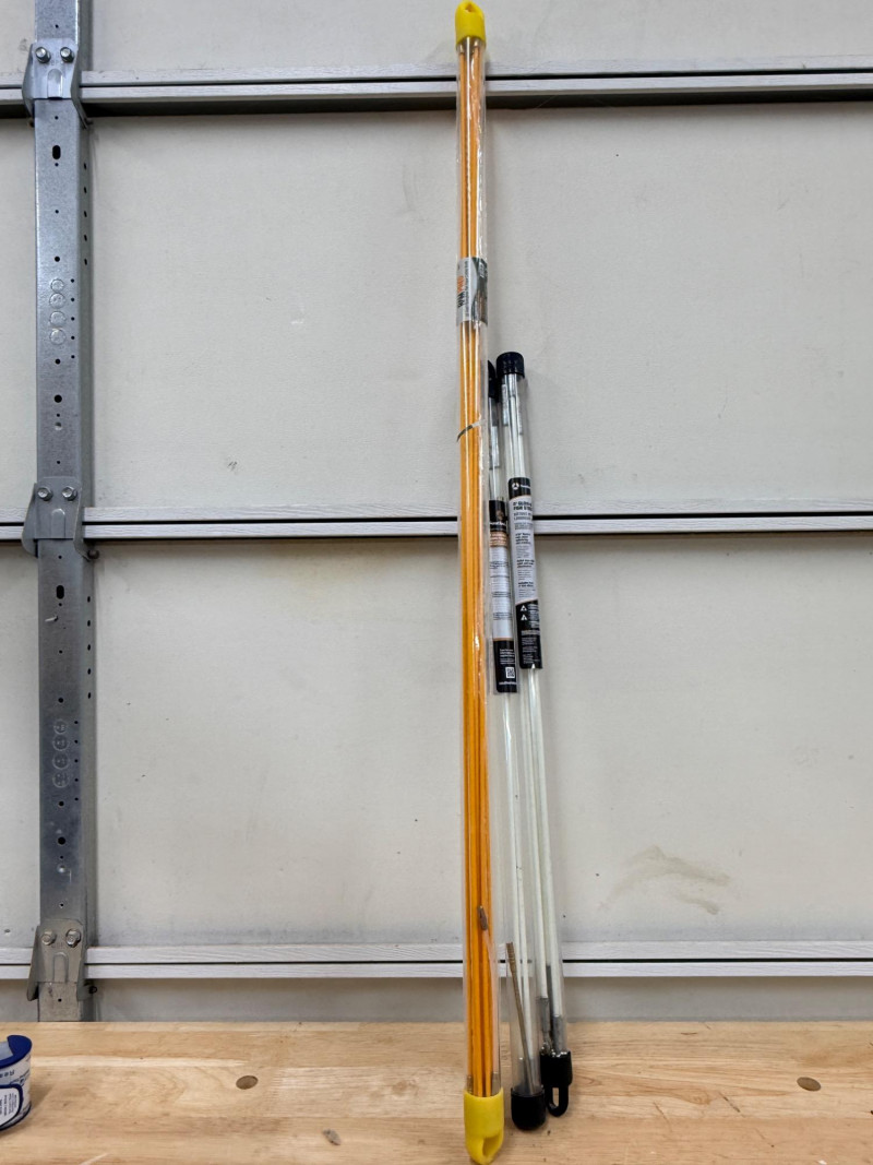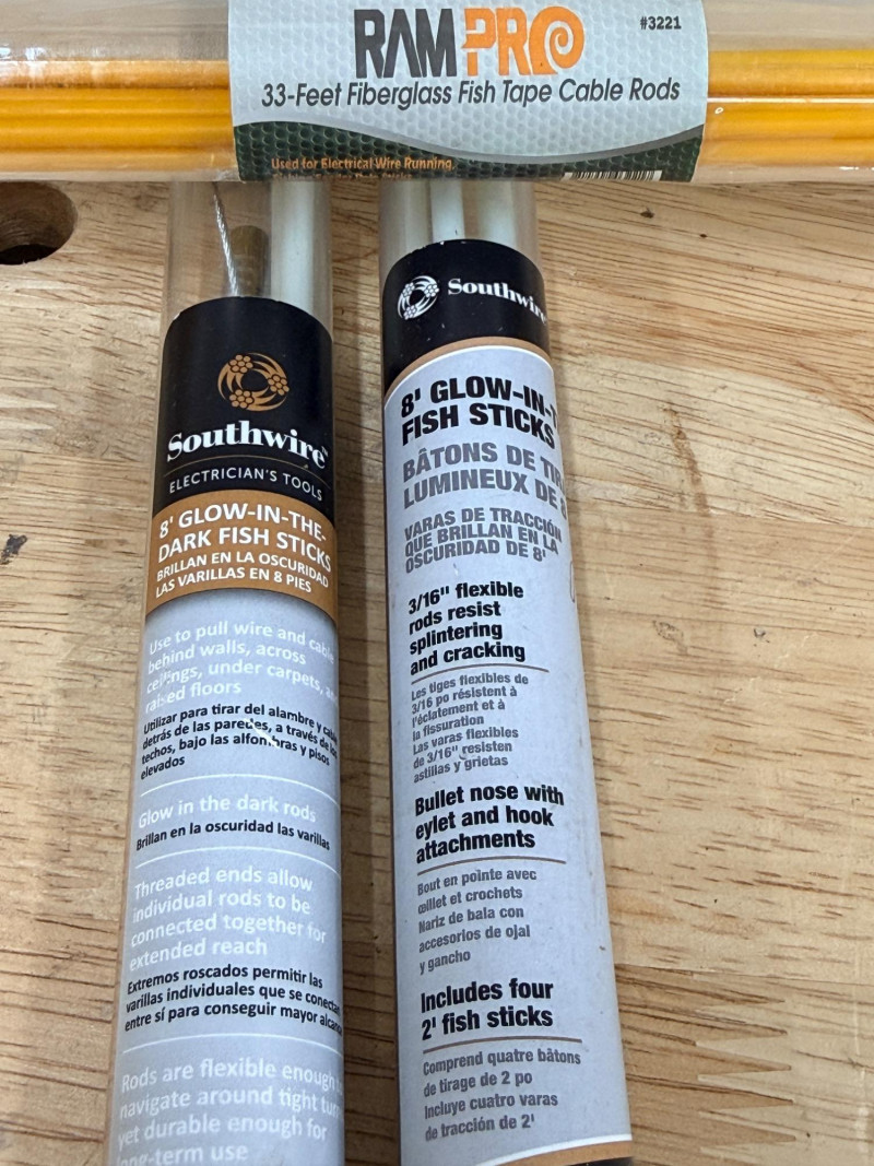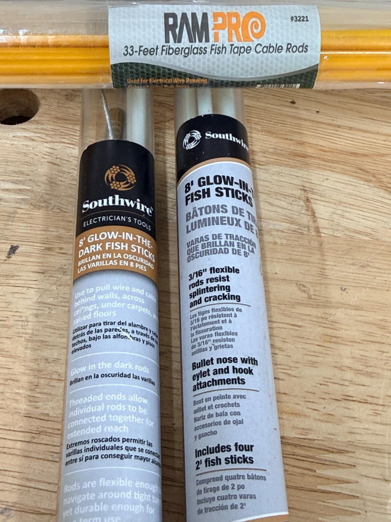 Rampro and Southwire Fish Tape Cable Rods Fishing feeder pole sticks to feed wire and cable through walls, under carpets, and over ceilings. (2) 8' Southwire 3/16" break resistant rods Rampro 33' fiberglass rods