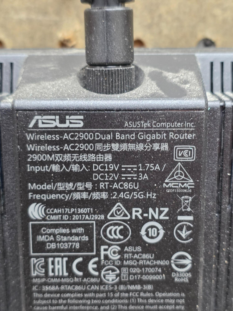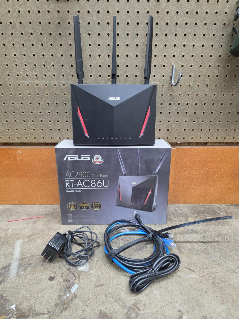 ASUS AC2900 Dual Band Gigabit WiFi Router ASUS Model #RT-AC86U High-performance AC2900 dual-band Wi-Fi gaming router known for its long-distance coverage, robust security features, and gaming optimizations. It is a highly-recommended, well-balanced choice for both general home users and dedicated gamers. Includes original box, manuals, 3 Ethernet cables, power cord Pulled from a working setup!