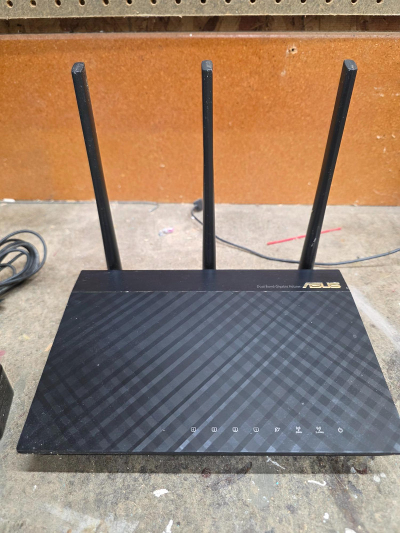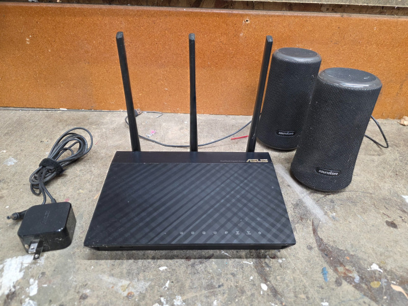 ASUS AC1750 Dual-Band Gigabit Wireless Router ASUS Model #RT-AC66U AC1750 dual-band gigabit Wi-Fi router known for its robust features like AiProtection security, AiMesh compatibility, and solid performance for most home networking needs Includes power cord & 2 soundcore rechargeable Bluetooth speakers Pulled from a working wireless setup!