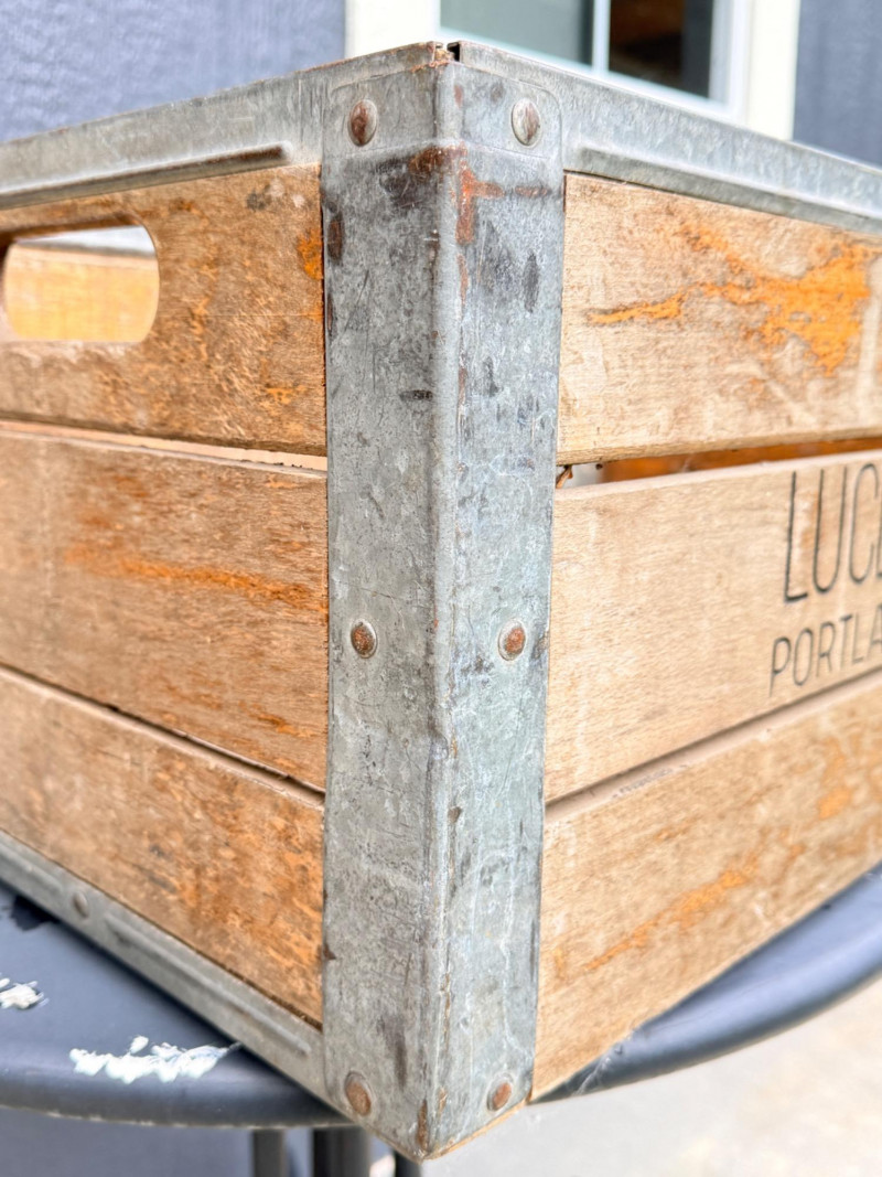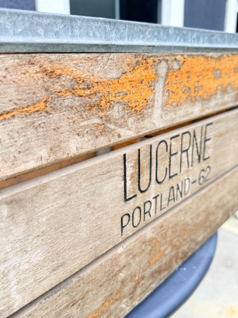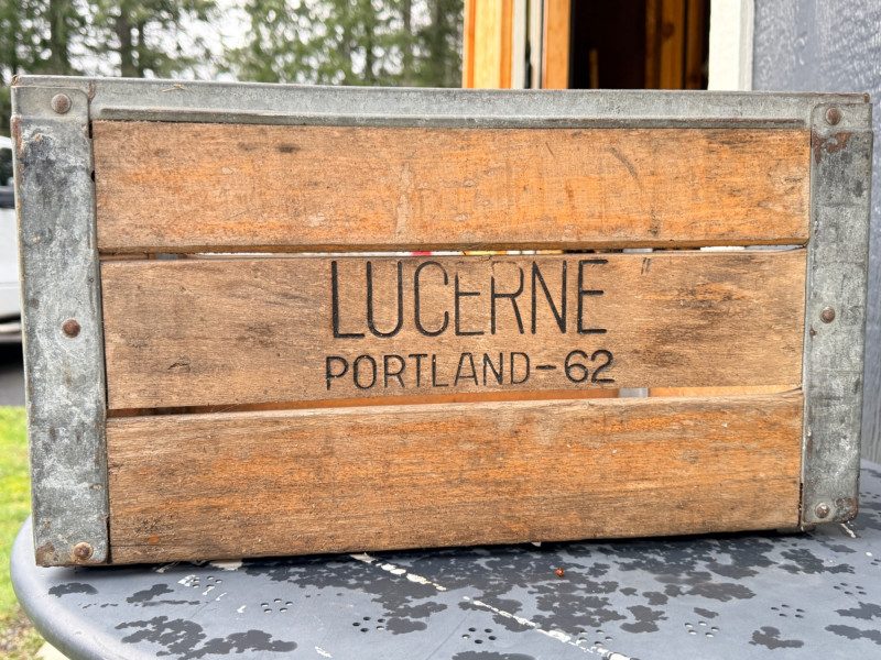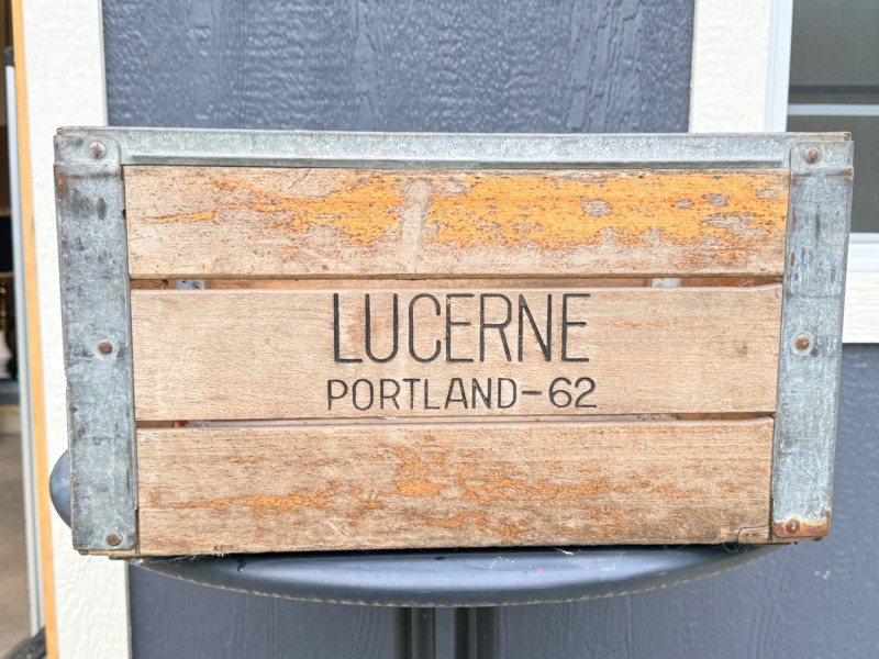 Lucerne Portland - 62 Milk Crate With Galvanized Reinforcements. This box is solid and heavy with LUCERNE Portland -62 burned in the front and back panels. 19”x13”x10.5” PNW Collectible history.