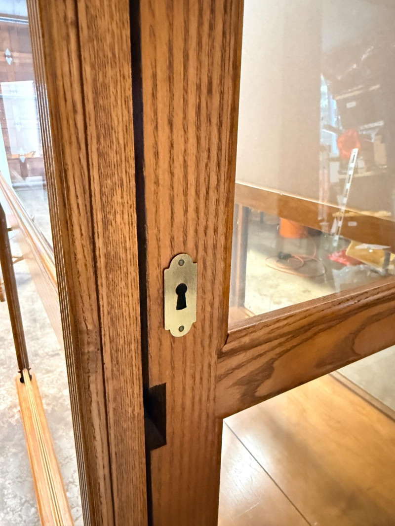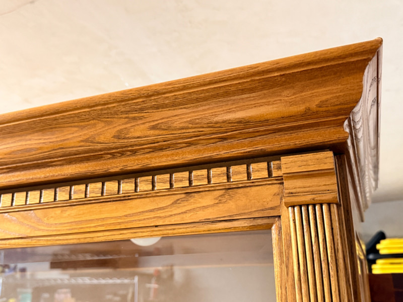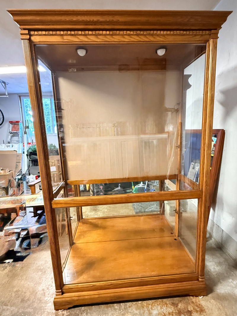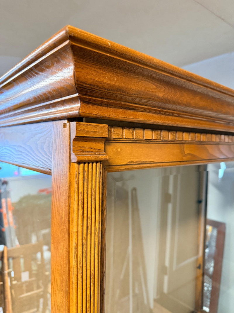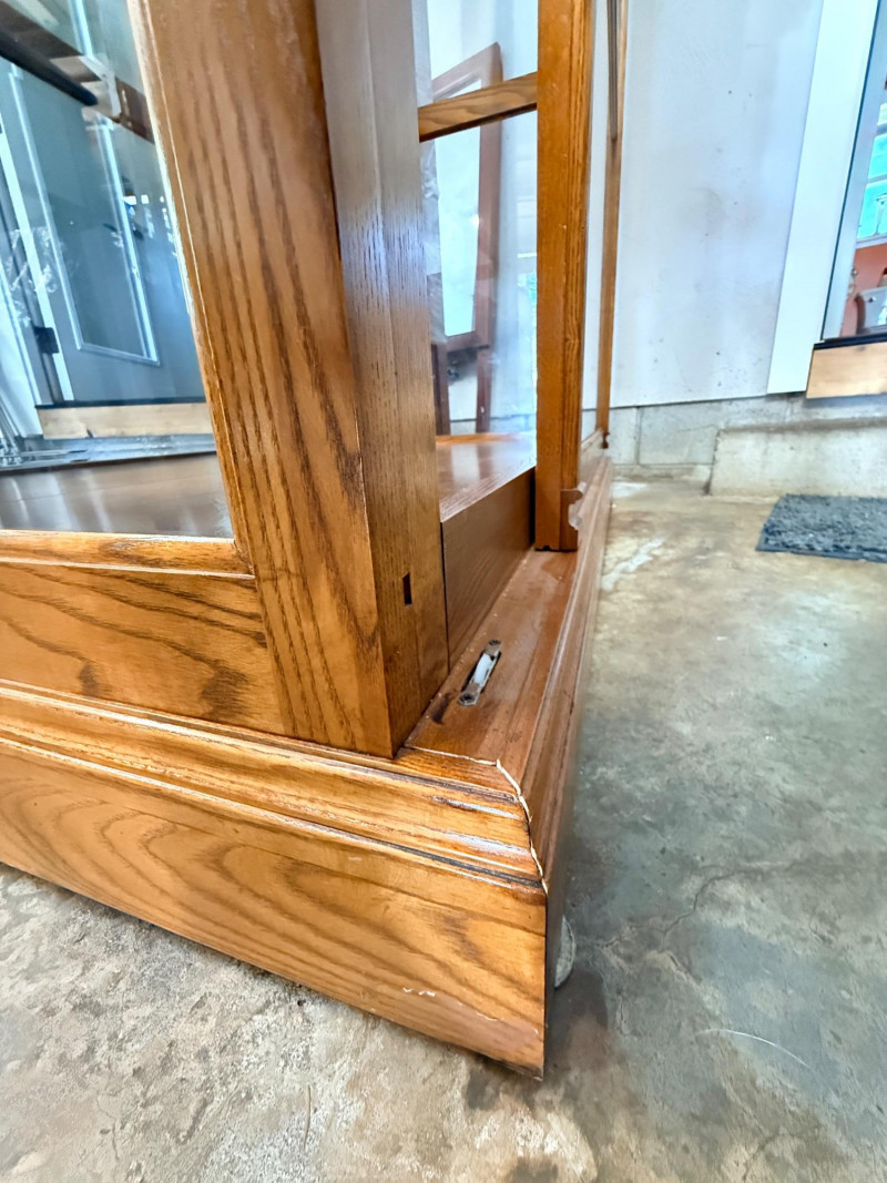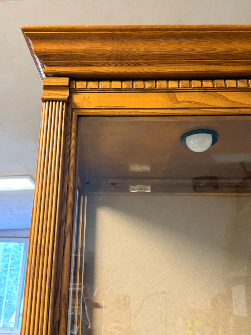 Howard Miller Curio Collectors Cabinet This cabinet is a double lighted model with a Golden Oak finish and features decorative details such as dentil molding along the pediment and reeded columns at the sides. This cabinet features a front glass door that slides in both directions for easy access.Lighting: The interior is illuminated, with a "No-Reach" roller. Adjustable interior includes multiple glass shelves with Pad-Lock™ cushioned metal clips for stability. Crafted from select hardwoods and veneers, these cabinets are known for their high-quality craftsmanship and are often made in the USA. Howard Miller Collector Cabinet is 50.5“ x 21“ x 80.5“ tall. The cabinet originally had an upper back mirror. See pics. No key.