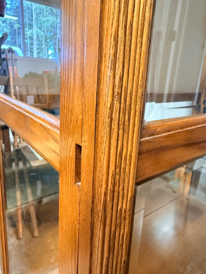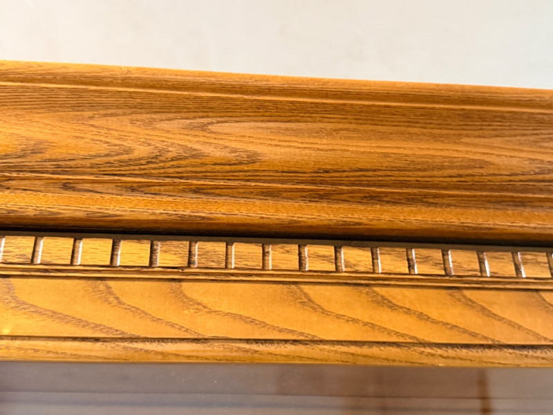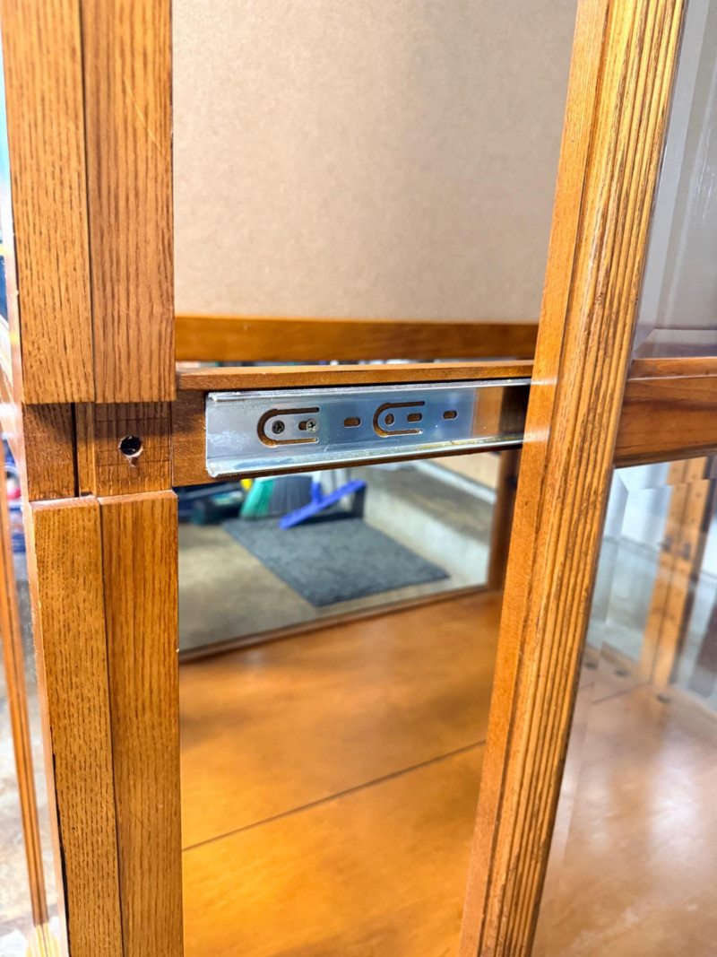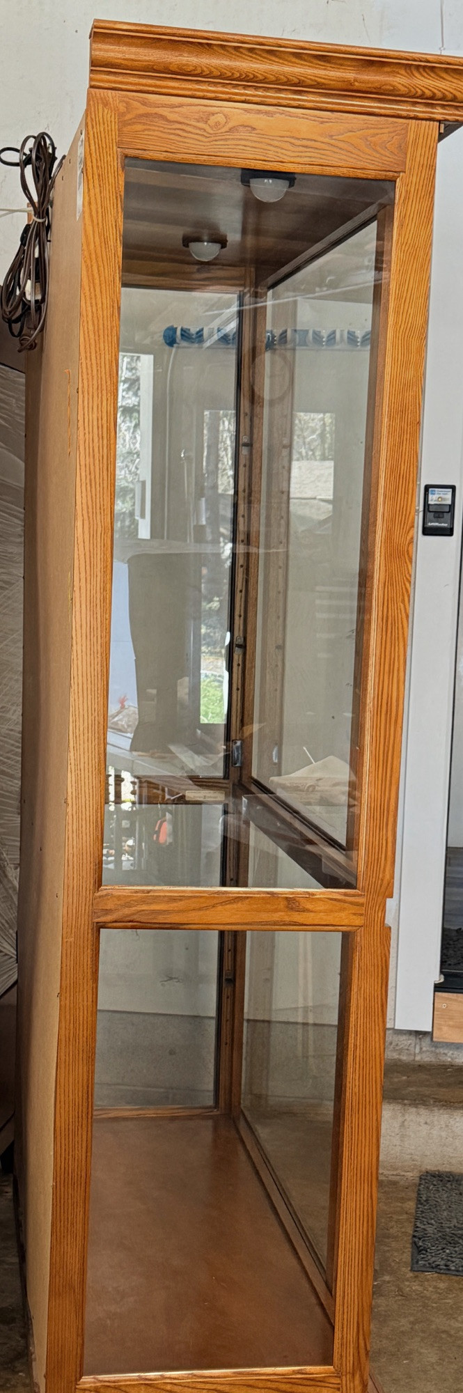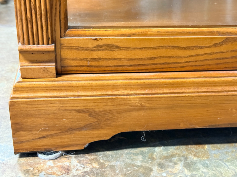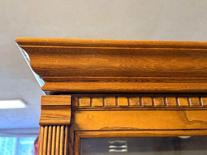 Howard Miller Curio Collectors Cabinet This cabinet is a double lighted model with a Golden Oak finish and features decorative details such as dentil molding along the pediment and reeded columns at the sides. This cabinet features a front glass door that slides in both directions for easy access.Lighting: The interior is illuminated, with a "No-Reach" roller. Adjustable interior includes multiple glass shelves with Pad-Lock™ cushioned metal clips for stability. Crafted from select hardwoods and veneers, these cabinets are known for their high-quality craftsmanship and are often made in the USA. Howard Miller Collector Cabinet is 50.5“ x 21“ x 80.5“ tall. The cabinet originally had an upper back mirror. See pics. No key.