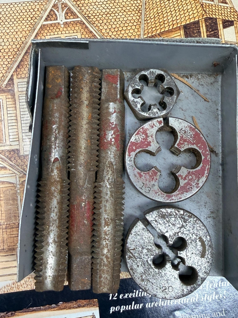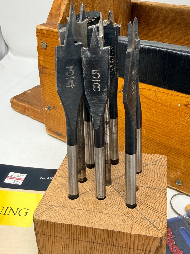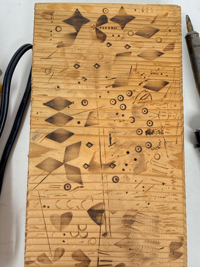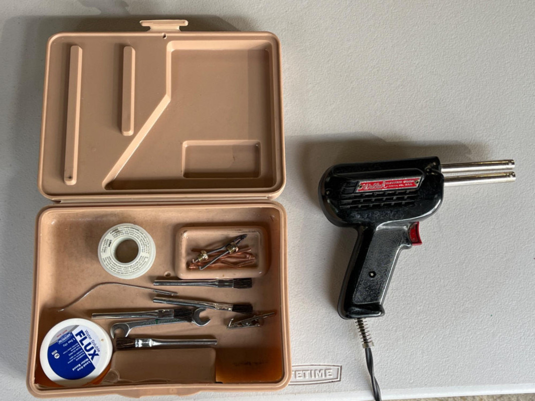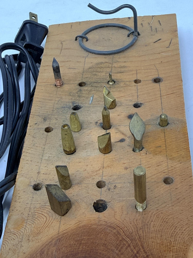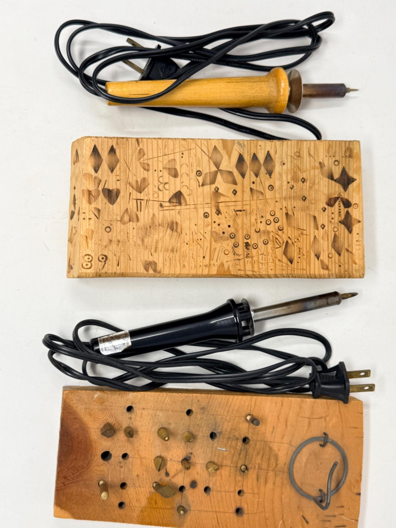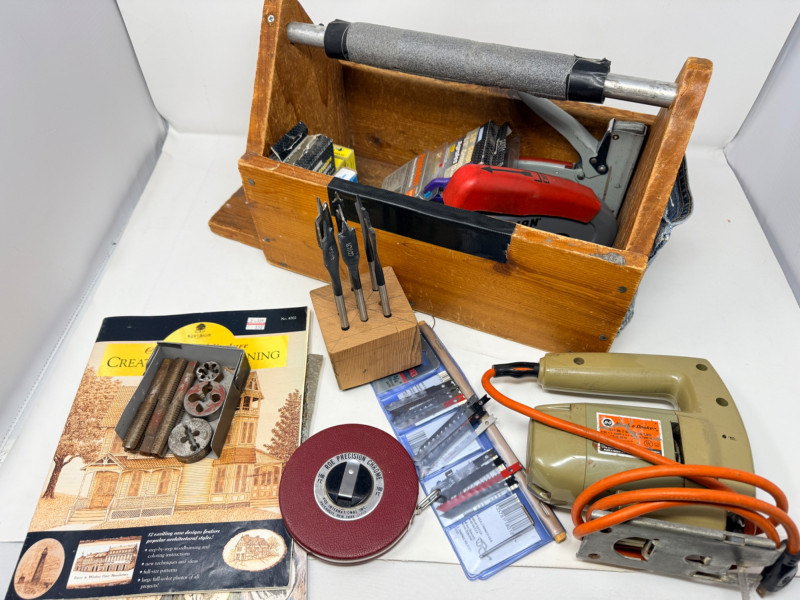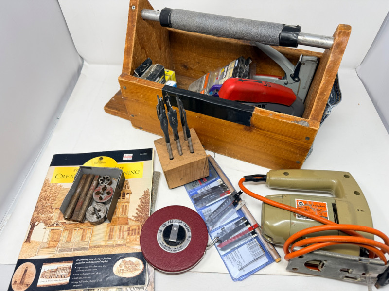 Wood Cutting Burning and Engraving Tools in Box Engraving tool, woodburning tool both tested and work. Glue gun, spade drill bits Black and Decker skill saw and blades Tap and Die 2 staplers Swingline and Craftsman 100’ metal tape measurer wood burning books and tips Wire spools Wood tool caddy measures 18.25x8.75”x10” Johnson #1348 48” Aluminum Bubble Level Weller soldering gun #D-440 Soldering gun is untested.
