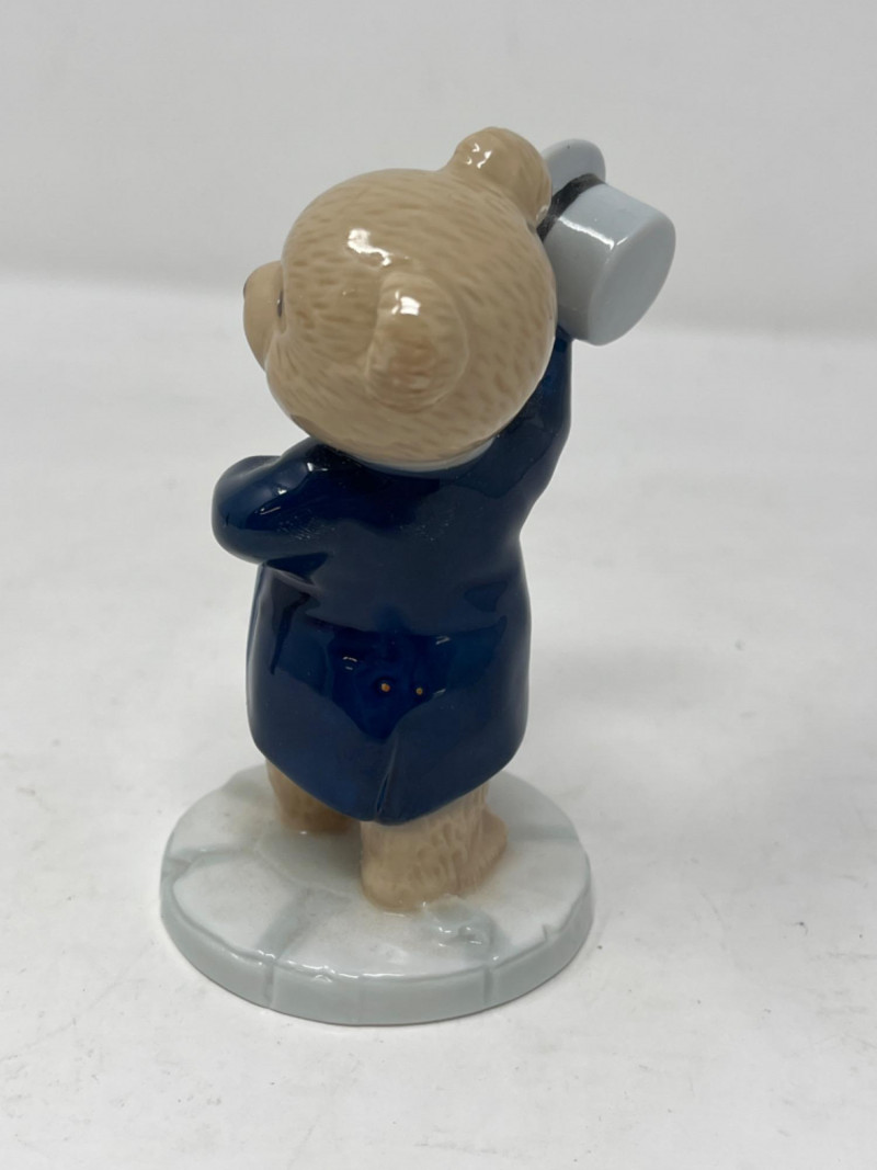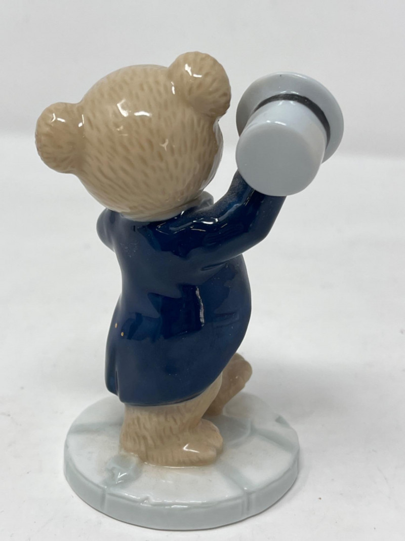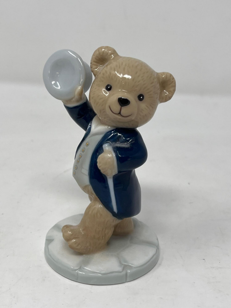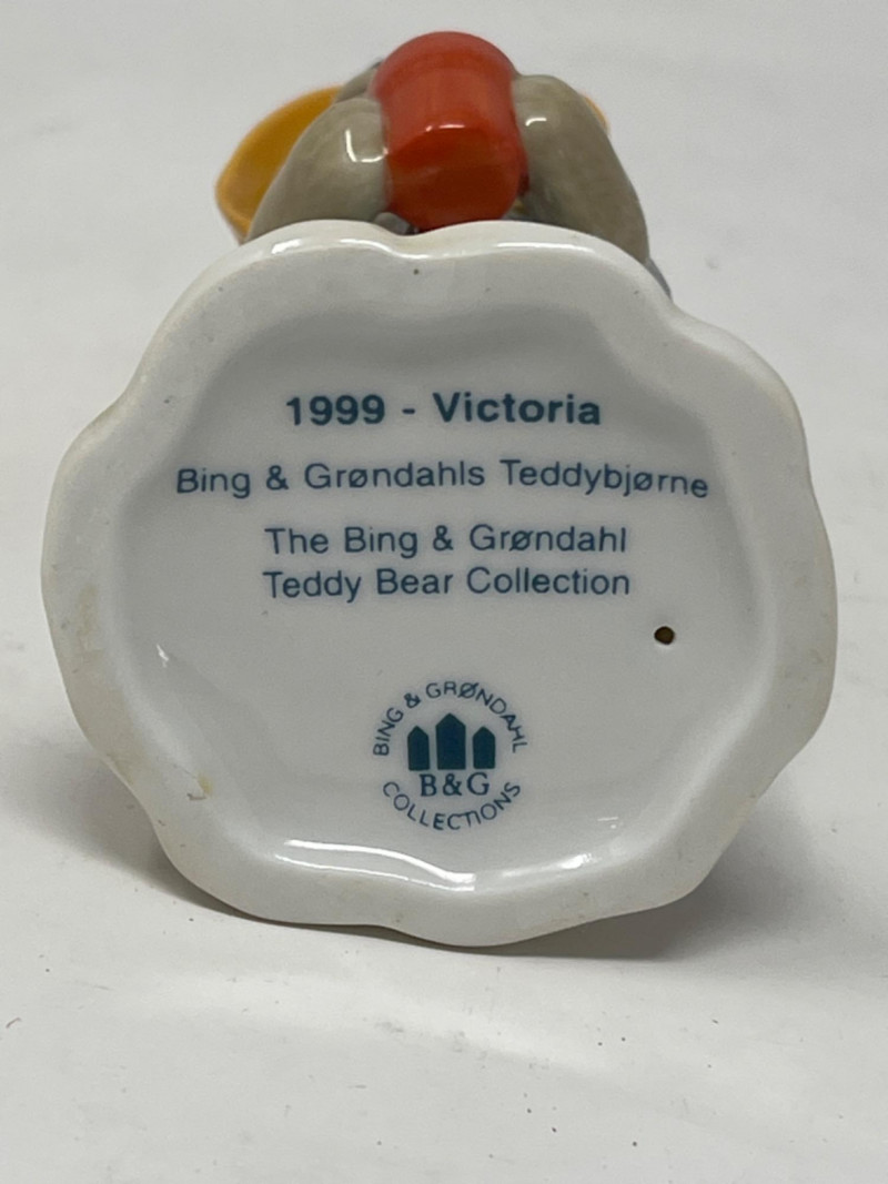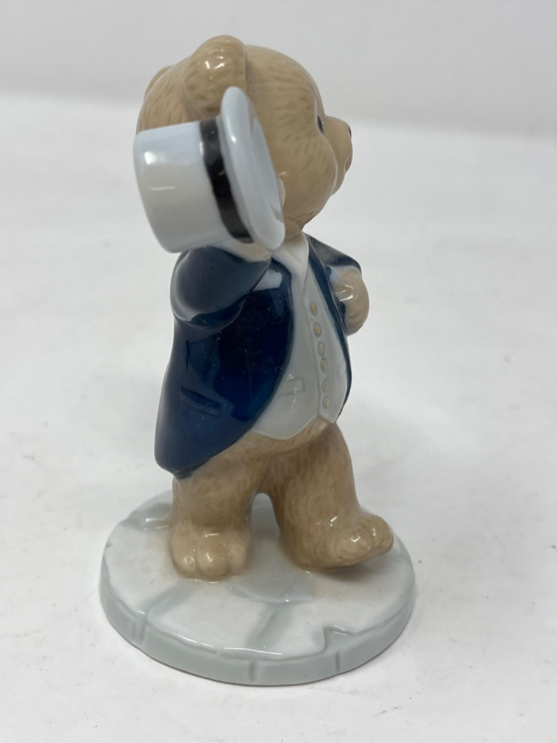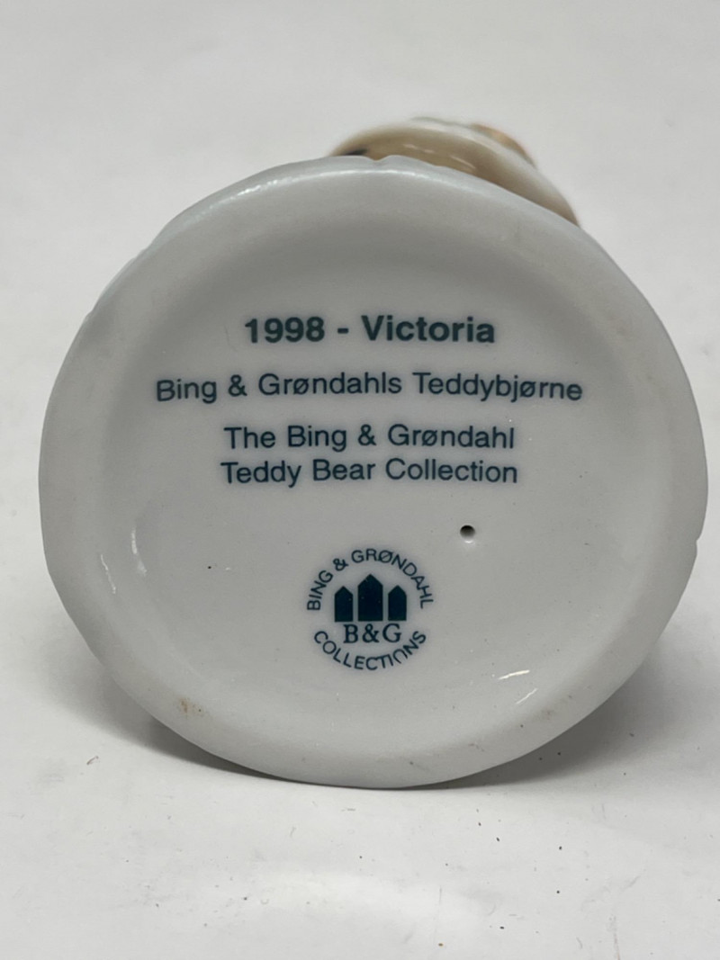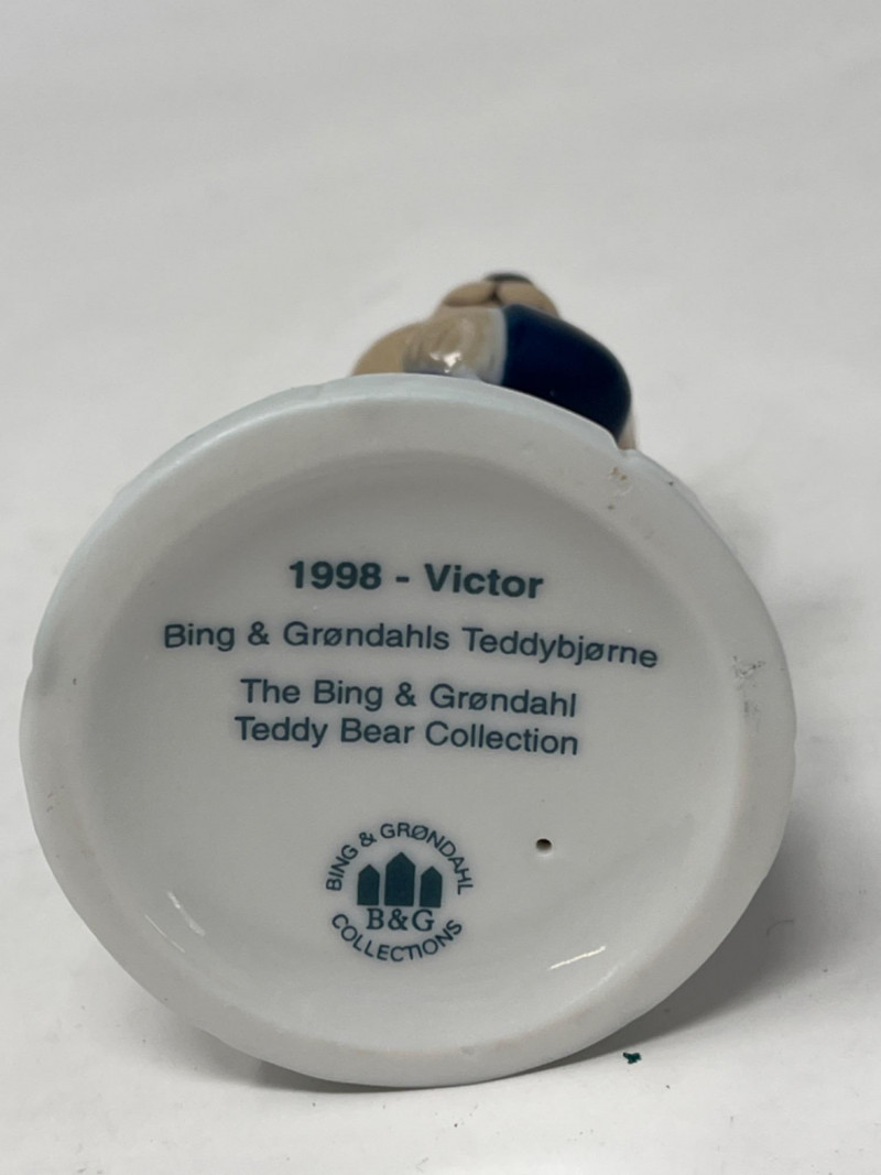 (3) Bing & Grøndahl Collection Bears & a Vintage Goebel Teddy Bear The bear is wearing a yellow sun bonnet and a blue apron, holding a red jar. 2”x4” 1998 Victoria Annual Teddy Bear 2”x4” 1998 Annual Teddy Bear "Victor" A gentlemanly teddy bear wearing a blue cloak and high hat and carrying a cane. 2”x4” Porcelain teddy bear with hands of hips. Speckled brown with a glazed finish. Goebel marking on the bottom of the feet. 2.5”x1.5”x4”