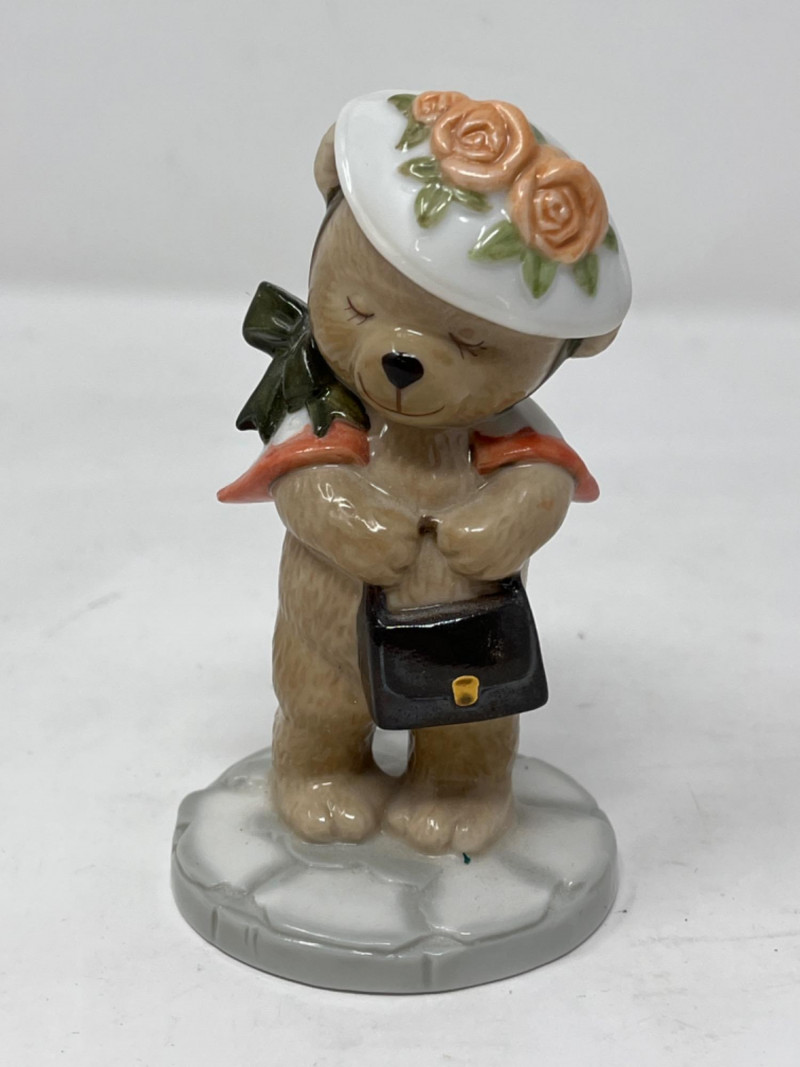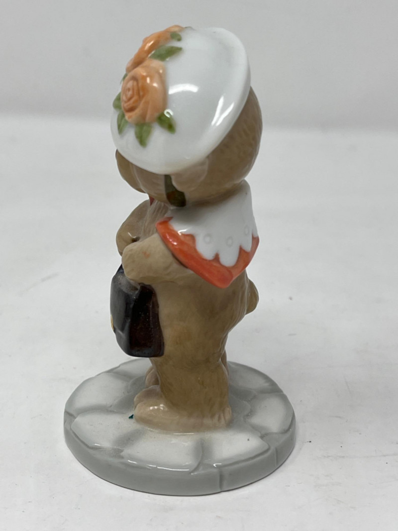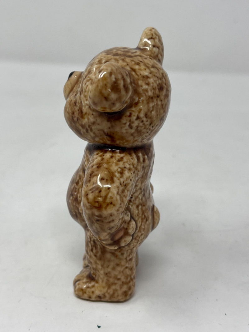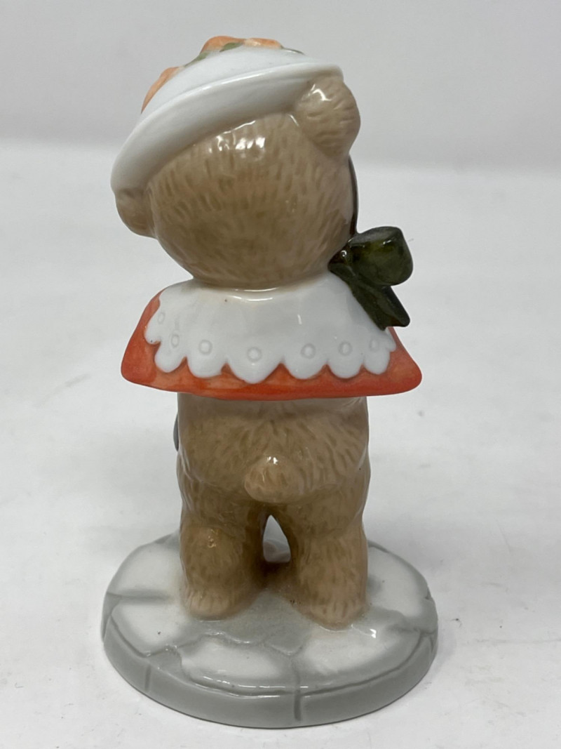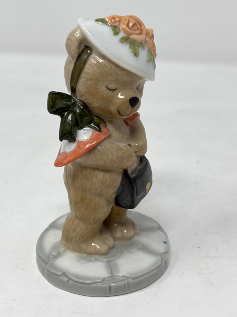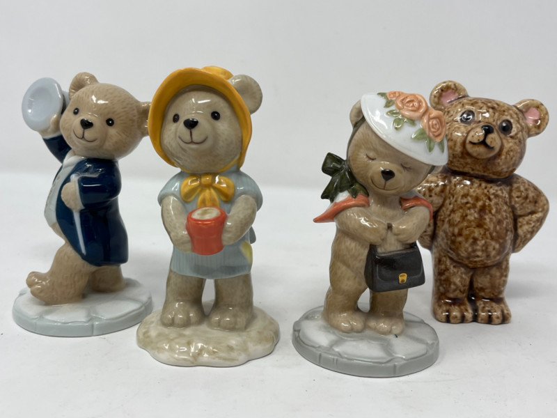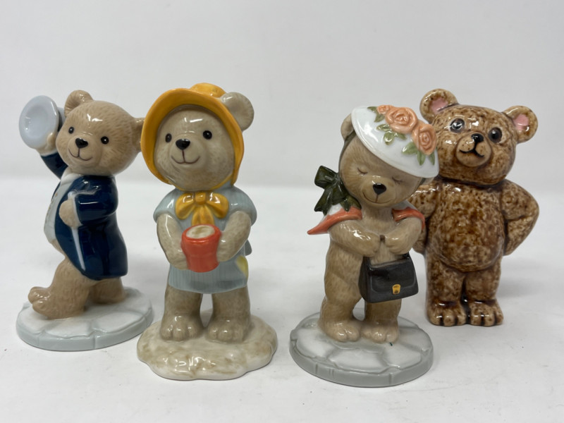 (3) Bing & Grøndahl Collection Bears & a Vintage Goebel Teddy Bear The bear is wearing a yellow sun bonnet and a blue apron, holding a red jar. 2”x4” 1998 Victoria Annual Teddy Bear 2”x4” 1998 Annual Teddy Bear "Victor" A gentlemanly teddy bear wearing a blue cloak and high hat and carrying a cane. 2”x4” Porcelain teddy bear with hands of hips. Speckled brown with a glazed finish. Goebel marking on the bottom of the feet. 2.5”x1.5”x4”