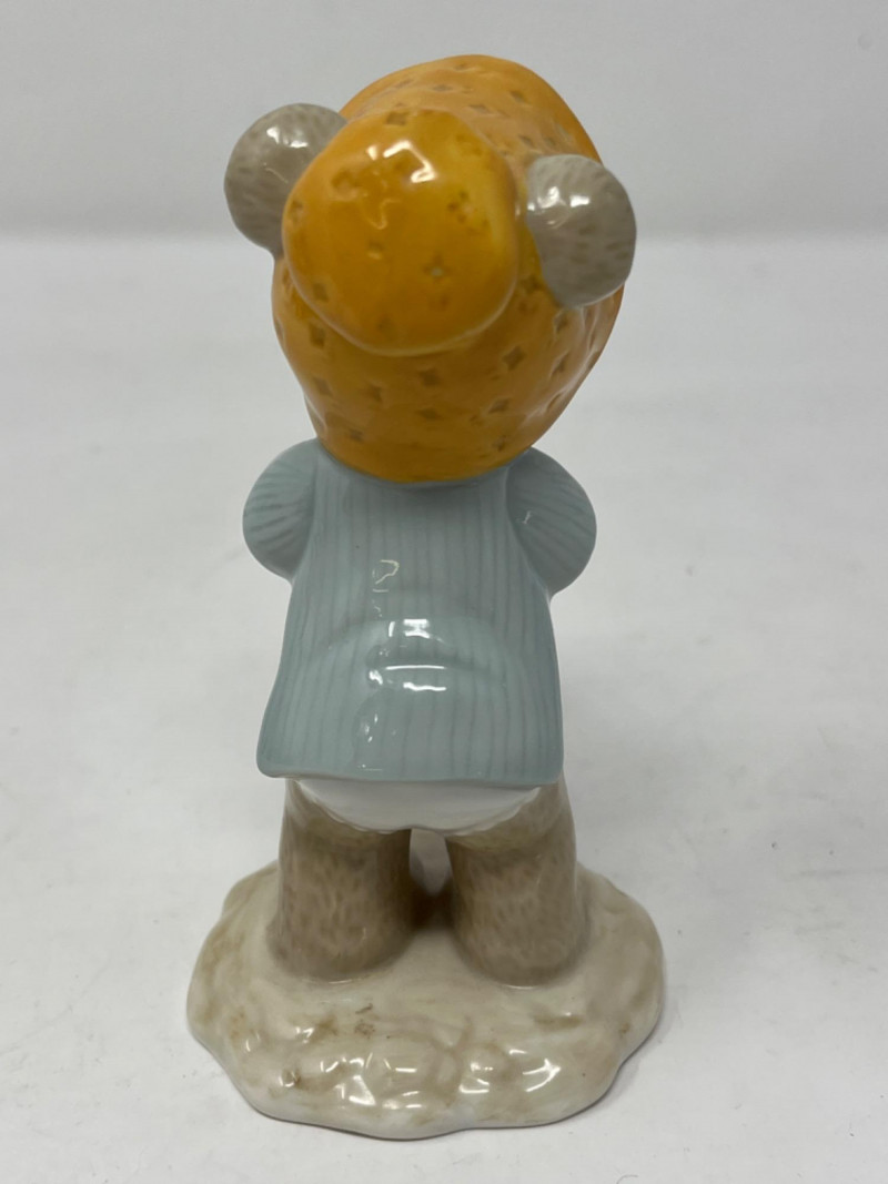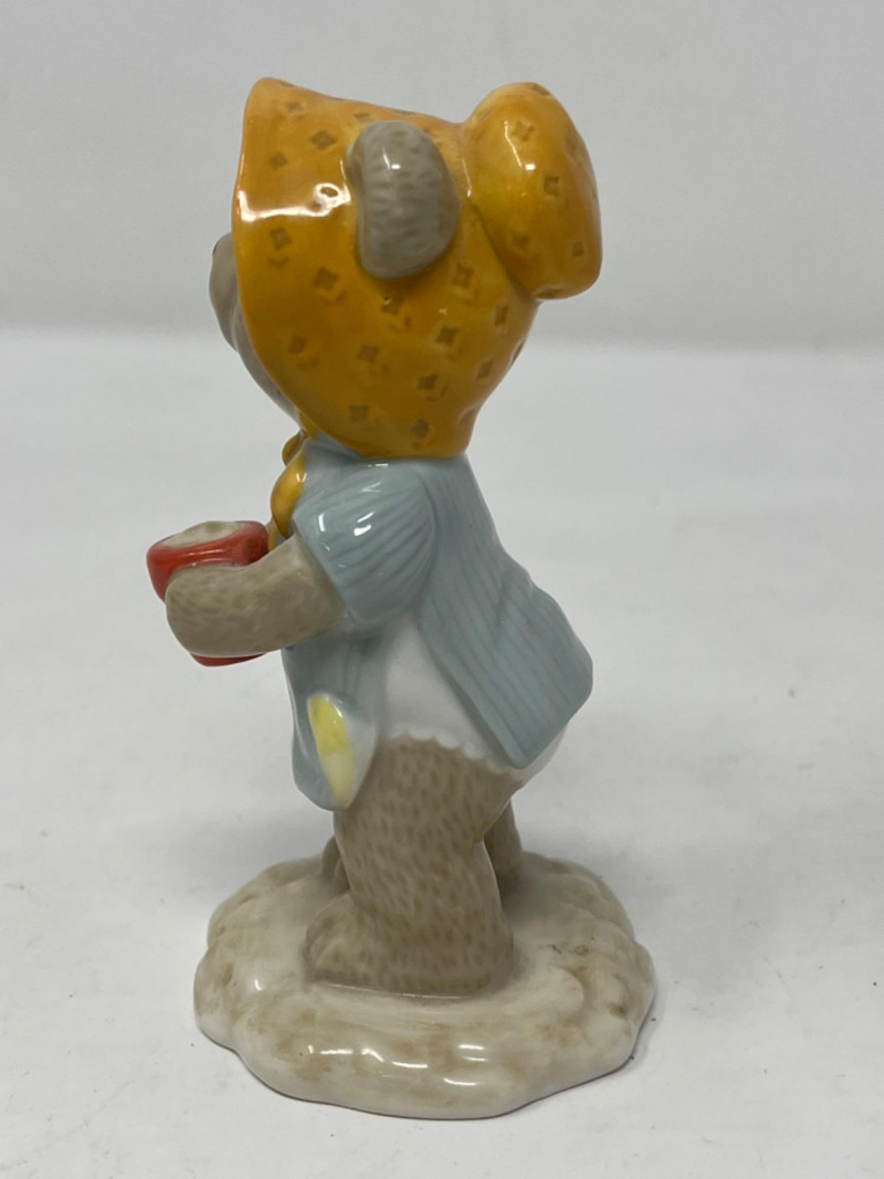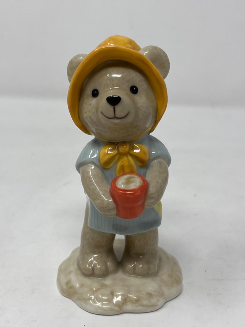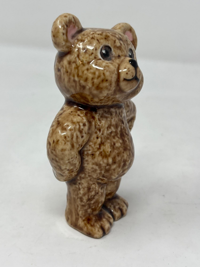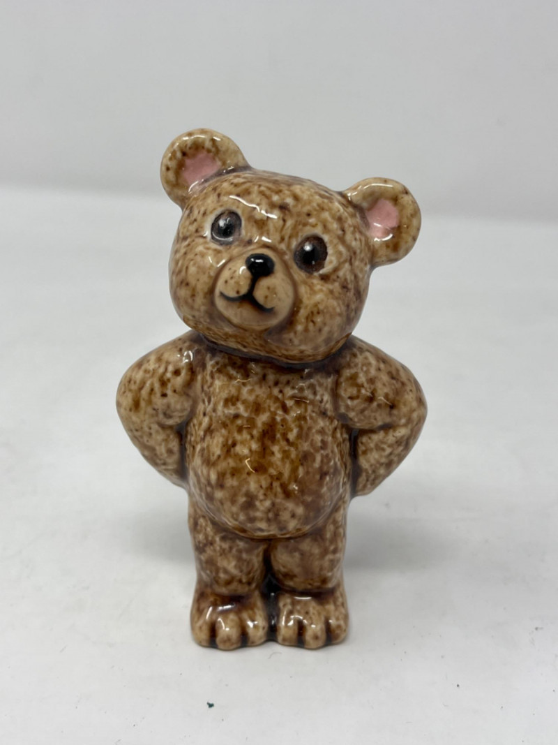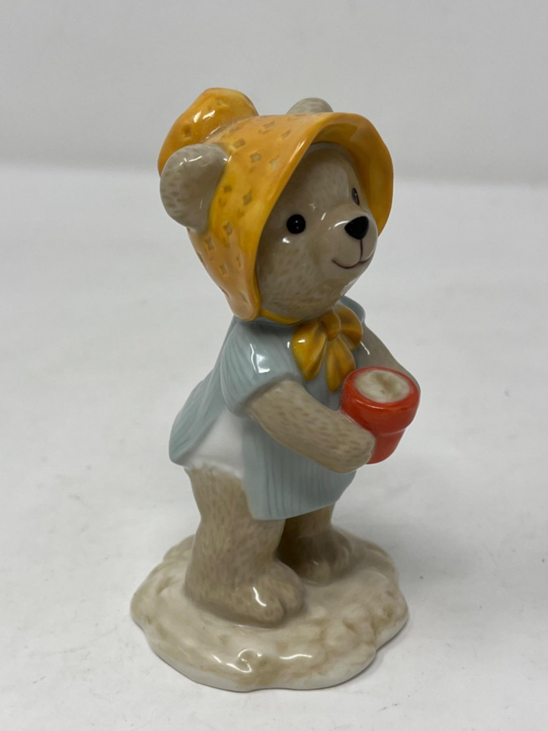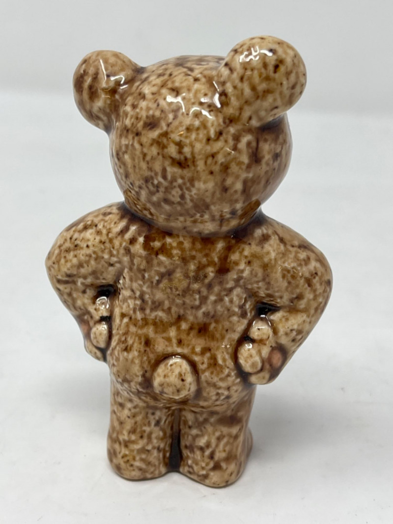 (3) Bing & Grøndahl Collection Bears & a Vintage Goebel Teddy Bear The bear is wearing a yellow sun bonnet and a blue apron, holding a red jar. 2”x4” 1998 Victoria Annual Teddy Bear 2”x4” 1998 Annual Teddy Bear "Victor" A gentlemanly teddy bear wearing a blue cloak and high hat and carrying a cane. 2”x4” Porcelain teddy bear with hands of hips. Speckled brown with a glazed finish. Goebel marking on the bottom of the feet. 2.5”x1.5”x4”