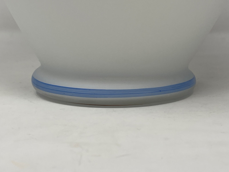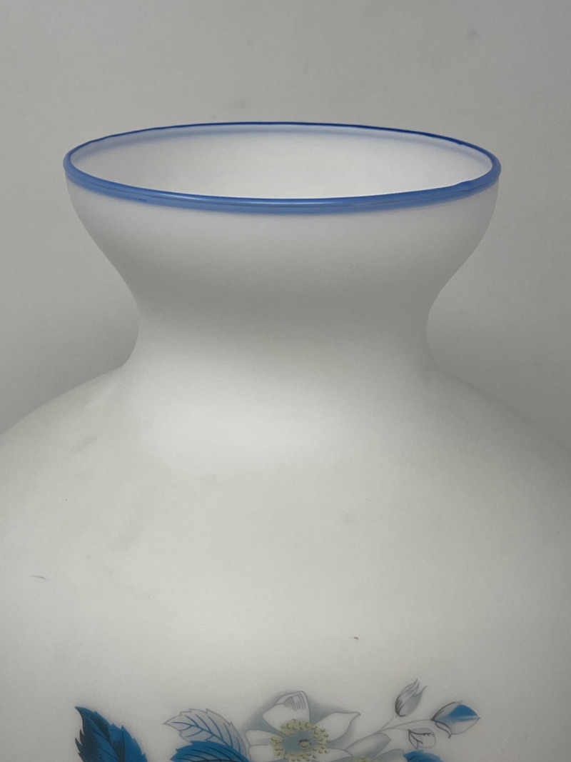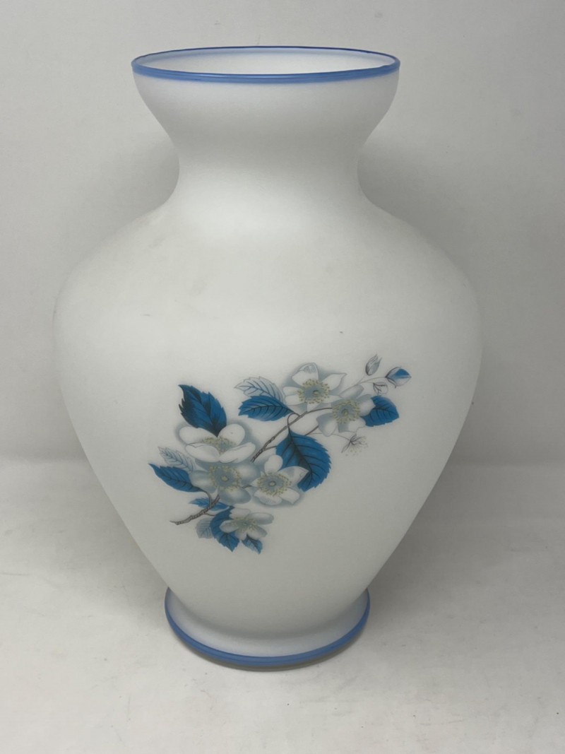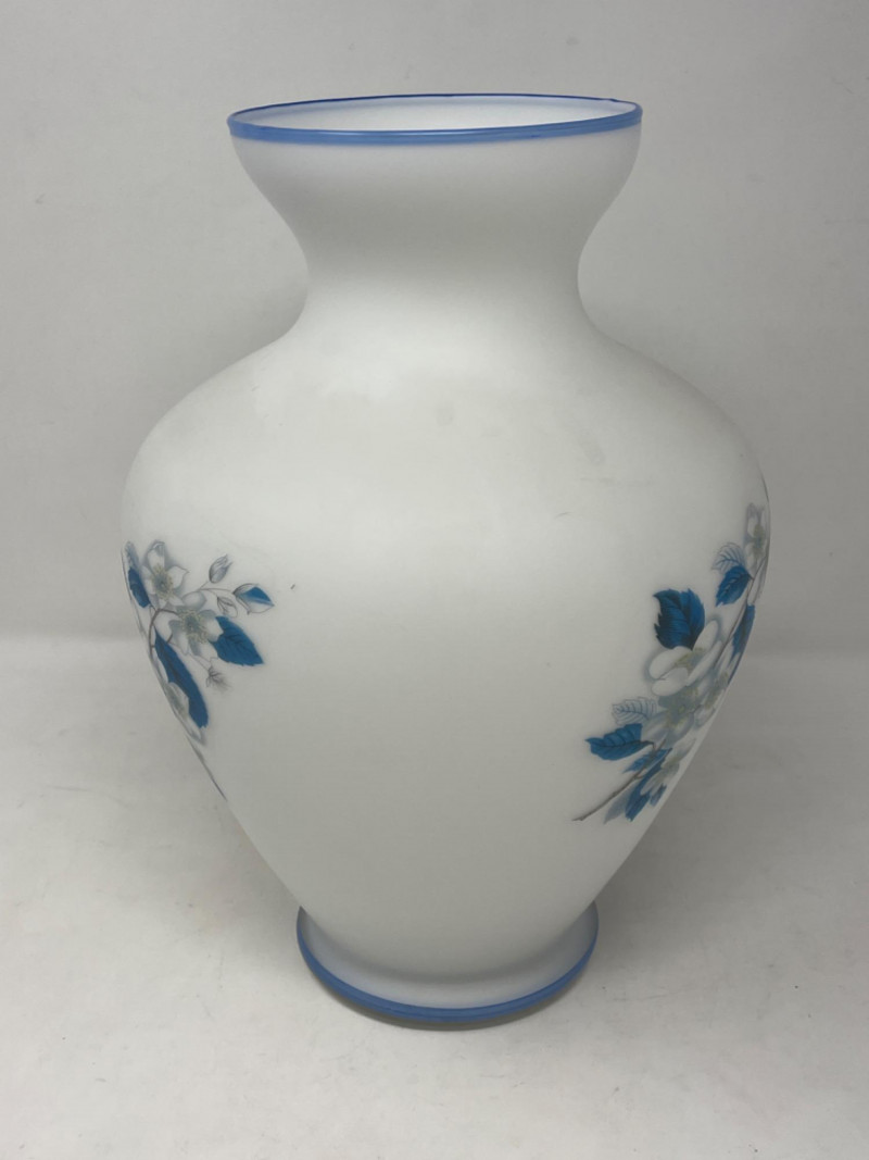 Vintage Italian Satin Frosted White Glass Vase Three floral motifs around the vase. The rim and base are finished with a blue stripe. 9”x12”