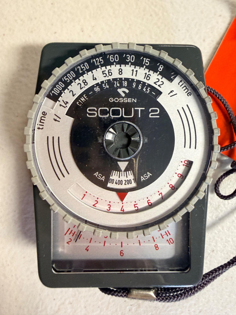 Gossen Scout 2 Photographic Exposure Meter Gossen Scout 2, a vintage handheld analog photographic exposure meter. Measures both incident and reflected light to determine camera settings. Compact design made in West Germany, featuring scales for aperture, shutter speed, and film speed (ASA).