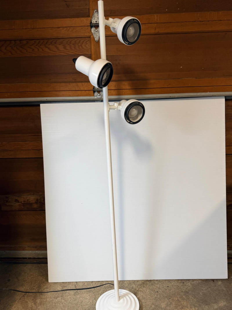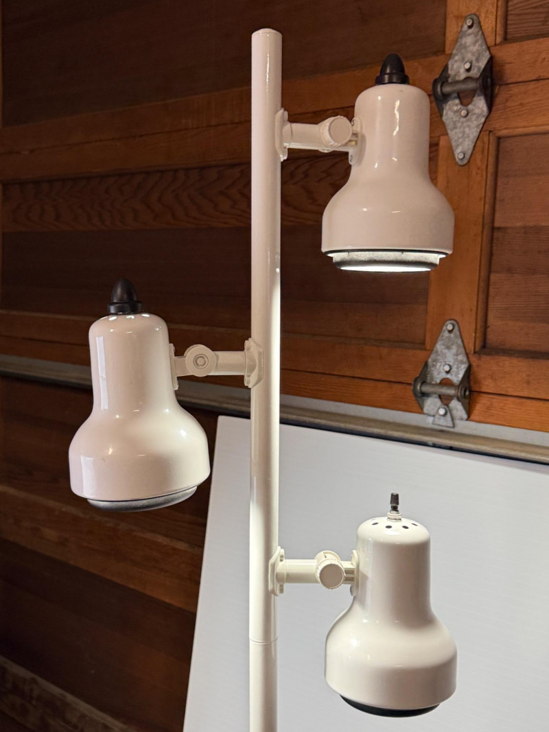 Adjustable 3-Light White Metal Spotlight Floor Lamp 3 Heads rotate and swivel for full adjustment to your needs. 13”x10”64.5” with (3)5” lights