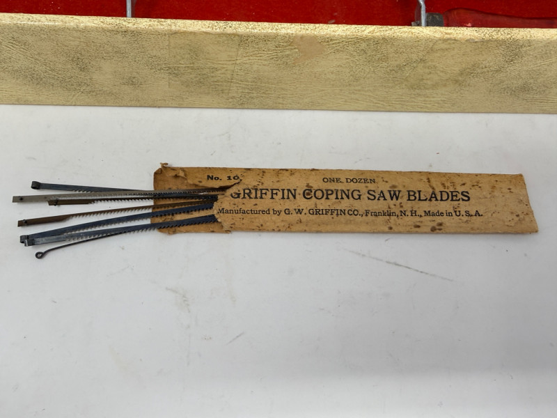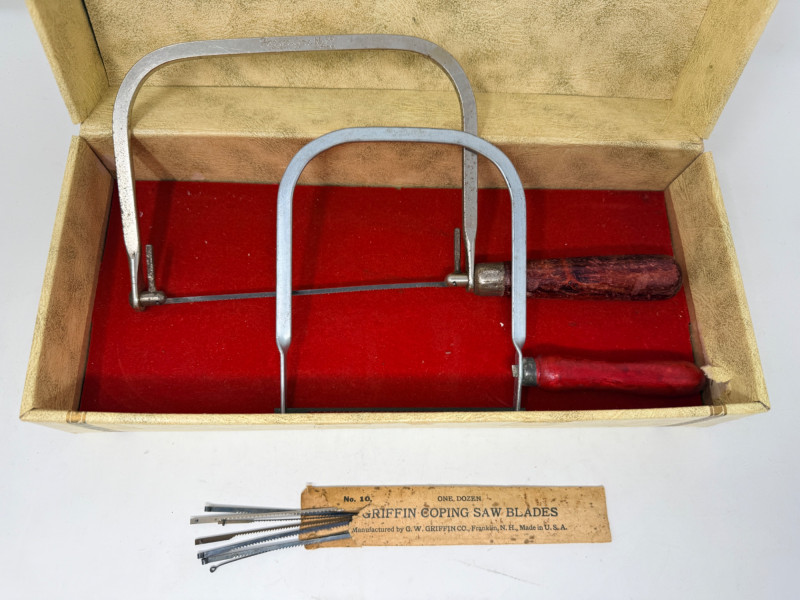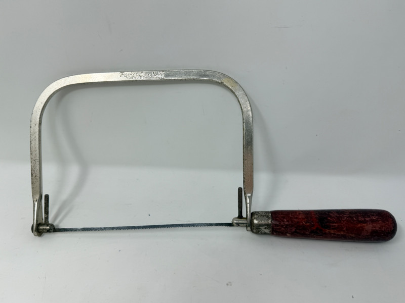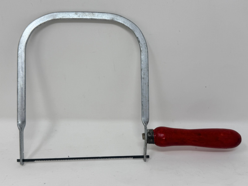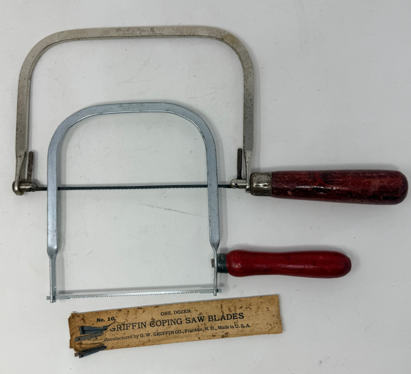 Vintage Parker Line Wood Handle Coping Saws & Blades. Parker Line No55 Red wood handle coping saw is 12” Smaller 9” unbranded red wood handle saw with extra blades. The Woodwright's Shop Hardcover book included.