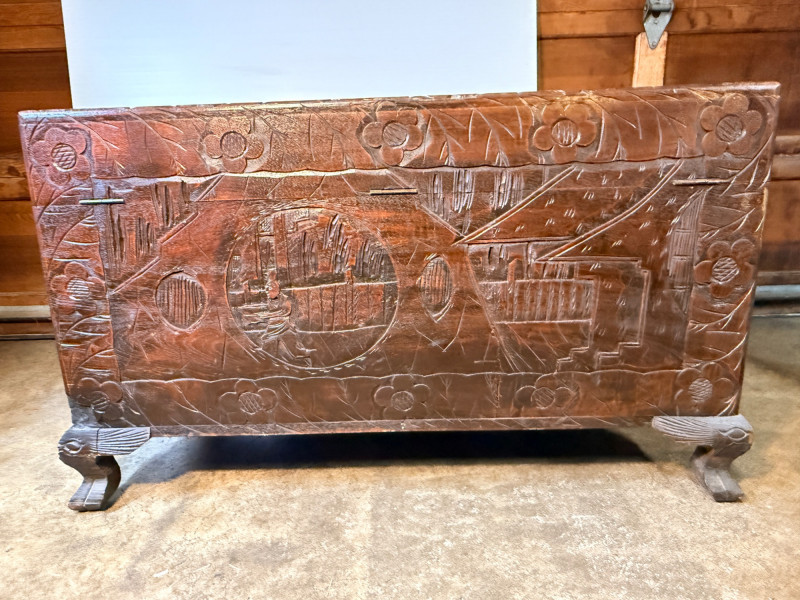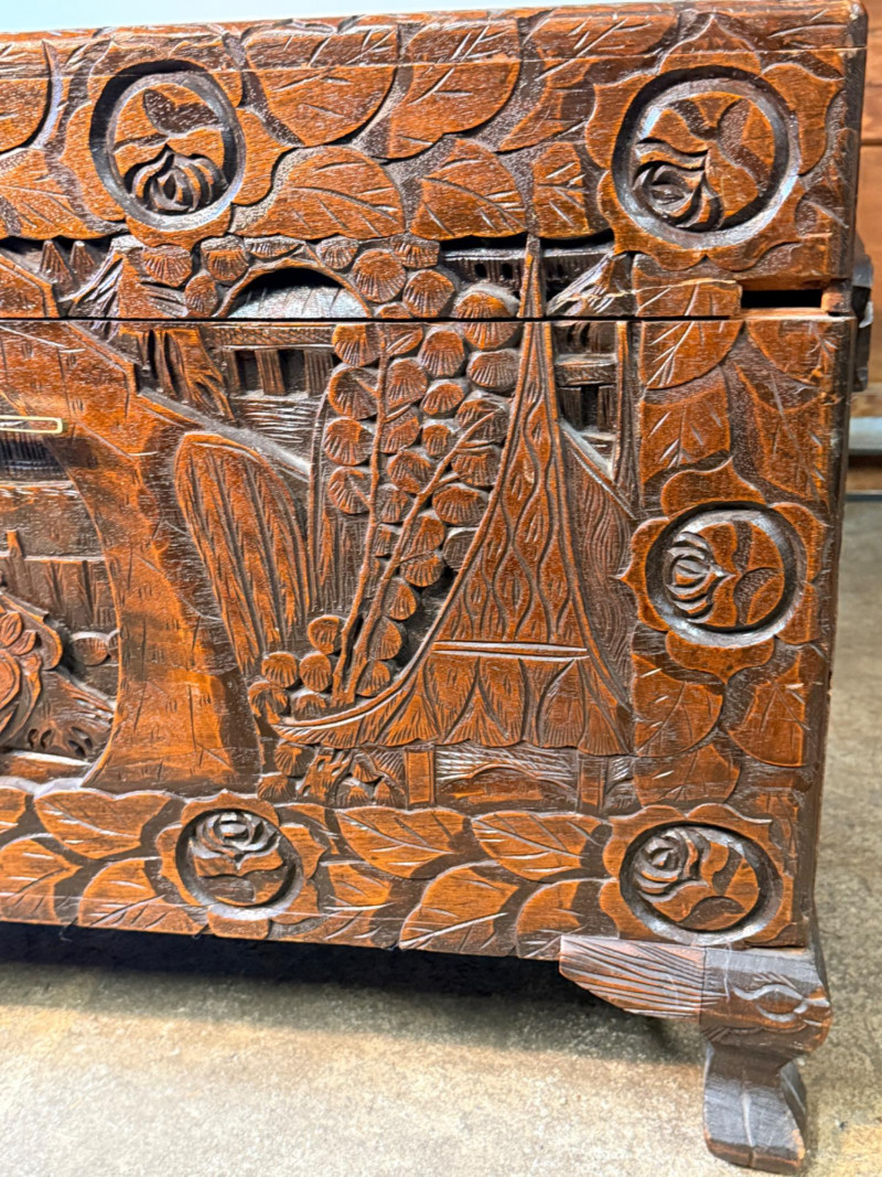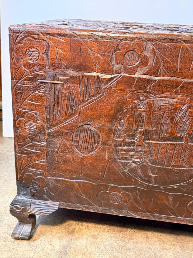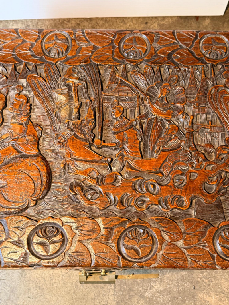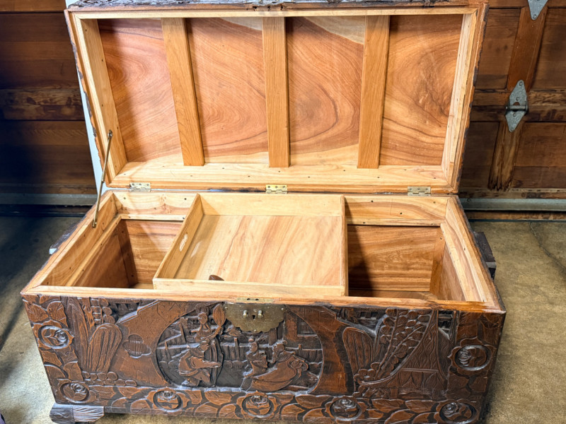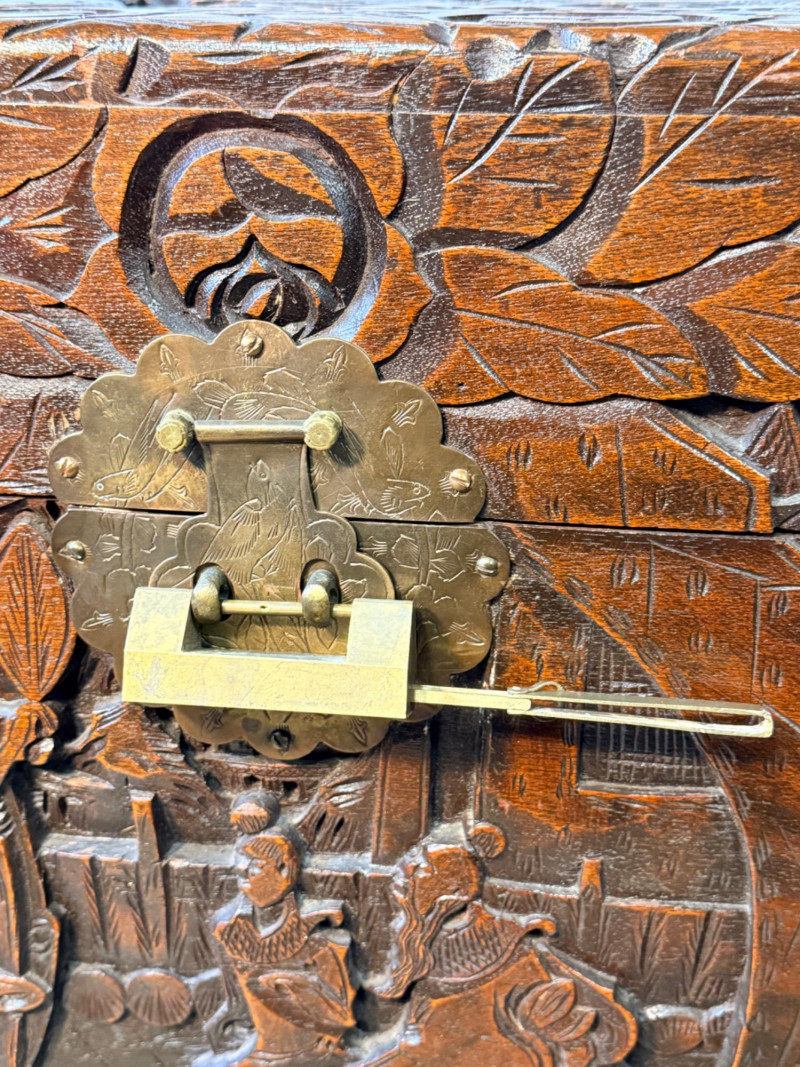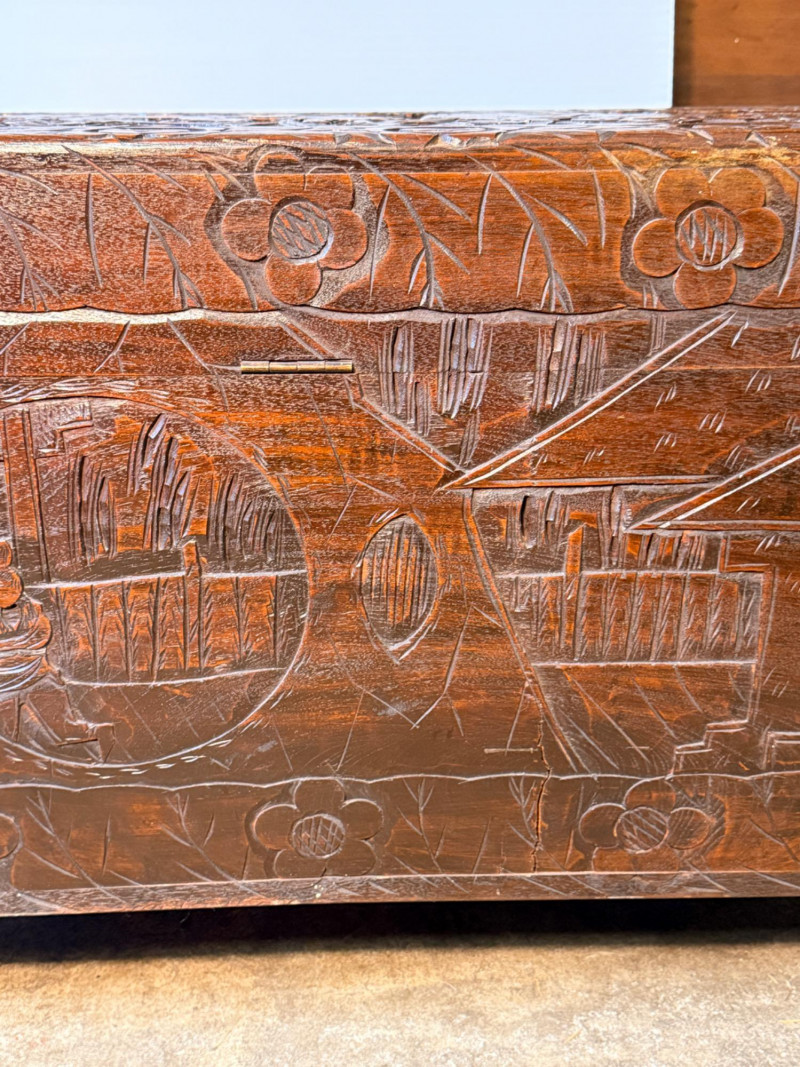 Antique Chinese hand-carved camphor wood chest, a type of storage trunk traditionally used for holding blankets, linens, or as a dowry chest. Constructed from solid camphor wood, which is prized for its natural, long-lasting scent that acts as a powerful deterrent against moths and other insects. These chests are characterized by intricate relief carvings on the front, top, and sometimes sides. It has river scenes with junks (boats), pagodas, pine trees, and floral patterns. The inside has a spacious main compartment, accompanied by a small lift-out tray and decorative brass hasp or latch for closure. 38.5”x19”x23”