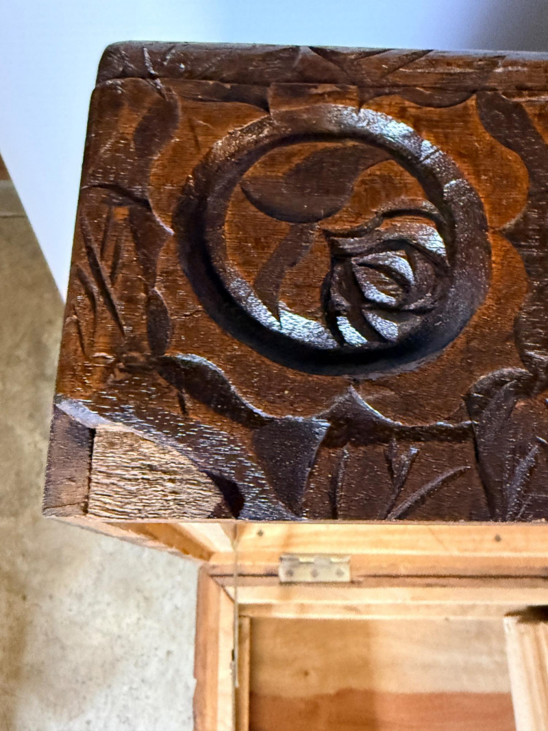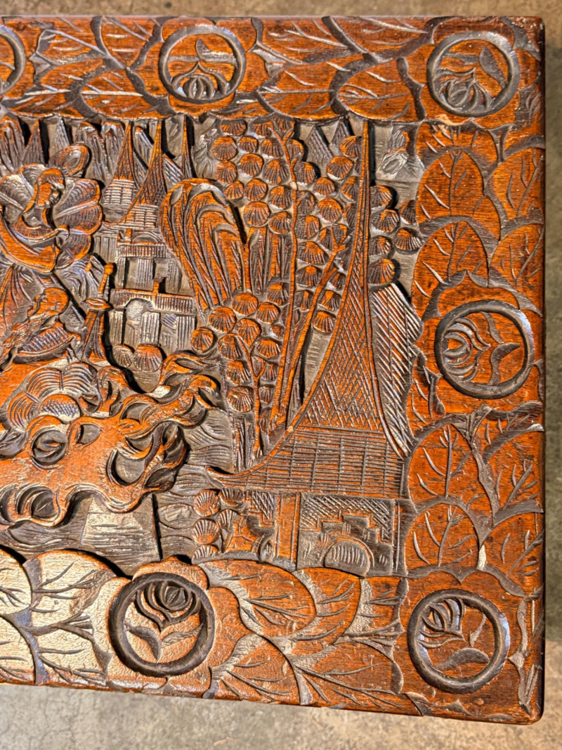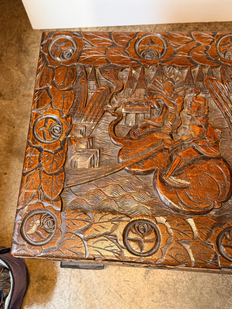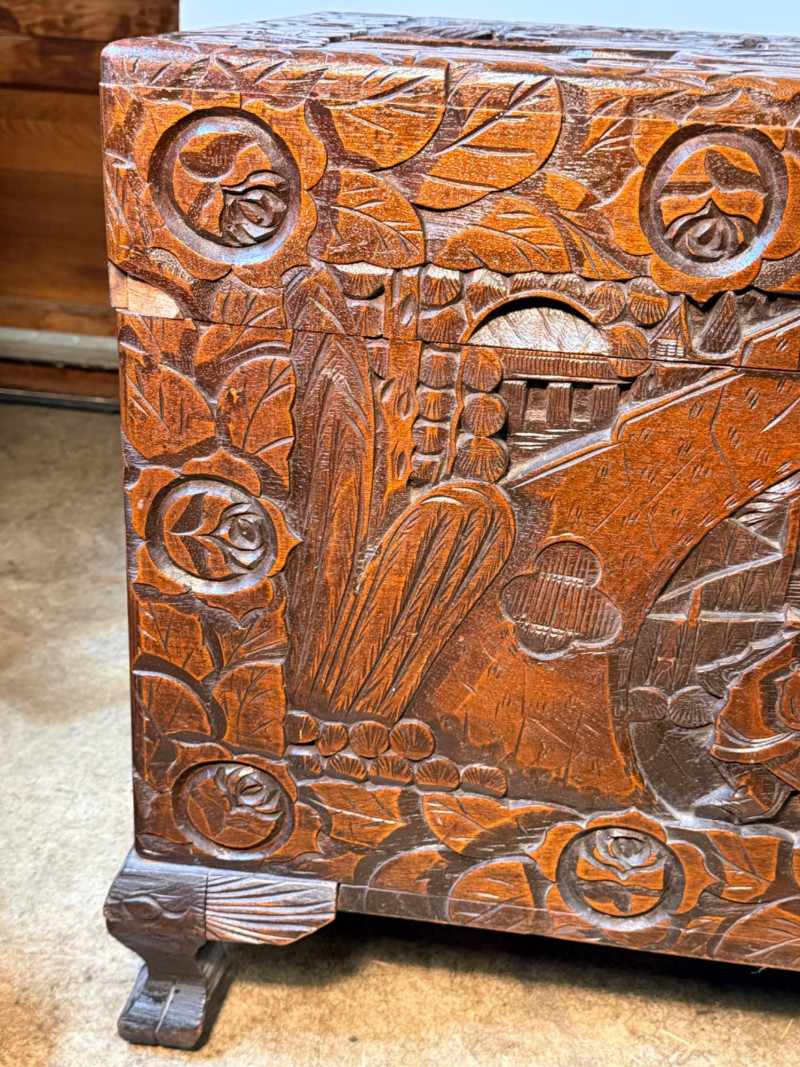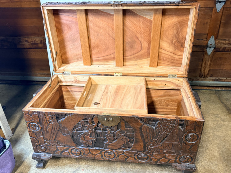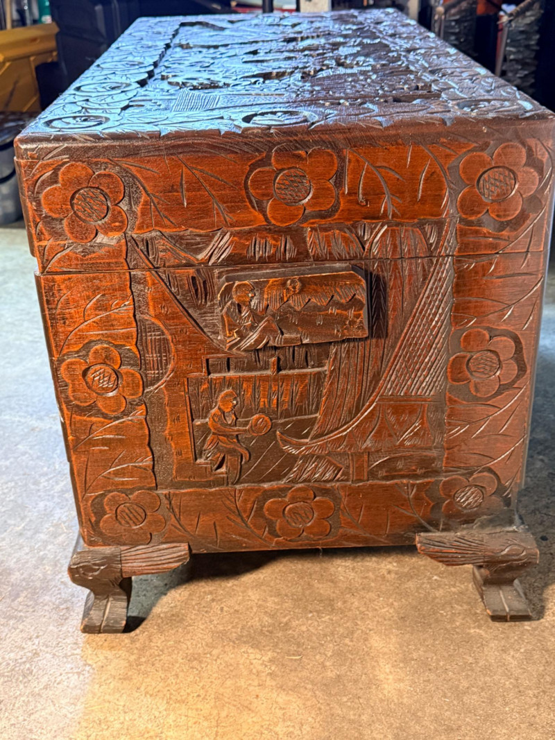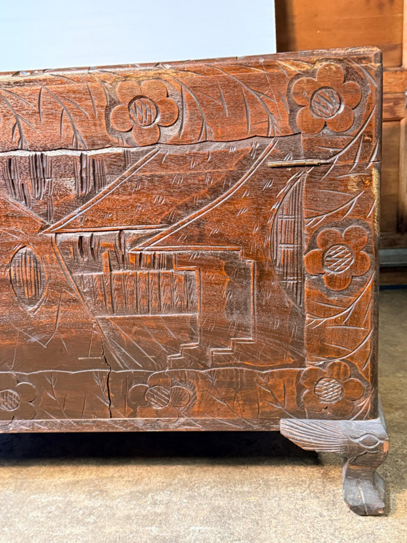Antique Chinese hand-carved camphor wood chest, a type of storage trunk traditionally used for holding blankets, linens, or as a dowry chest. Constructed from solid camphor wood, which is prized for its natural, long-lasting scent that acts as a powerful deterrent against moths and other insects. These chests are characterized by intricate relief carvings on the front, top, and sometimes sides. It has river scenes with junks (boats), pagodas, pine trees, and floral patterns. The inside has a spacious main compartment, accompanied by a small lift-out tray and decorative brass hasp or latch for closure. 38.5”x19”x23”