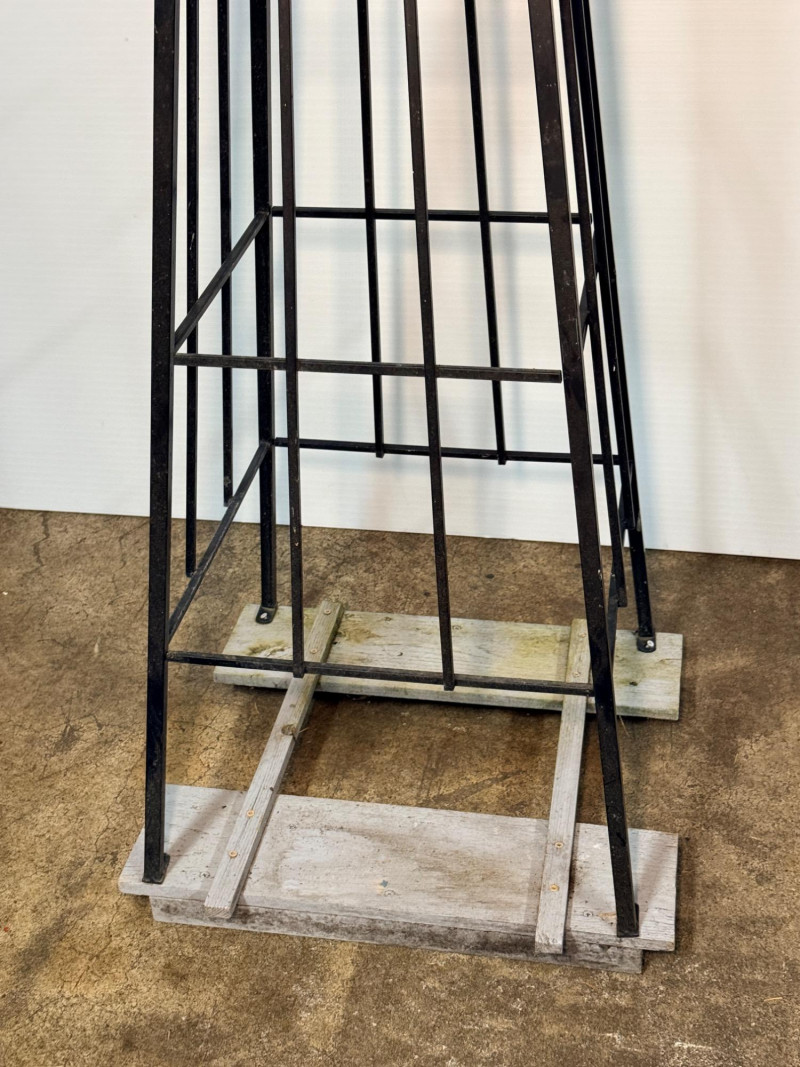 Windy Weather Metal Yard Art All metal construction mounted to a wood base. Base measures 20”x18” and 75” tall.