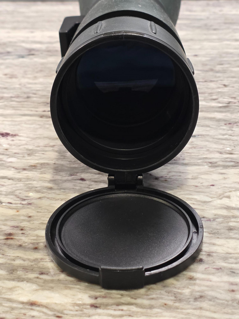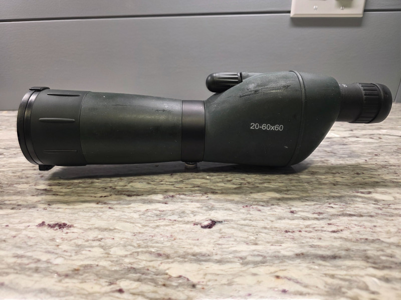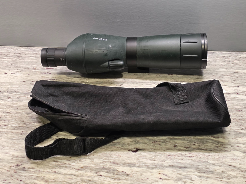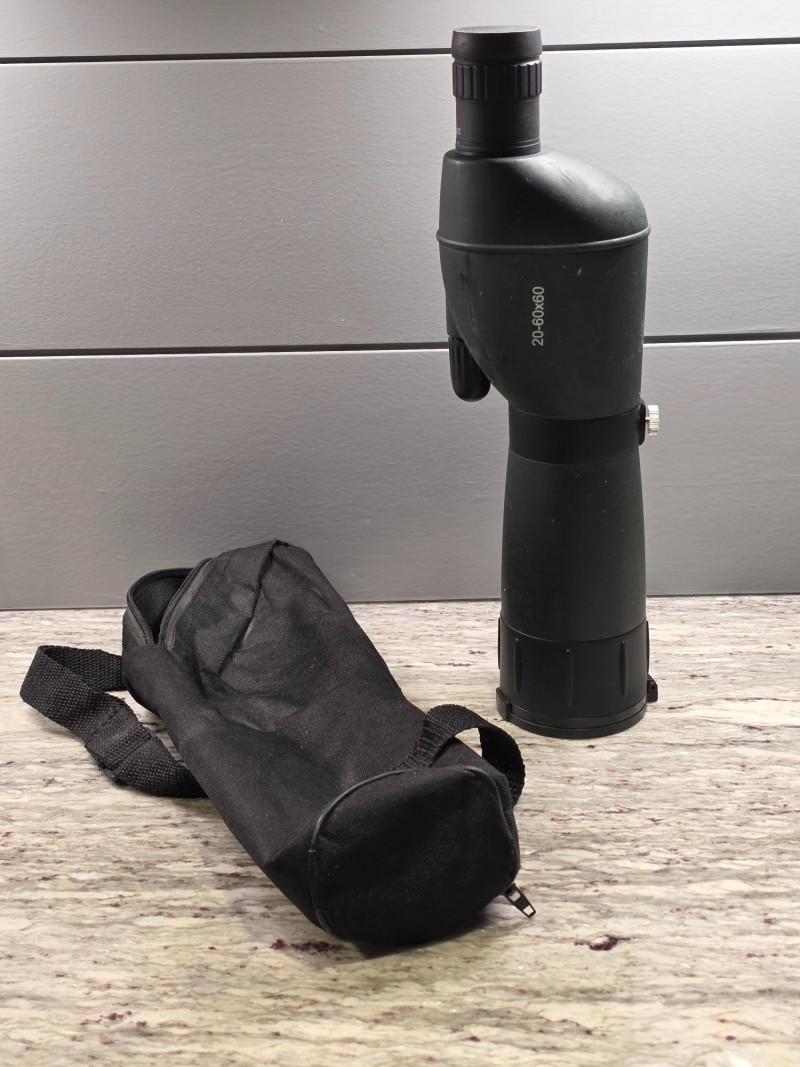 Barska Colorado 20-60x60 Spotting Scope & Zipper Case Offers variable zoom from 20x to 60x, allowing for both wide landscape scanning and focused, detailed observation. Features a 60mm objective lens to capture light for brighter views. It is an angled spotting scope, which is generally more comfortable for prolonged observation or viewing objects at higher elevations. The Colorado series features waterproof and fogproof construction with a rugged, weather-sealed housing. It utilizes BK-7 Porro prisms and fully coated optics to deliver high-contrast images Rubberized coating on body of scope has become tacky Includes black nylon zipper case 14.5"L x 4"W