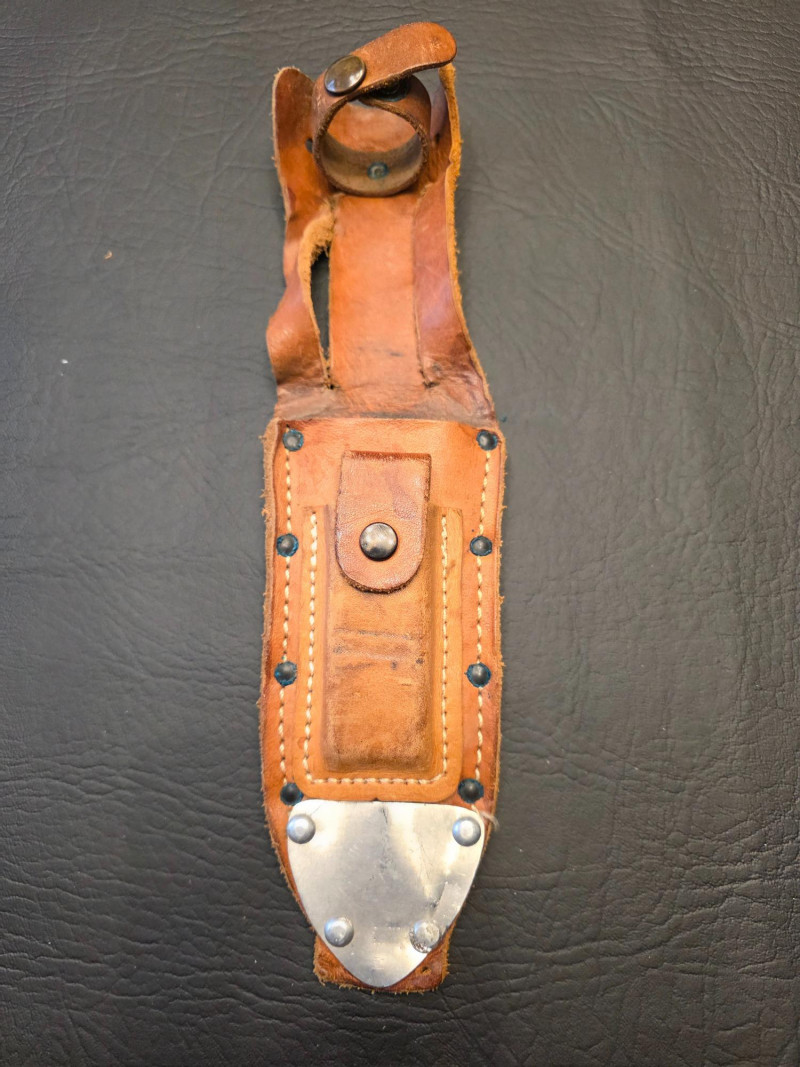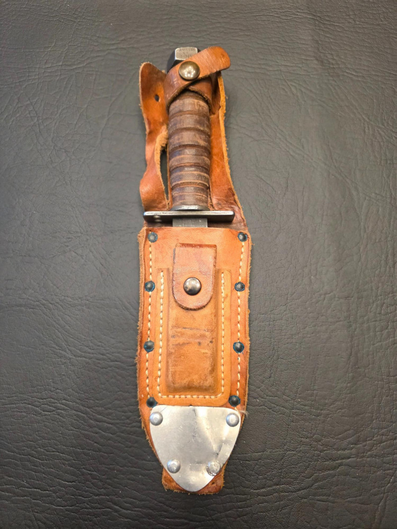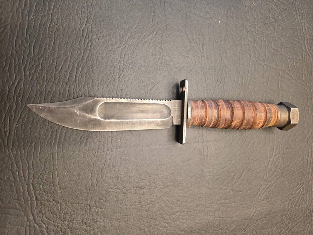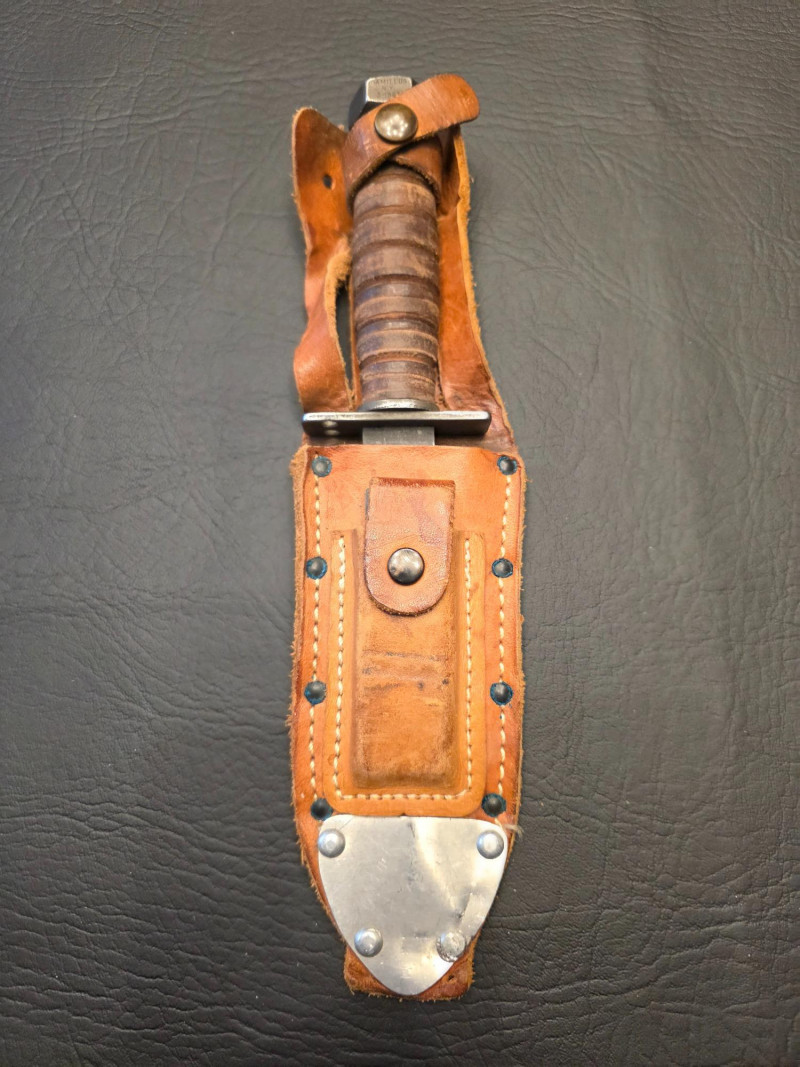 1967 Camillus Vietnam-Era U.S. Military Jet Pilot Survival Knife (PSK) Specialized tool designed for aircrews to use in escape and survival situations. This specific model was widely produced by Camillus in New York Blade Design: Features a 5-inch carbon steel blade with a clip-point tip and a saw-tooth spine designed for cutting through aircraft aluminum. Handle: Constructed with stacked leather washers, providing a secure grip even when wet or bloody. Pommel: A heavy, hexagonal steel butt cap (pommel) that can be used for hammering. Markings: These knives are often stamped on the blade ricasso or the pommel with the manufacturer's name ("Camillus N.Y.") and a date of manufacture ("5-1967") Includes what I believe is the original leather sheath with sharpening stone pocket & stone