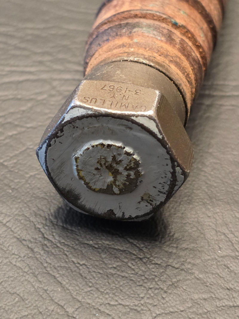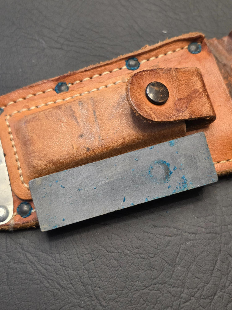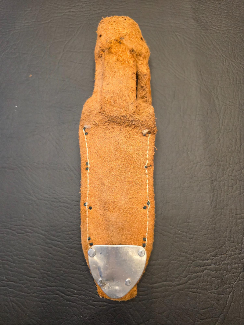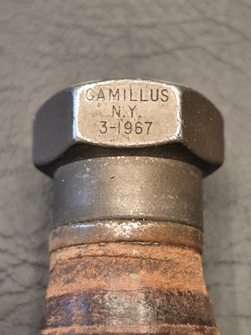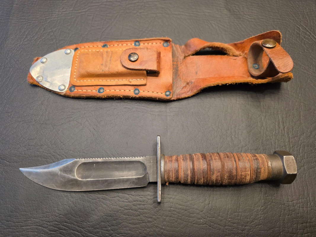 1967 Camillus Vietnam-Era U.S. Military Jet Pilot Survival Knife (PSK) Specialized tool designed for aircrews to use in escape and survival situations. This specific model was widely produced by Camillus in New York Blade Design: Features a 5-inch carbon steel blade with a clip-point tip and a saw-tooth spine designed for cutting through aircraft aluminum. Handle: Constructed with stacked leather washers, providing a secure grip even when wet or bloody. Pommel: A heavy, hexagonal steel butt cap (pommel) that can be used for hammering. Markings: These knives are often stamped on the blade ricasso or the pommel with the manufacturer's name ("Camillus N.Y.") and a date of manufacture ("5-1967") Includes what I believe is the original leather sheath with sharpening stone pocket & stone