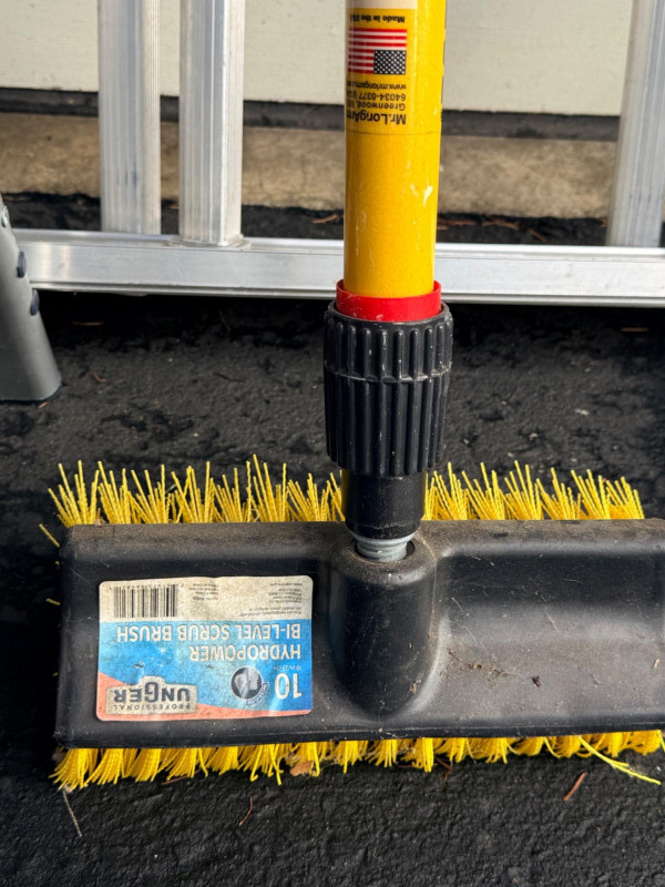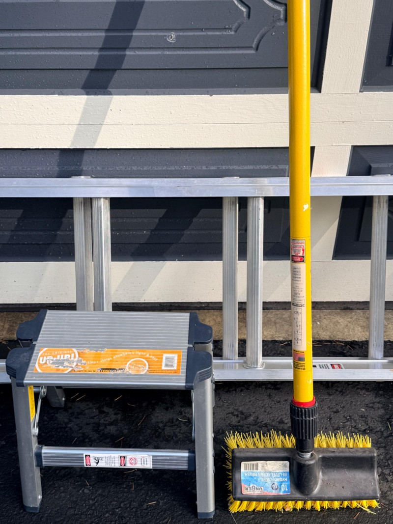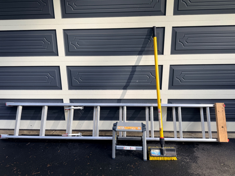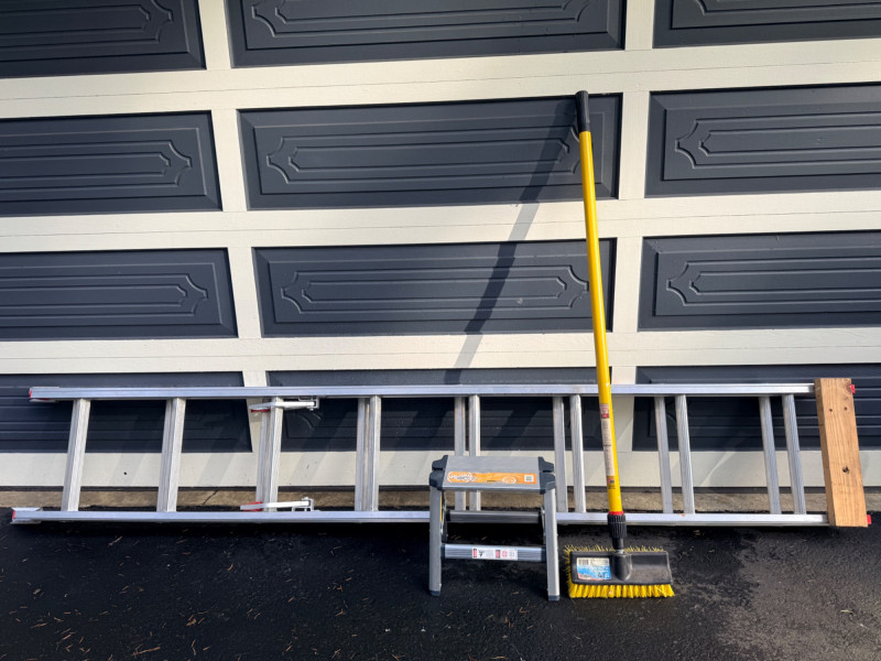 Werner Saf-t-Master 16’ Aluminum Extension Ladder - Step Stool & Brush Werner 225 lb capacity aluminum extension ladder Small one step stool 10” Hydropower bi-level scrub brush with Mr Long Arm extending pole.