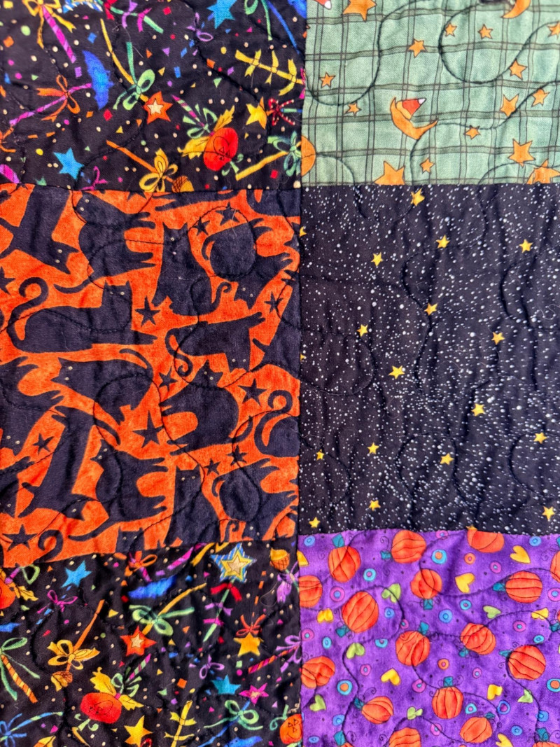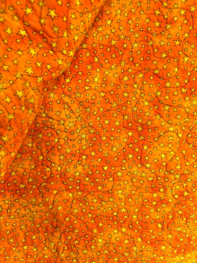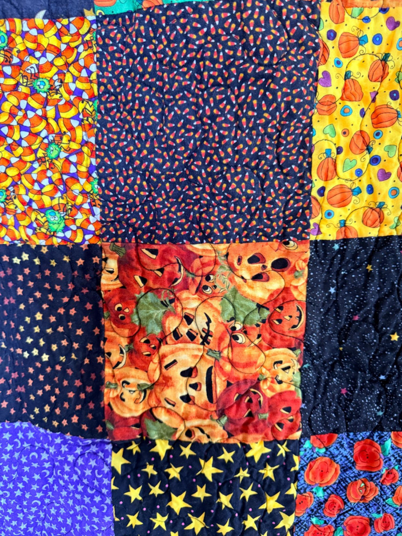 Happy Halloween #2- Fall Harvest Throw Quilt With yellow stars on orange backing Hand made by local quilter Karen Lewis in 2005 64”x56”