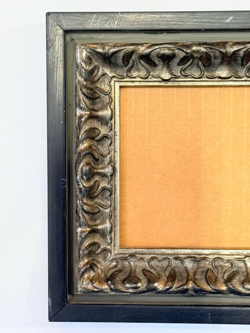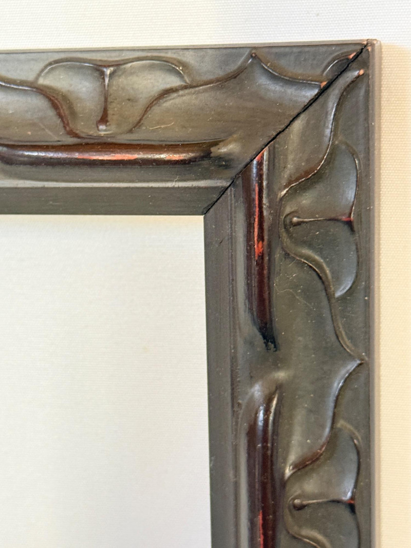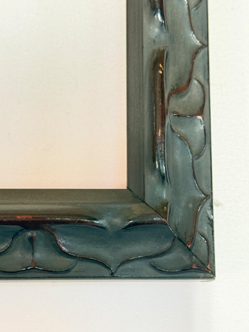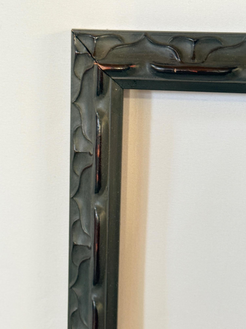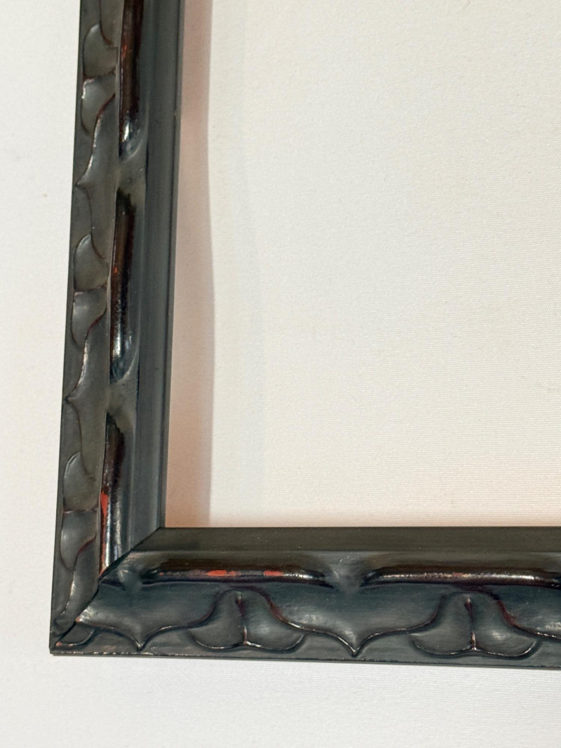 3 Wood Frames Top and bottom frames match and are square black wood with red undertones 16.5”x.75”x16.5” OD - 15”x15” inside Middle is a wood frame with painted pewter finish 12.5”x1.5”x6.5” OD Inside 9.5”x3.5”