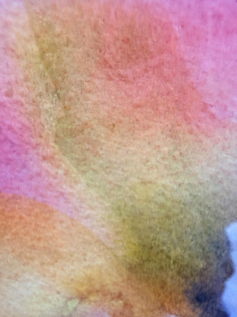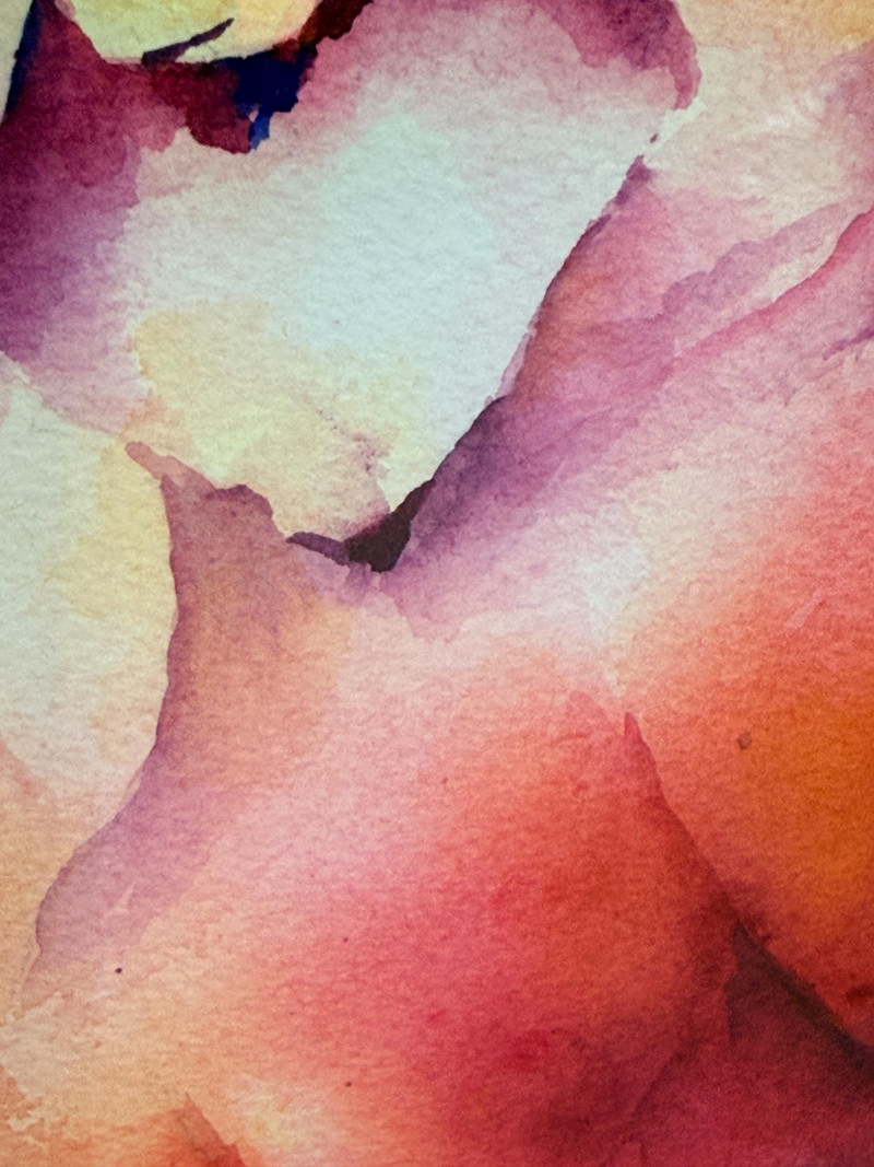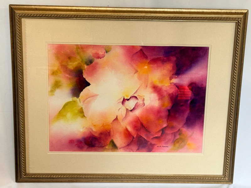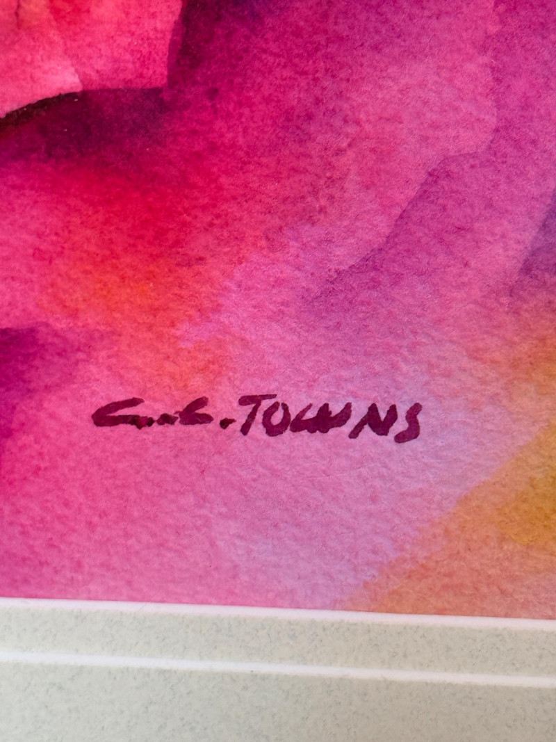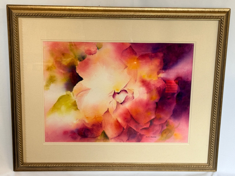 Rosamore - An Original Watercolor Signed by Artist Connie Towns Double matted in a gold wood frame under glass. The artwork features warm, vivid tones of pink, magenta, and orange. The style is characterized by soft blending and fluid wash techniques. The painting is professionally mounted and framed 30.5”x1.5”x24.75”