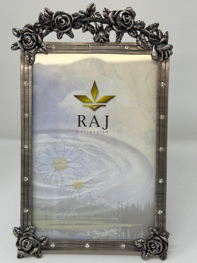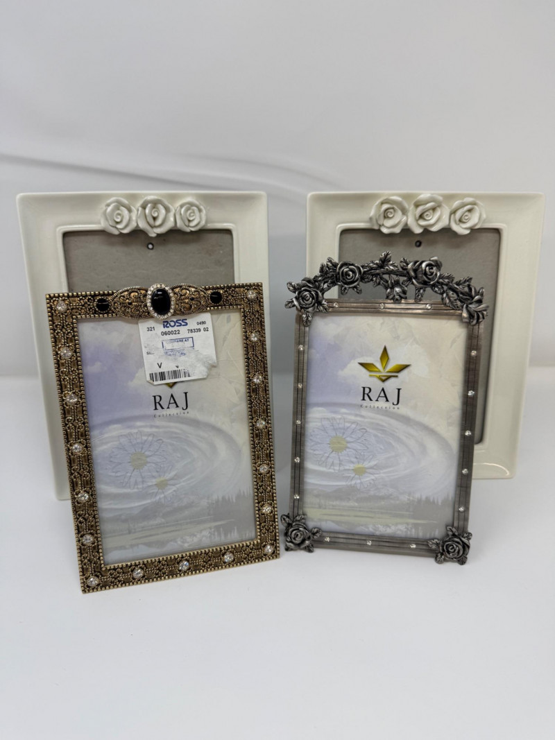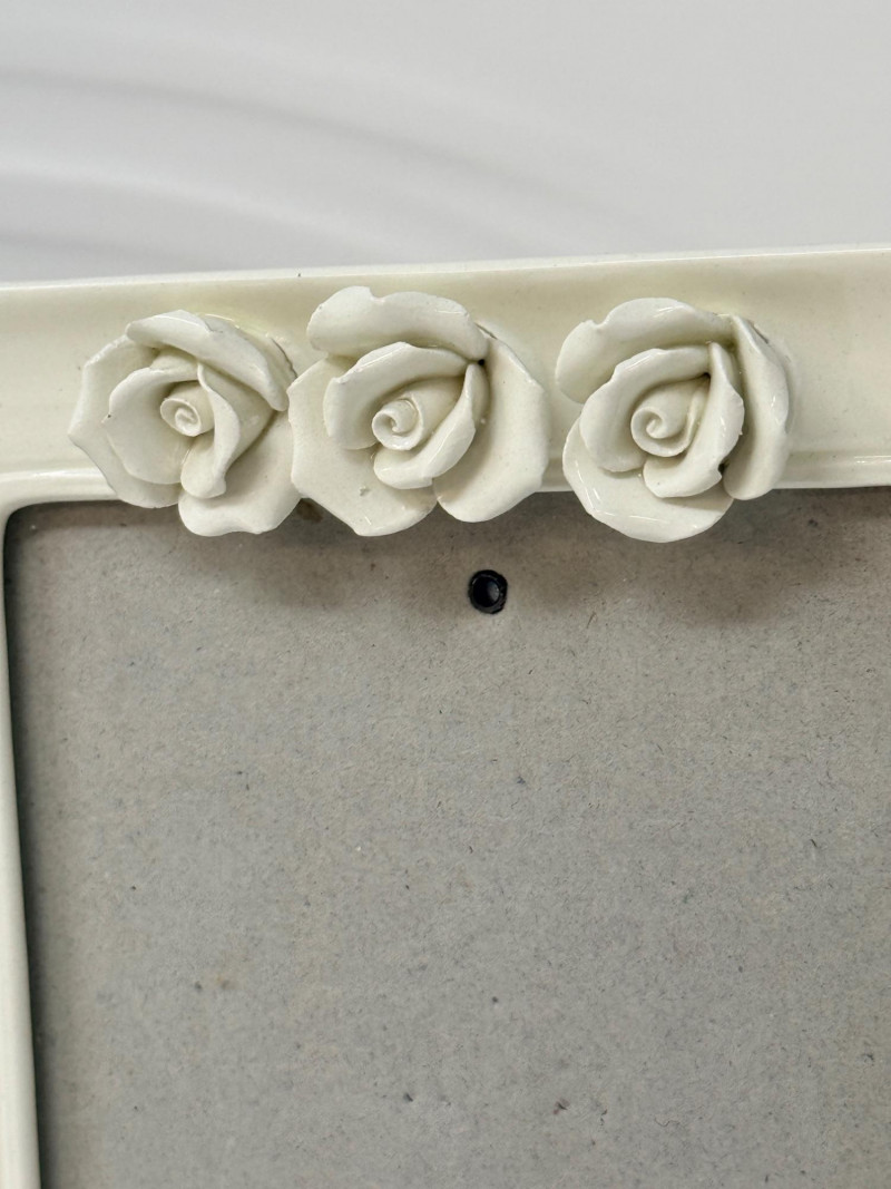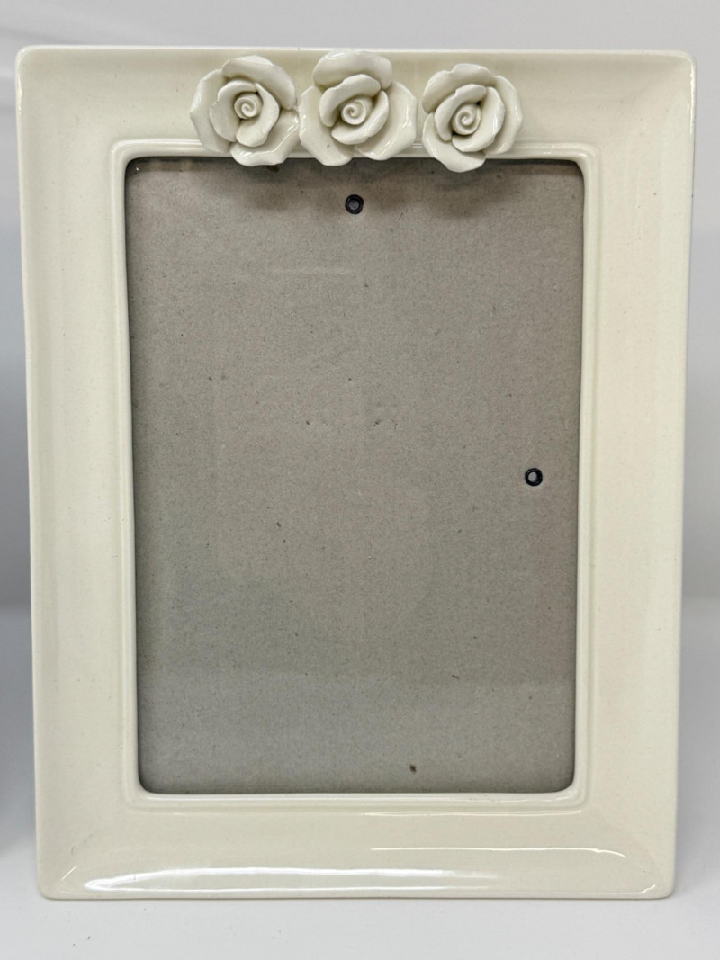 (2) Rhinestone Adorned Metal & Ceramic Rose Photo Frames Pewter roses with rhinestones 4”x6” Gold with rhinestones and black medallion 4”x6” (2) Matching cream ceramic rose frames 5”x7”