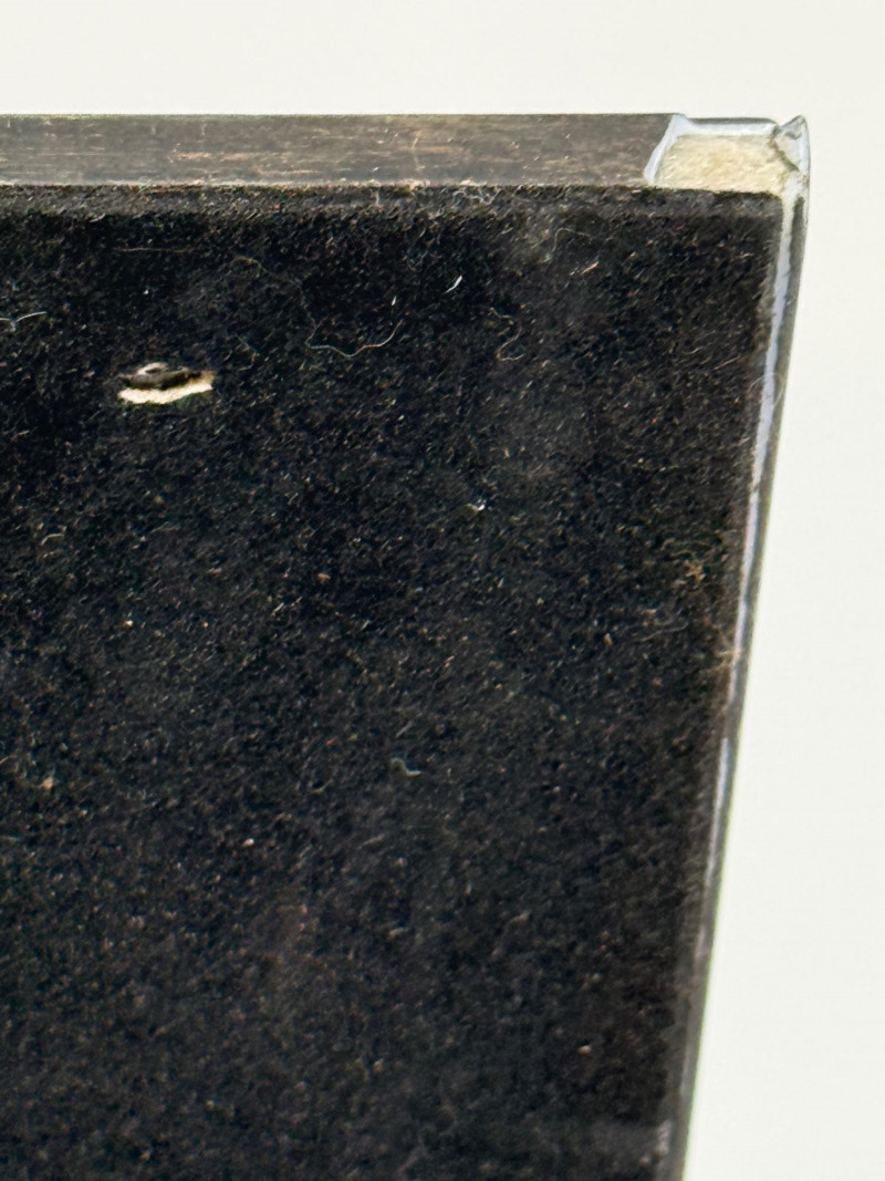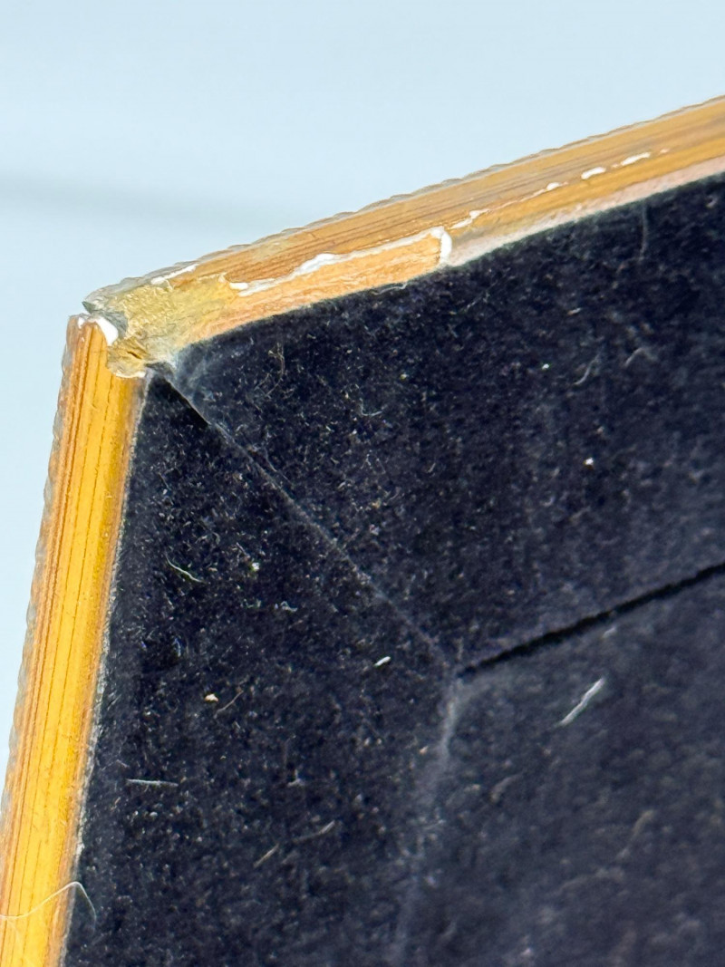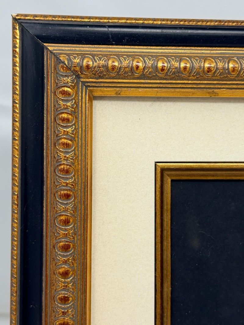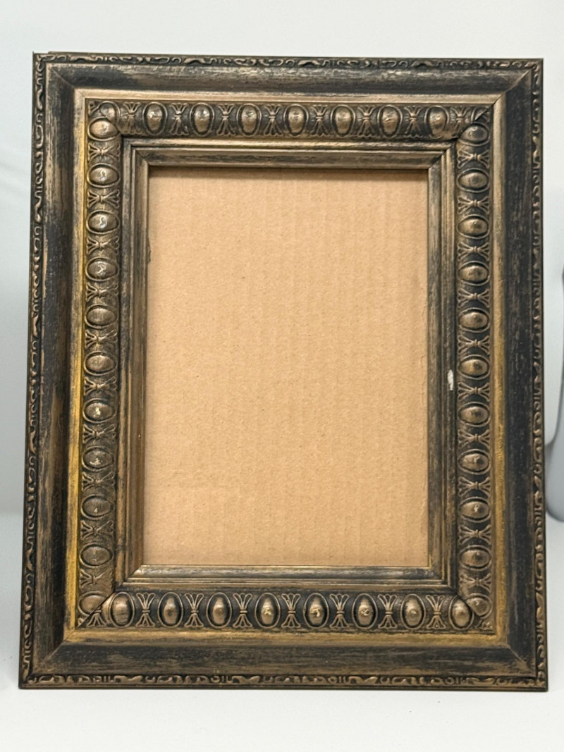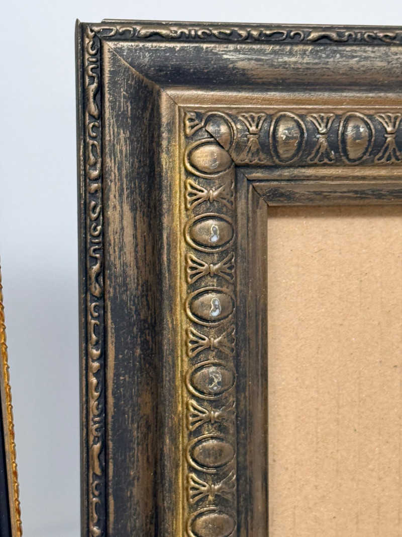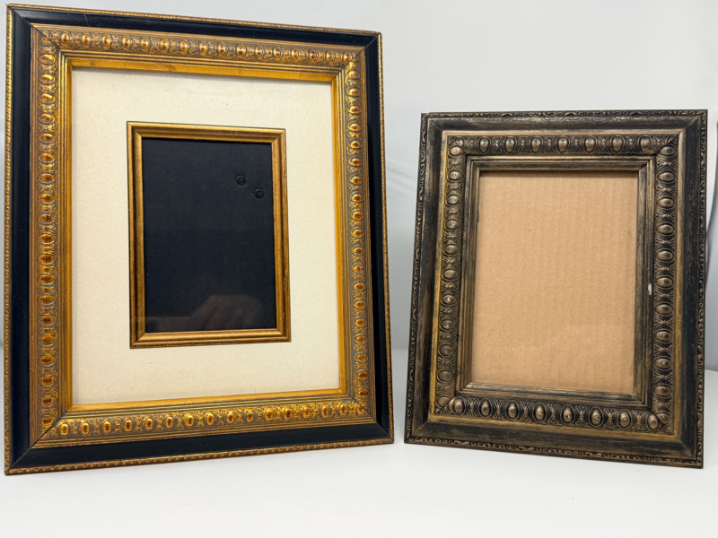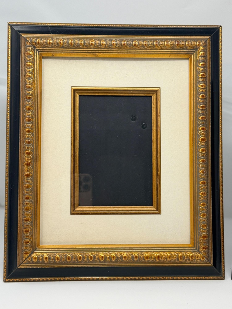 (2) Easel Stand Egg and Dart Photo Frames Black and gold wood framed with metal edge matting is 11”x1”x13” OD and 5.75”x3.75” inside Brown wood frame is 8.75”x1”x10.75” OD and 4.75”x6.75” inside Frames match with egg and dart molding.