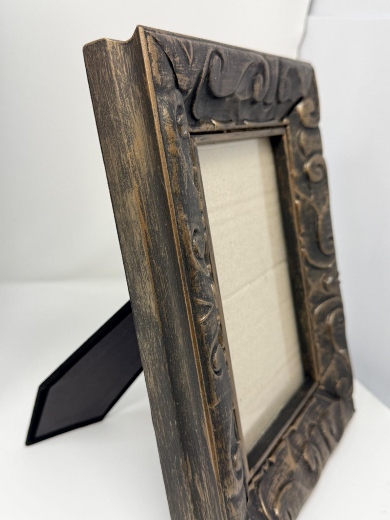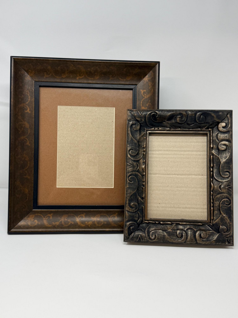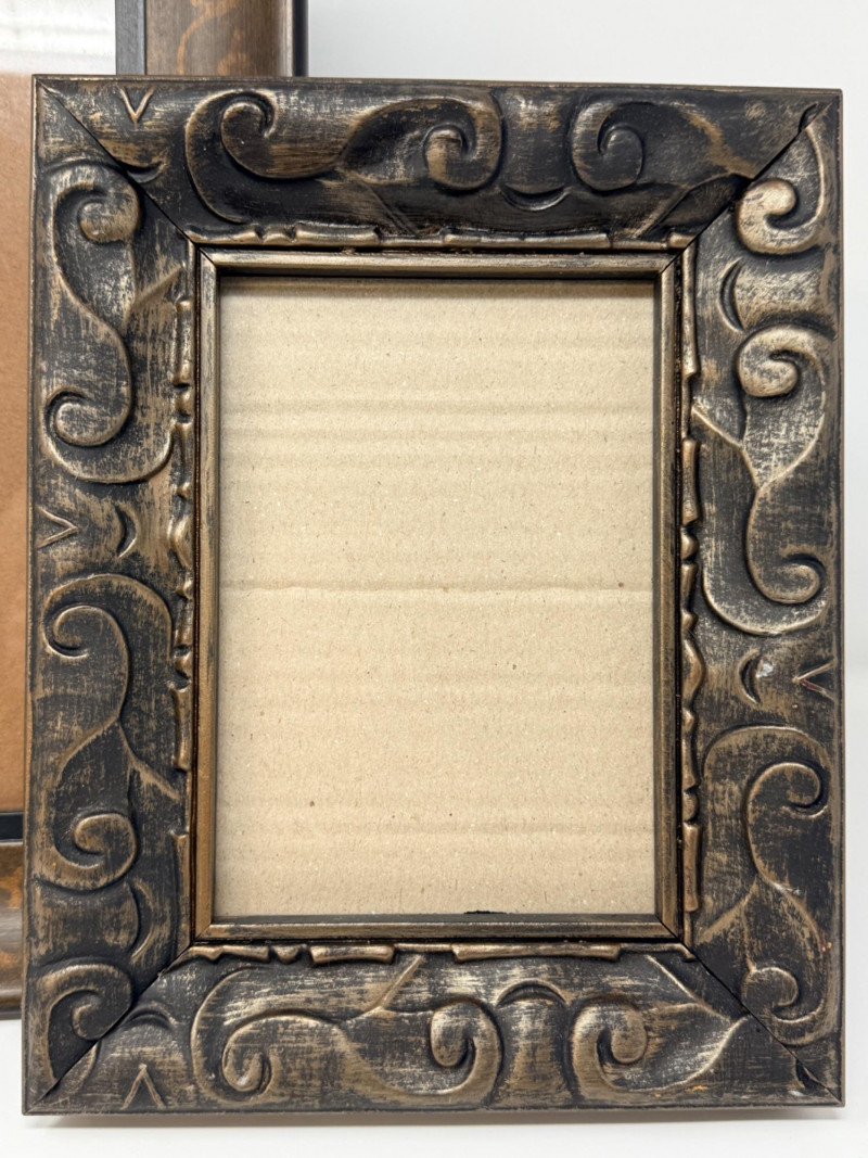 (2) Easel Stand Wood Frames Larger frame is 11.5”x1.5”x13.5” OD and 4.5”x6.5” inside Smaller 8”x1.25”x10” OD and 4.5”x6.5” inside