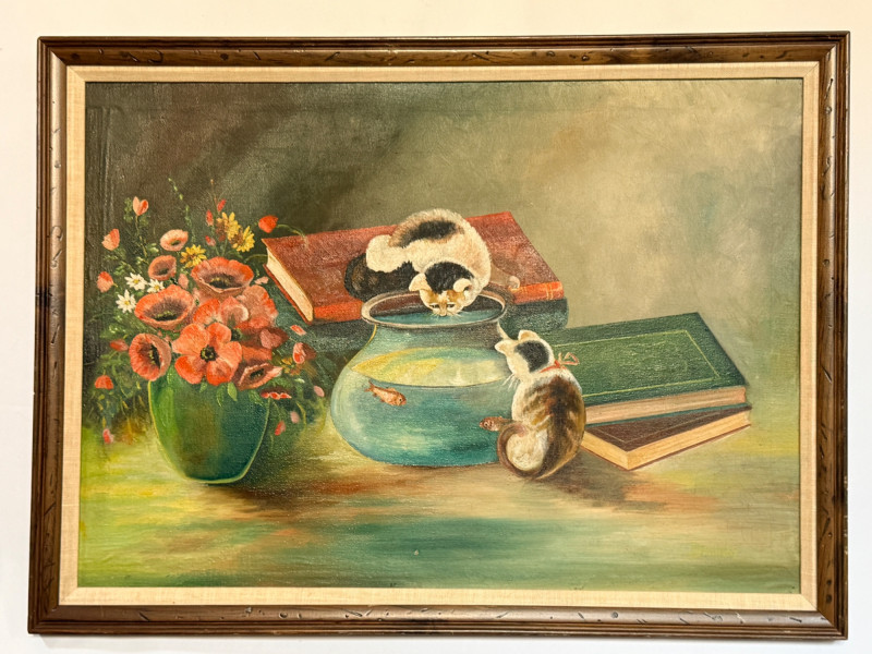Lot # 120 - Mid-Century Original Oil Painting of Cats and Goldfish