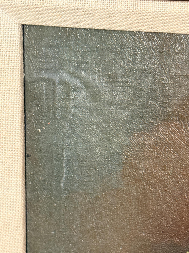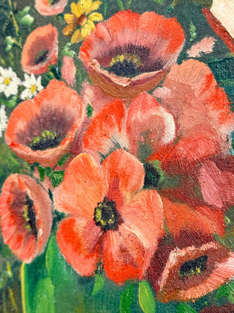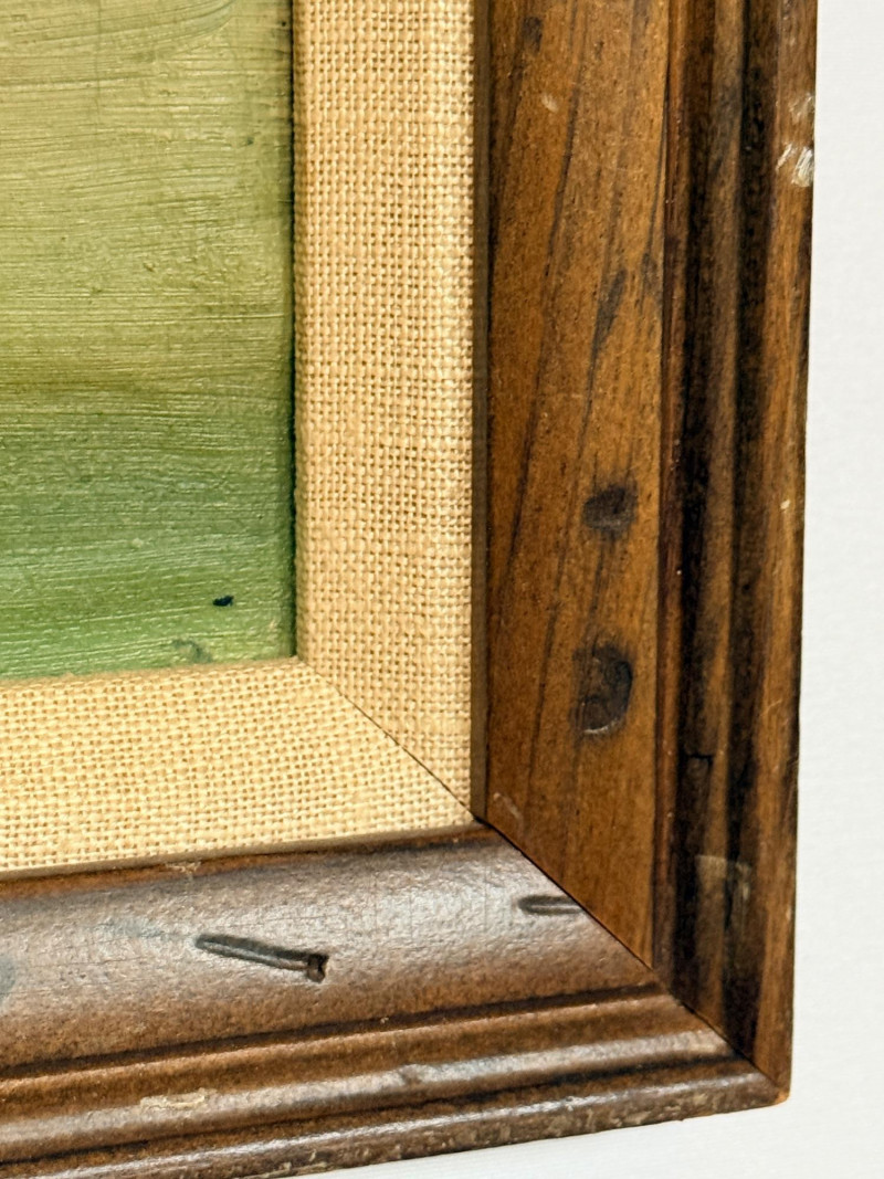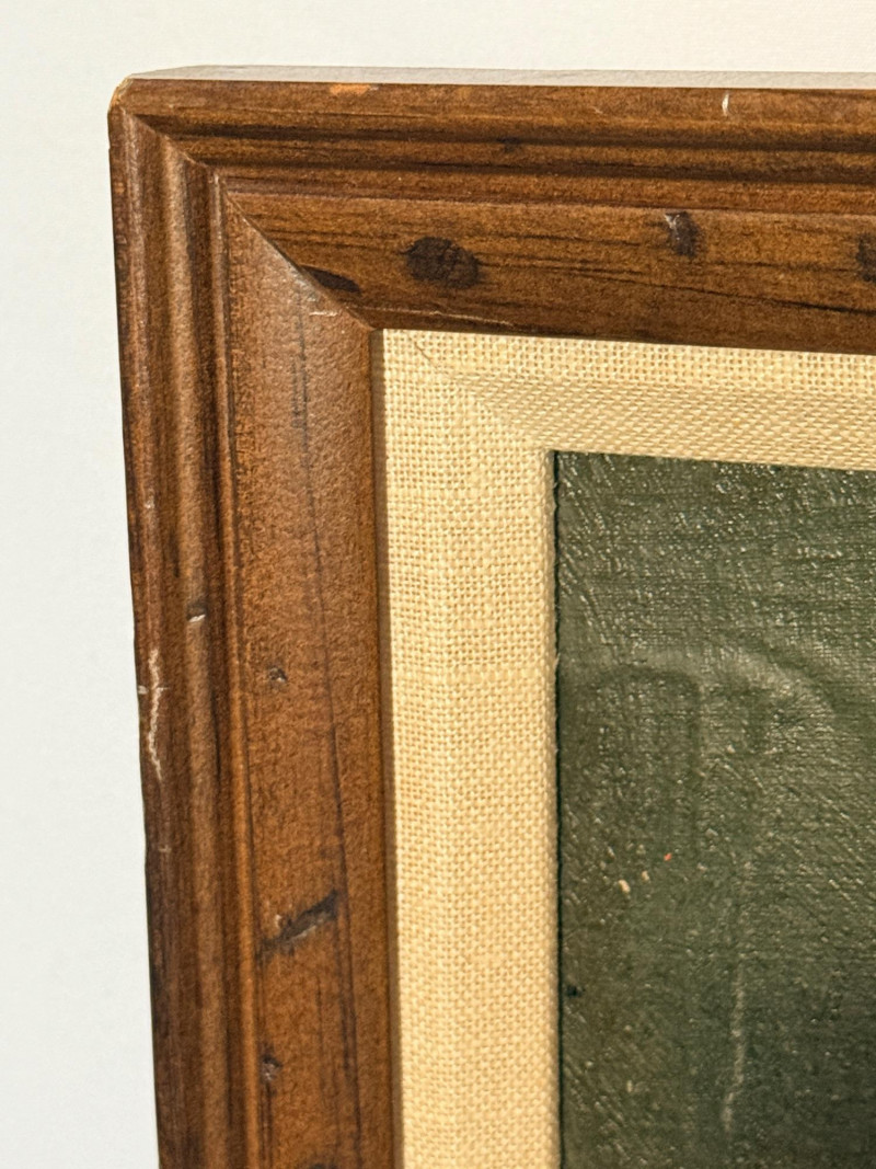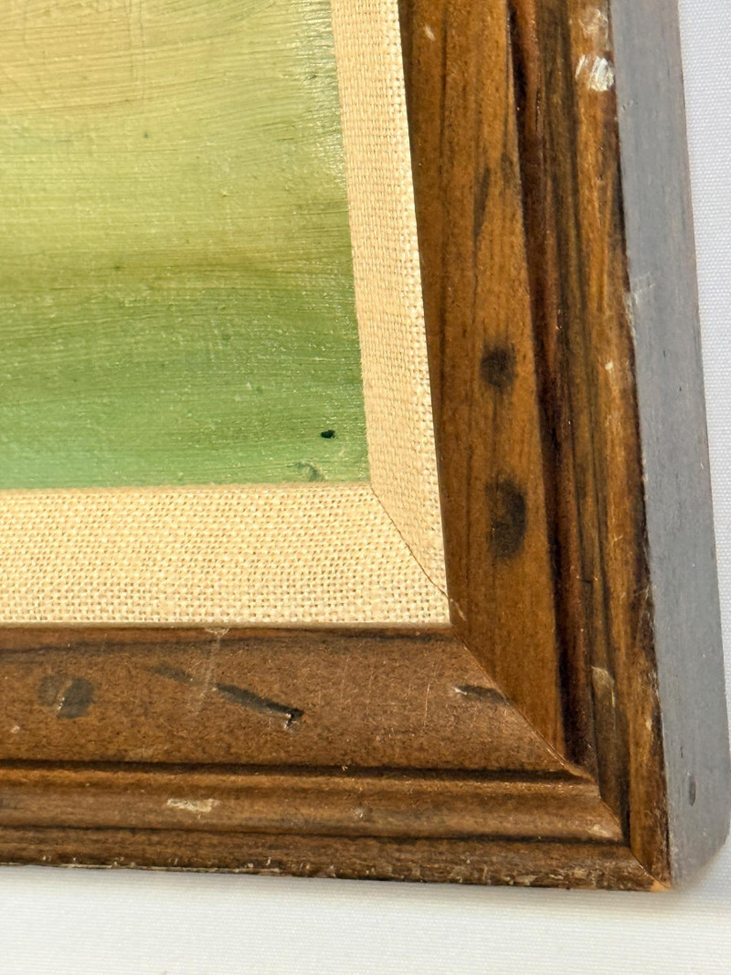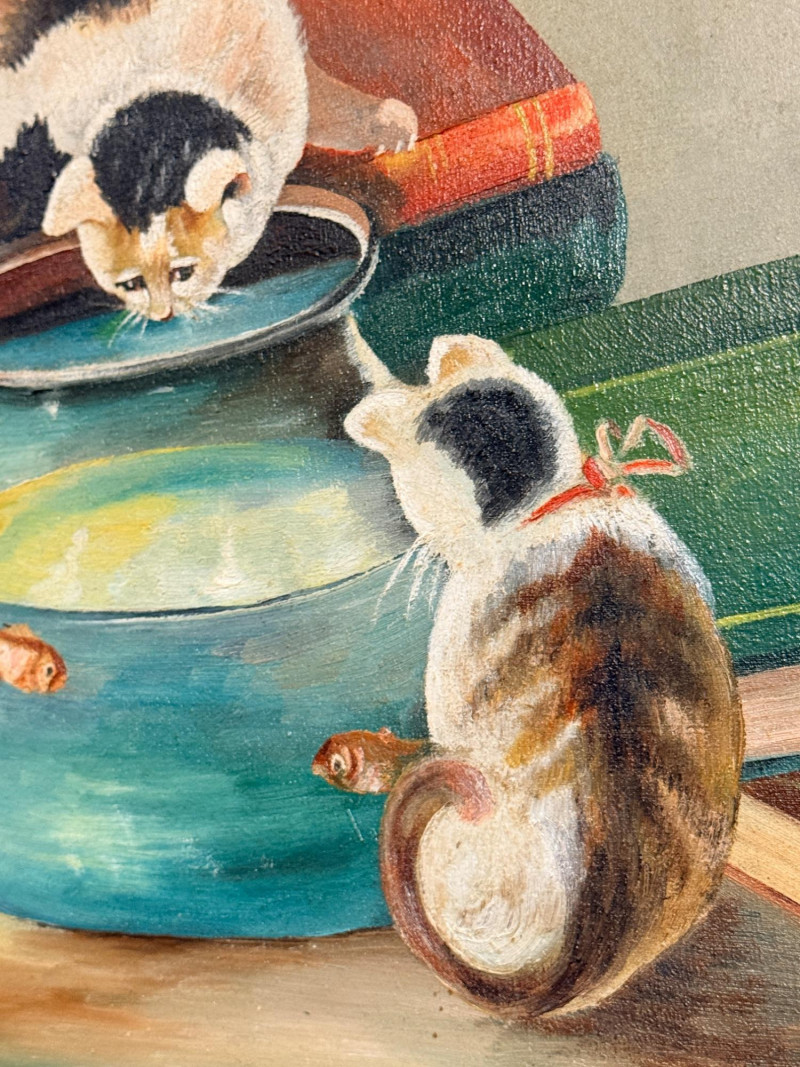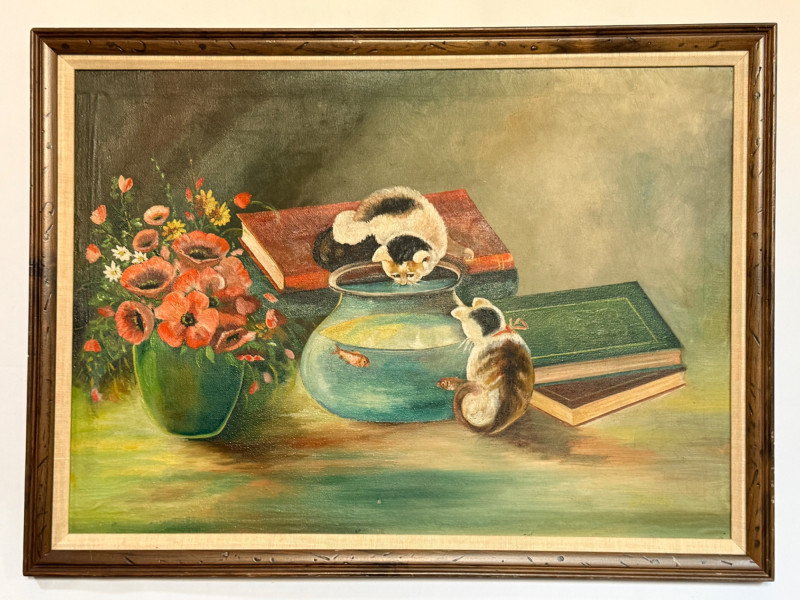 Mid-Century Original Oil Painting of Cats and Goldfish This artwork is an original oil painting that appears to be a mid-century or vintage piece depicting two kittens, a goldfish bowl, books, and flowers.