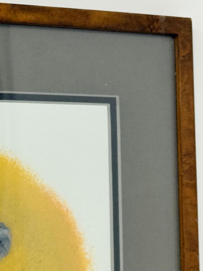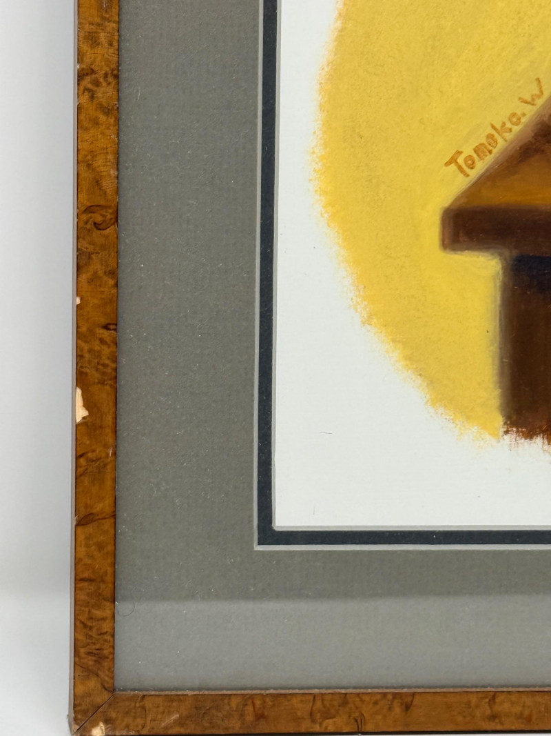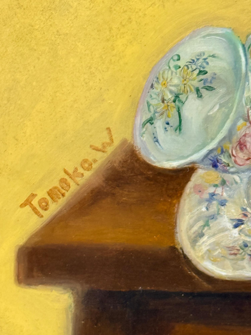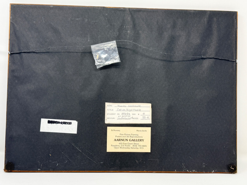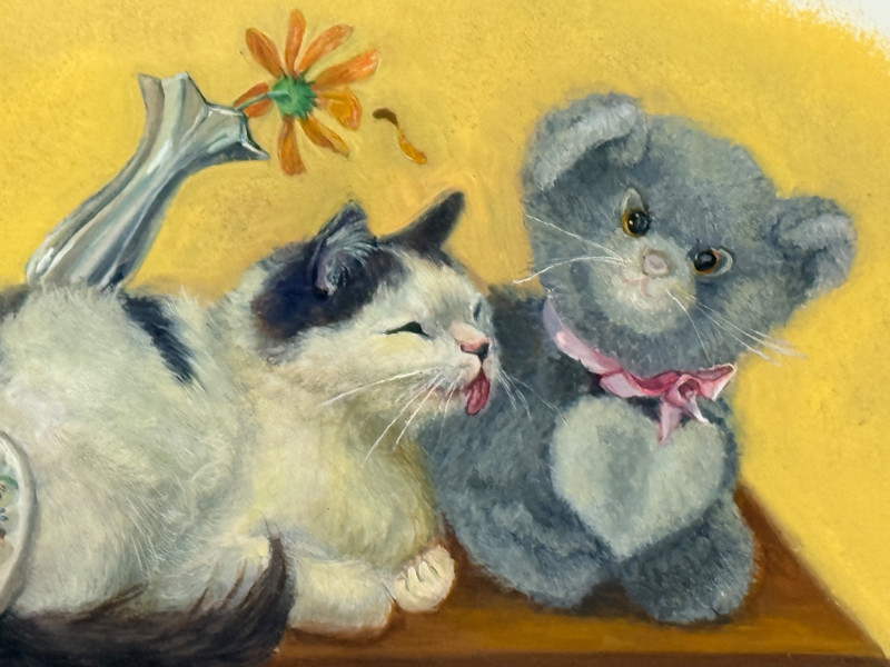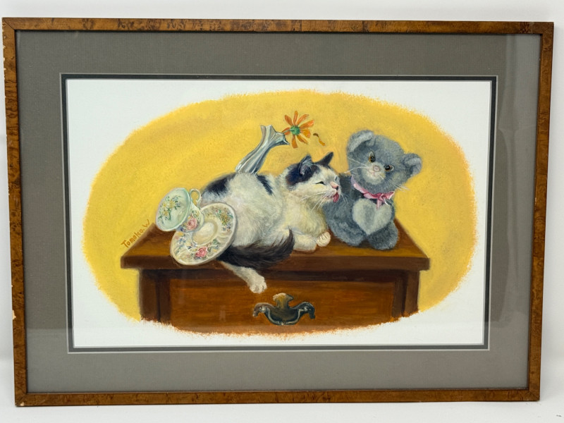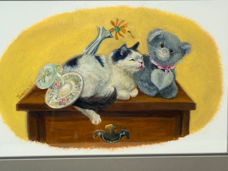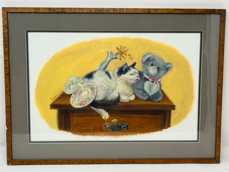 Cat On A Night Table by Tomoko Watanabe The work is a whimsical, illustrative painting that combines elements of a cat portrait and a still life. It features a realistic black-and-white tuxedo cat, a stylized grey toy cat with a pink bow, a fallen vase with a flower, and a delicate floral teacup and saucer set on a wooden dresser An oil paint on illustration board, professionally framed under glass with wire hanger.