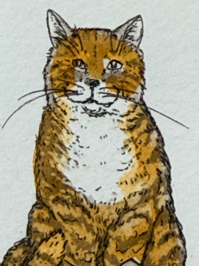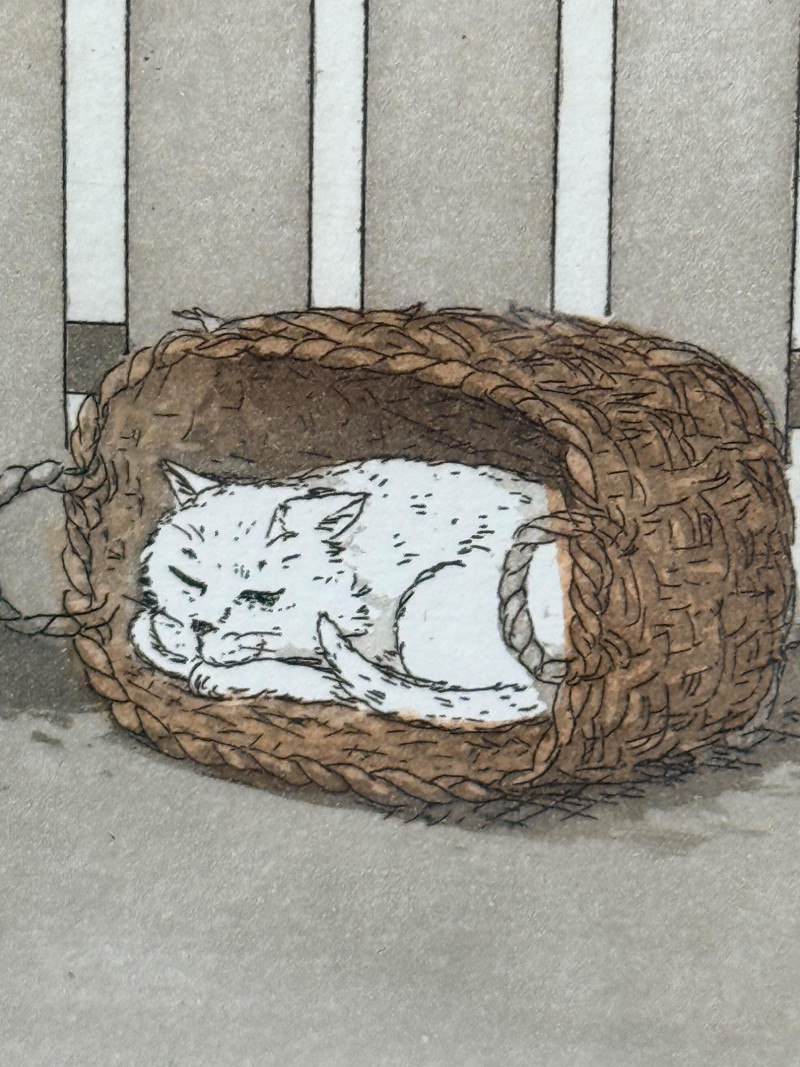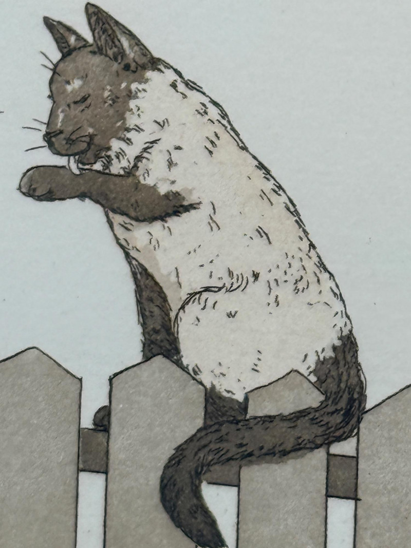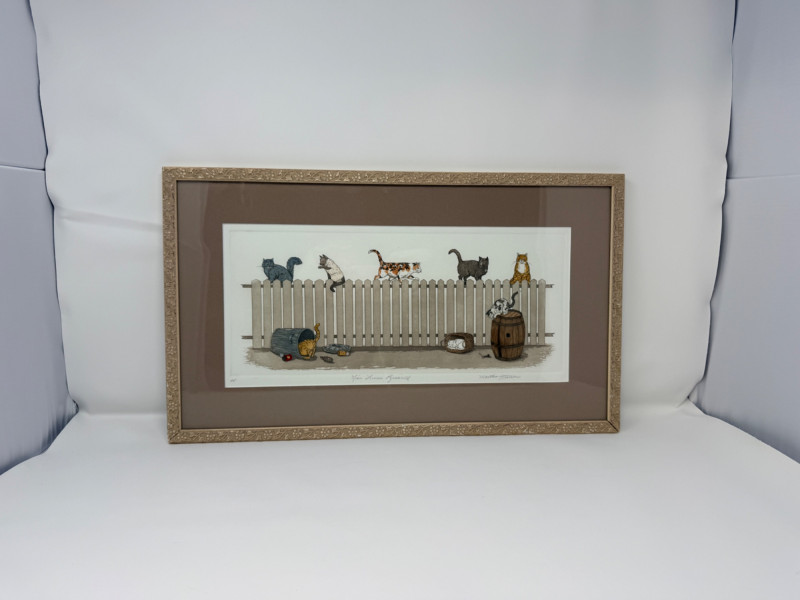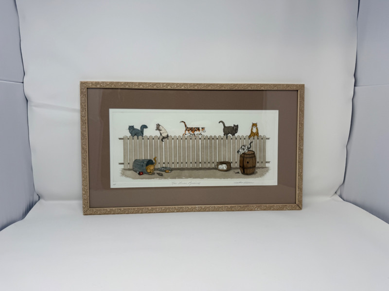 Nine Lives Reunion Signed by Artist Martha Hinson Pen and ink art depicting a reunion of cats on a picket fence. 20.25”x.75”x11.75”