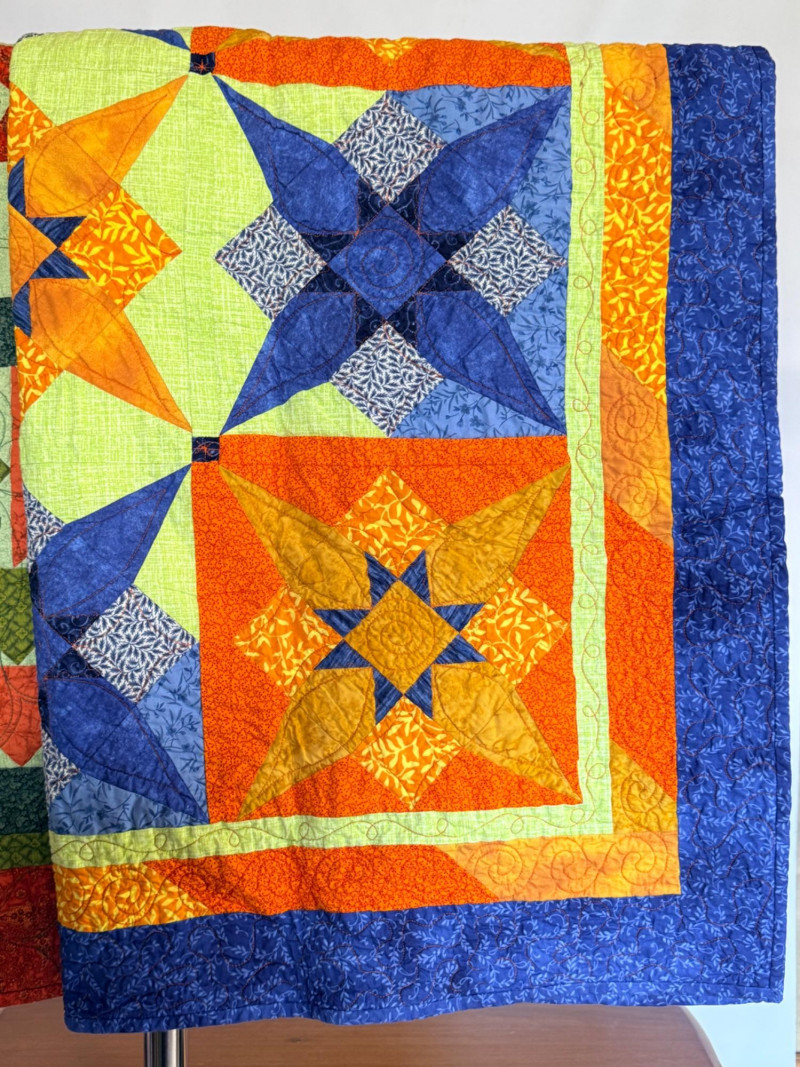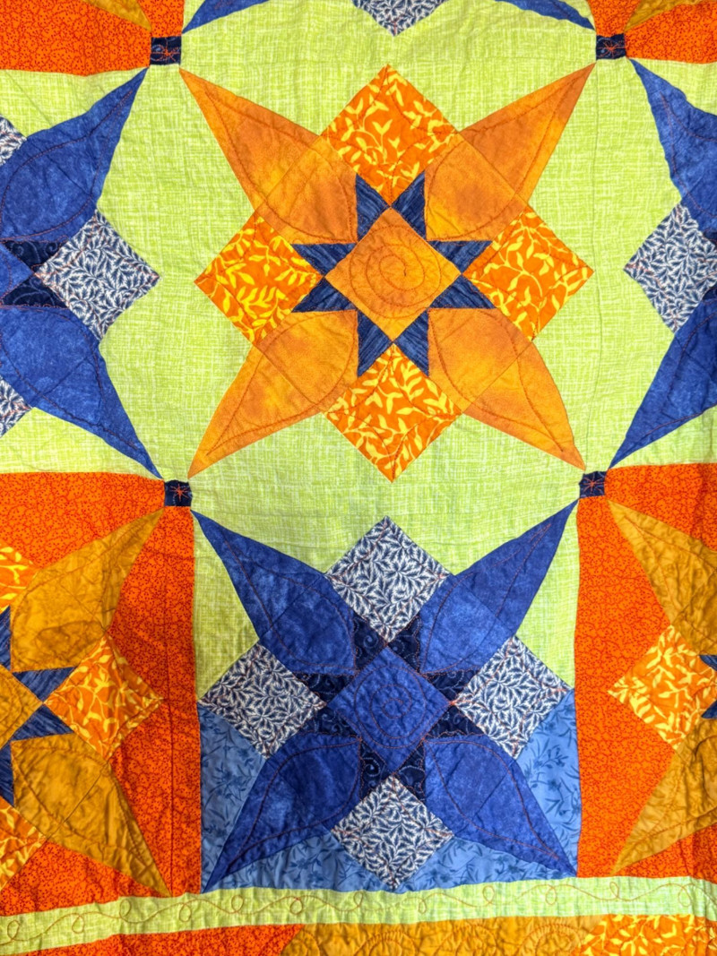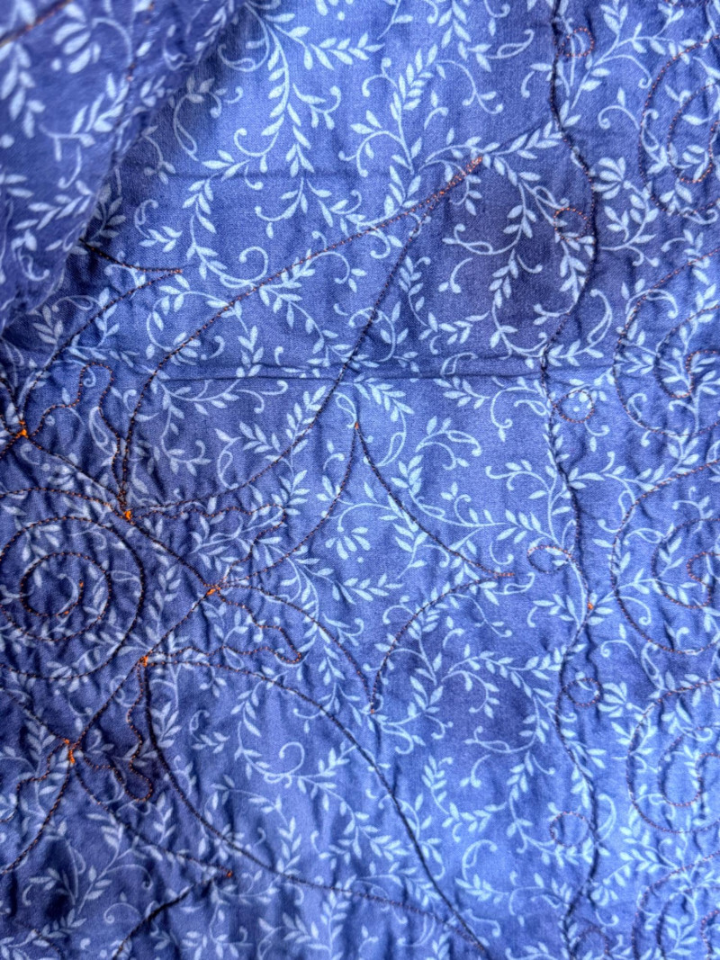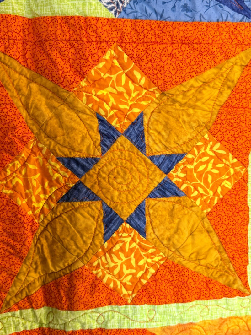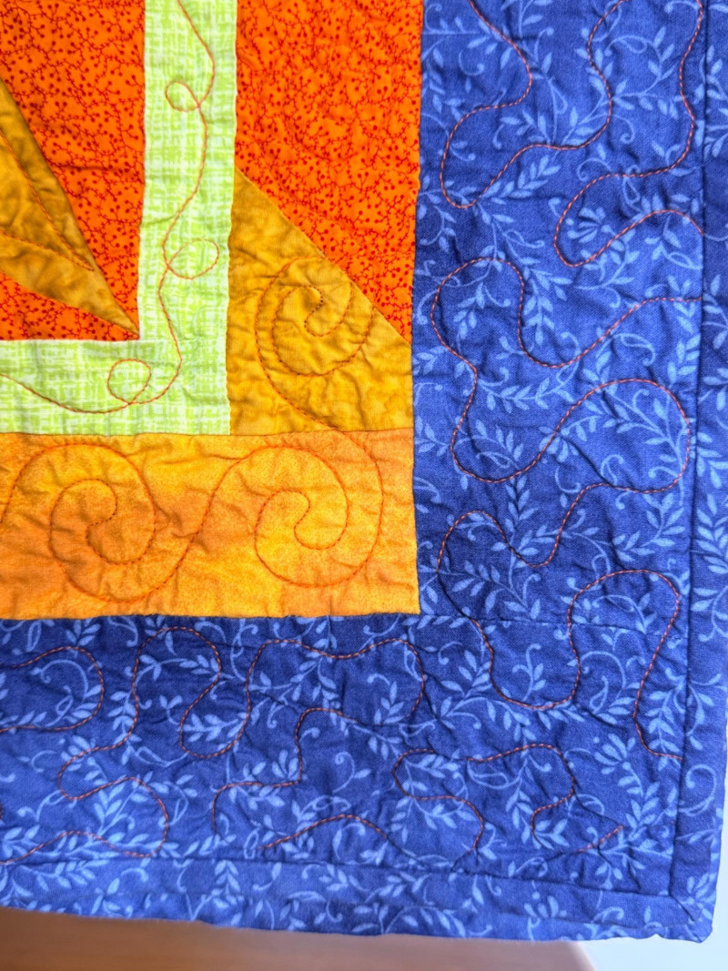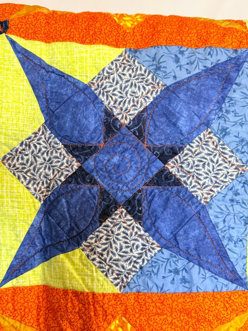 Blue and orange quilt with blue print backing is 42”x40”