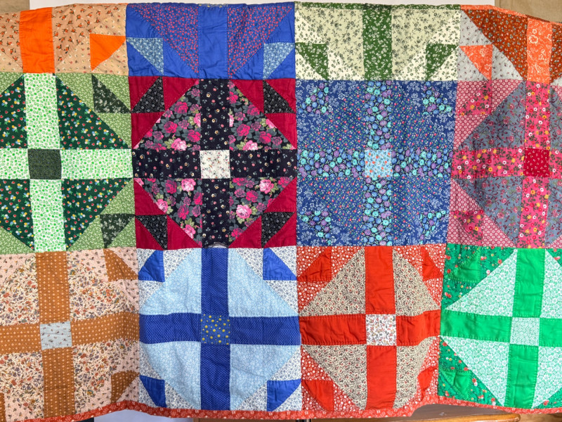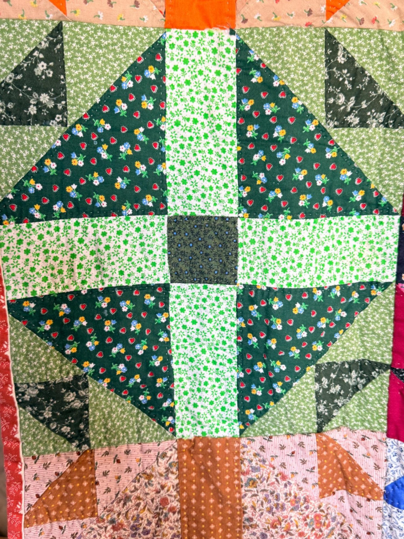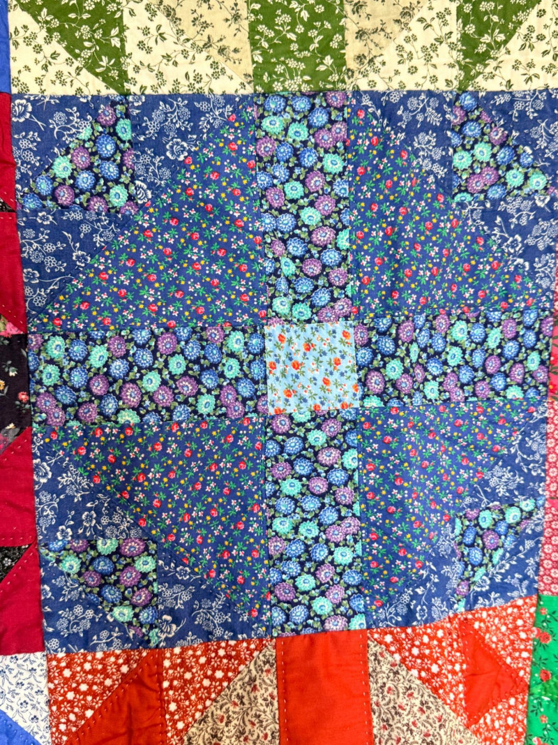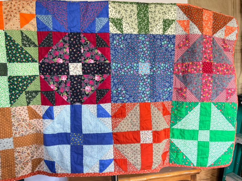 Arkansas Crossroads Handmade Throw Quilt multicolor with burnt orange backing Handmade by Karen Lewis 48”x48”