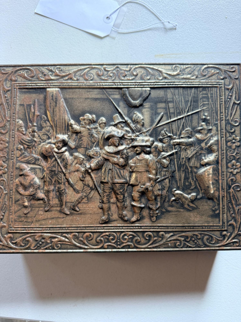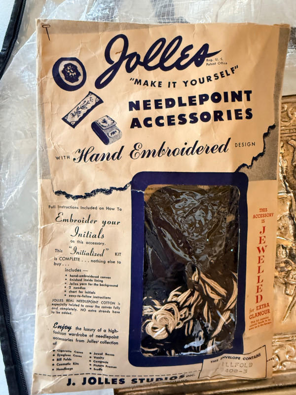 Pre-cut pieces and embroidery thread, scissors, all in a vintage biscuit tin.