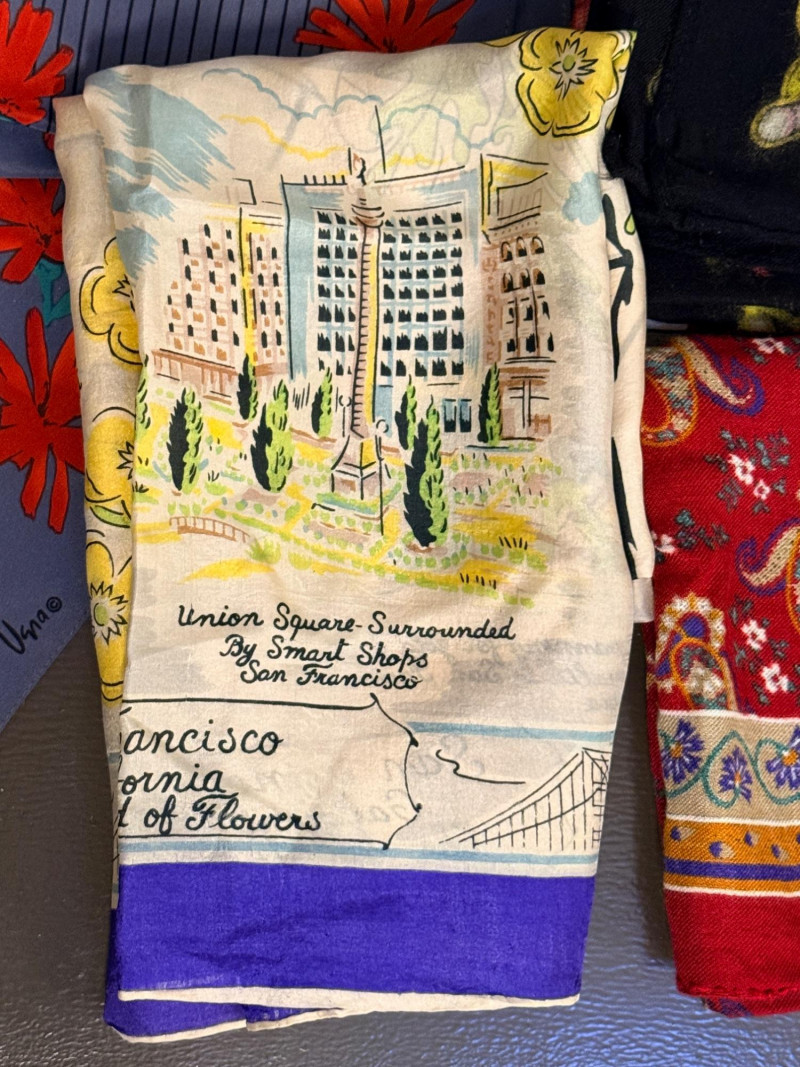 Large silk scarf of San Francisco has a little wear to an edge.
