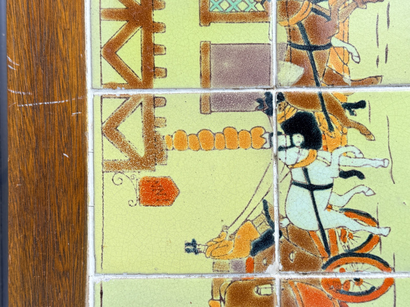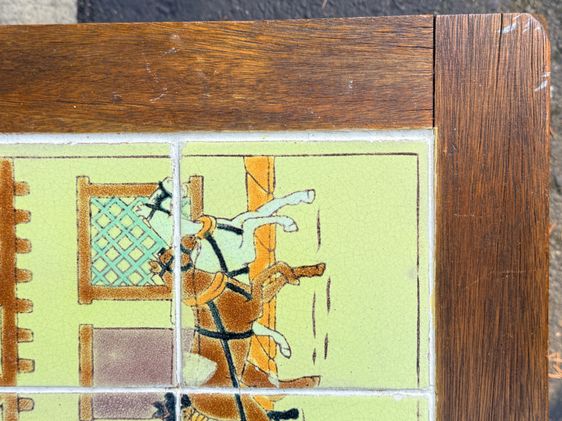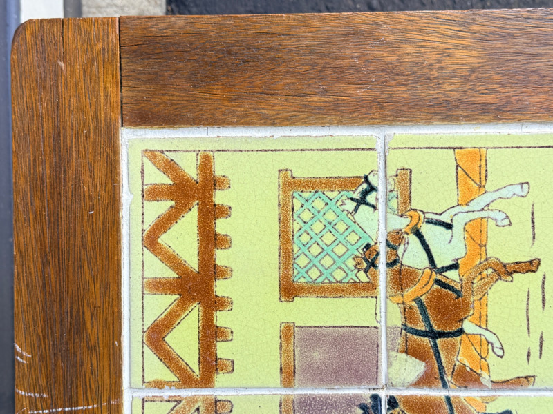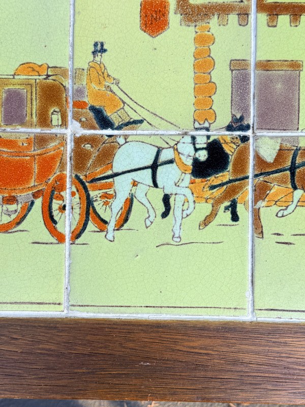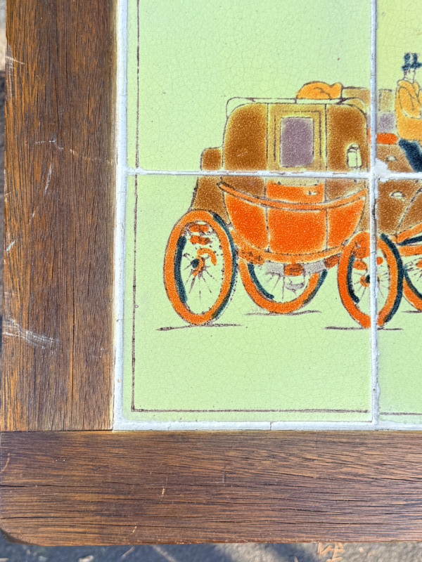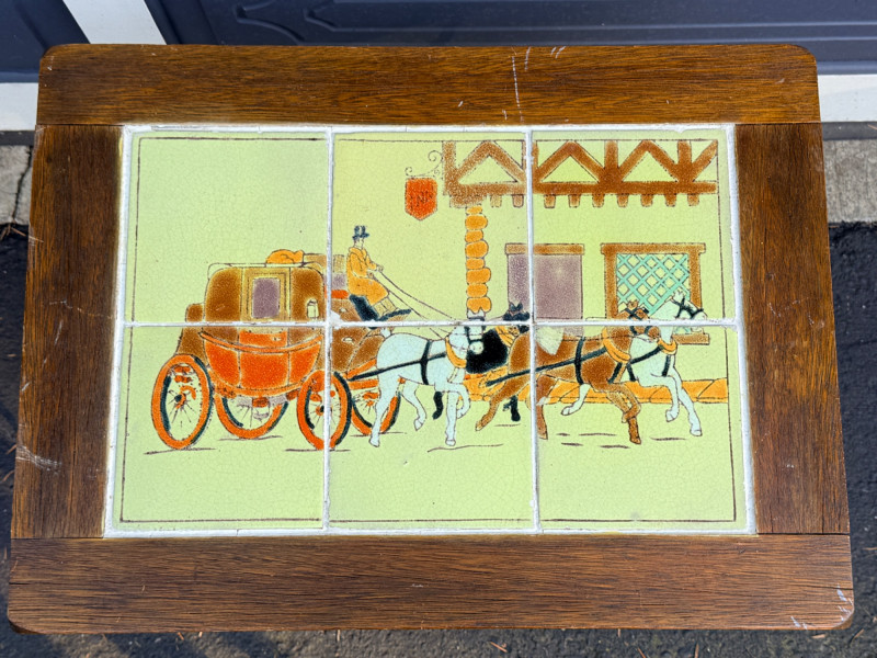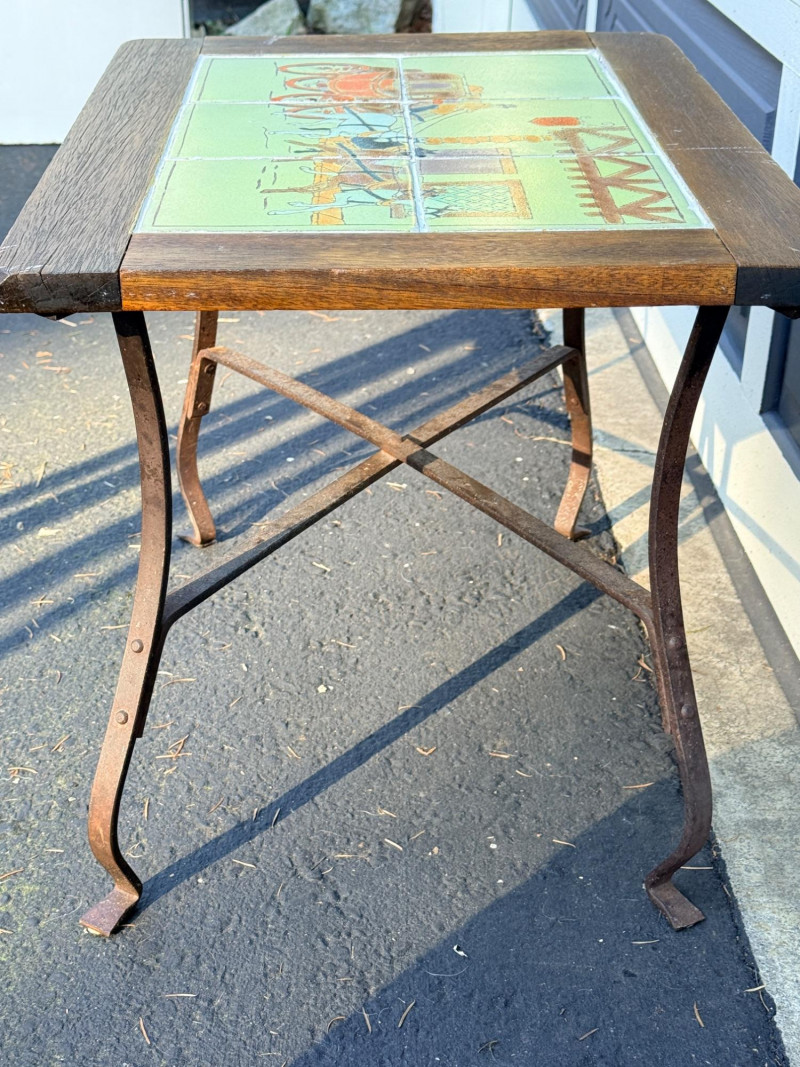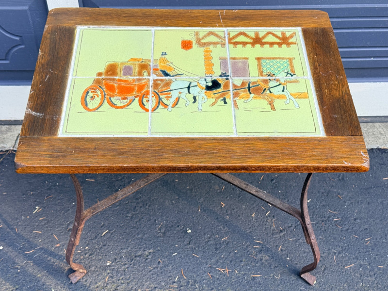 Early 20th-century antique iron table featuring decorative tiles with a coaching scene, often associated with the Arts & Crafts movement or California tile companies from the 1930s. Grout is intact See pics for condition. 24x17.5”x17.5”
