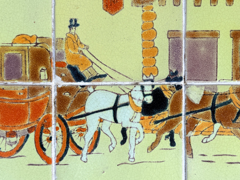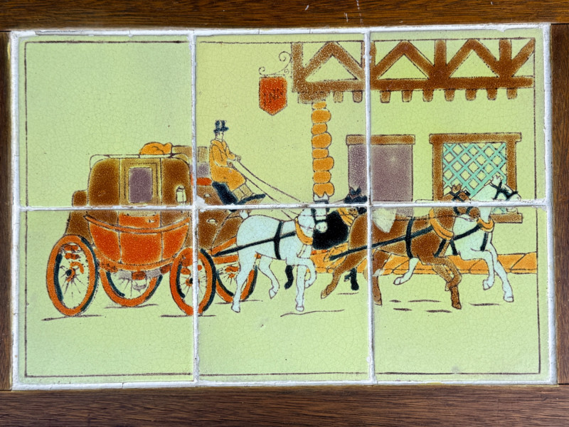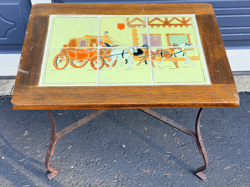 This table has a wrought iron base with hand-painted tile tops. The tile depict a stagecoach scene.