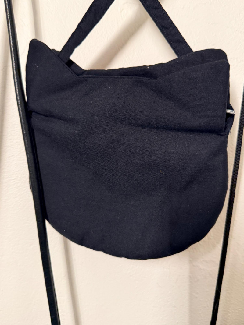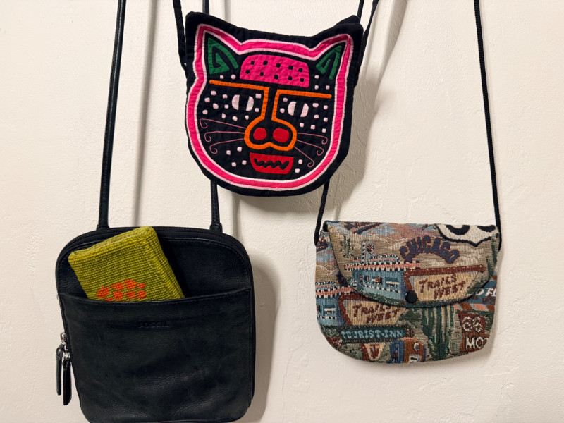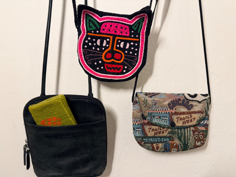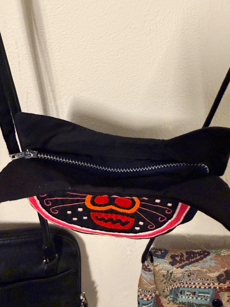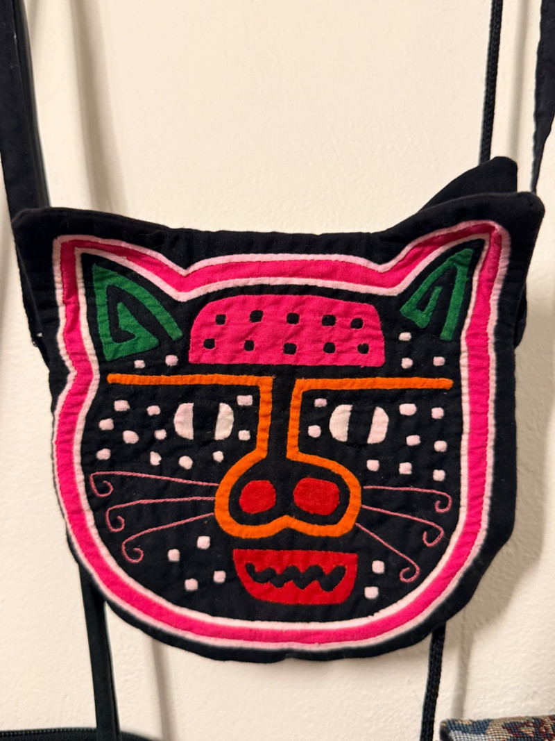 This colorful cat bag is a Mola, a traditional hand-made textile art made into a crossbody