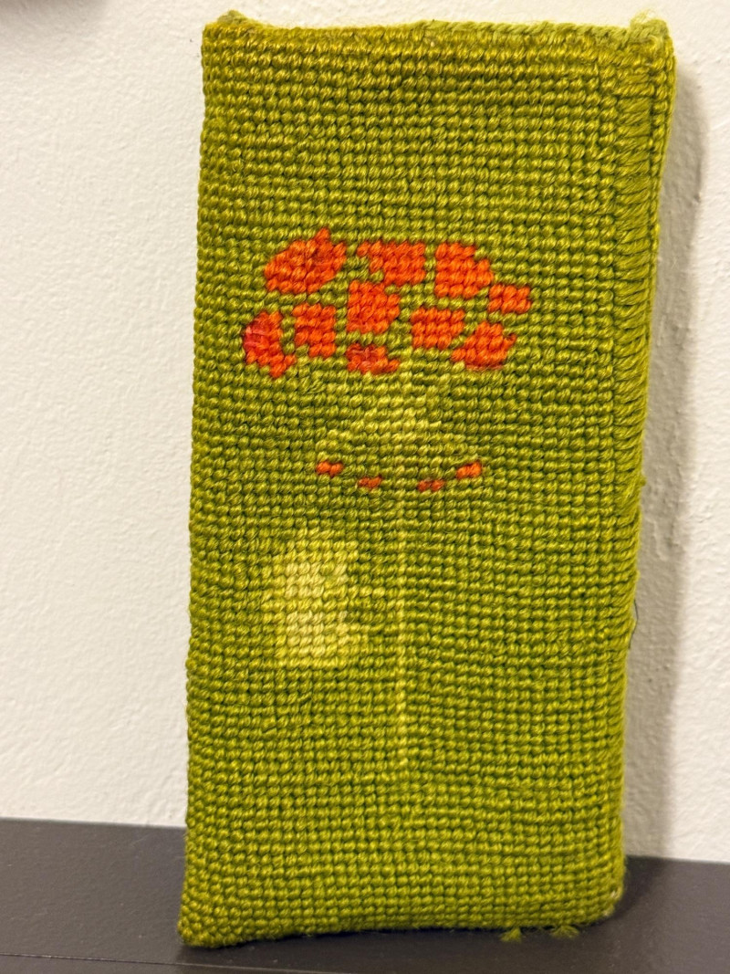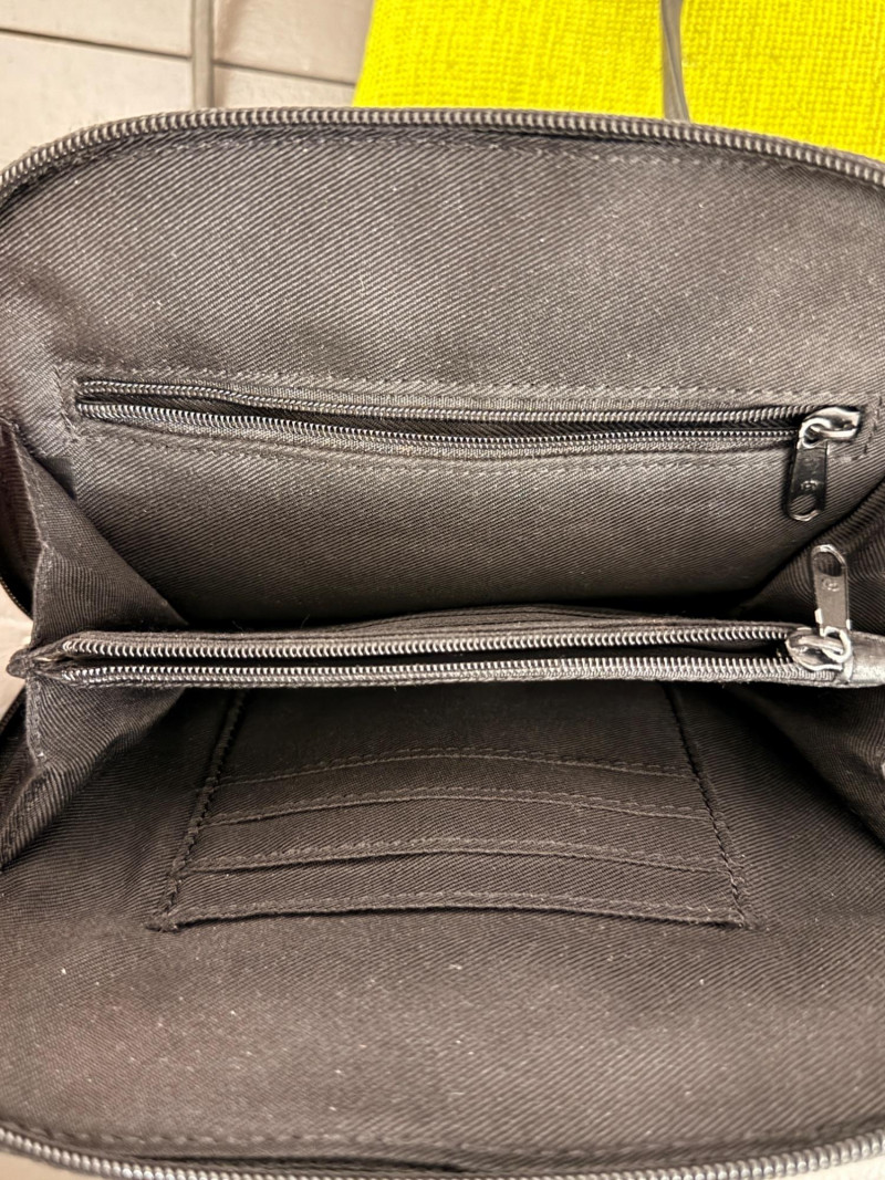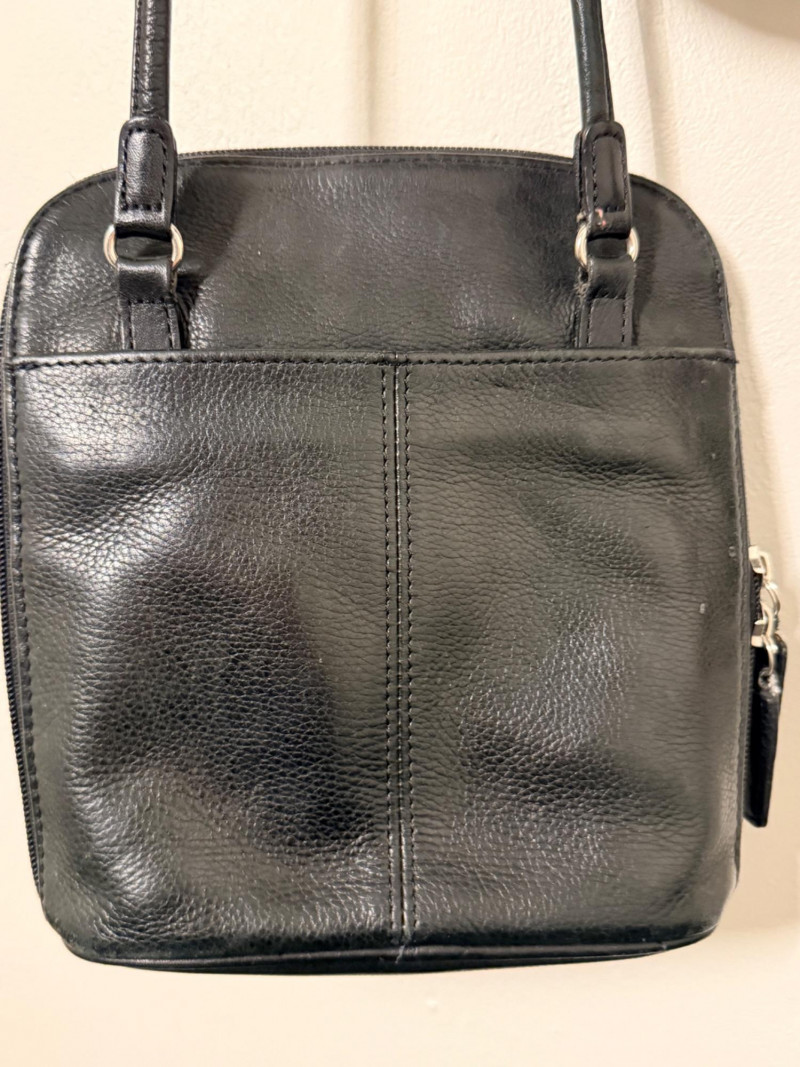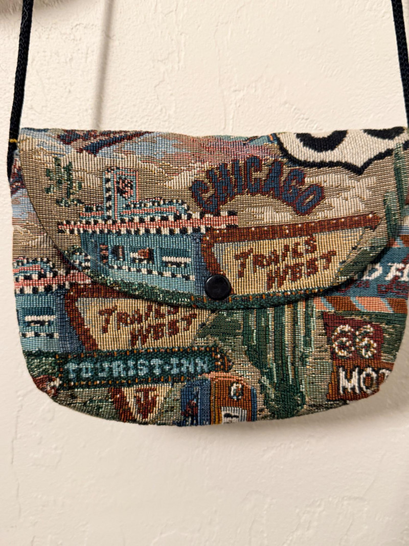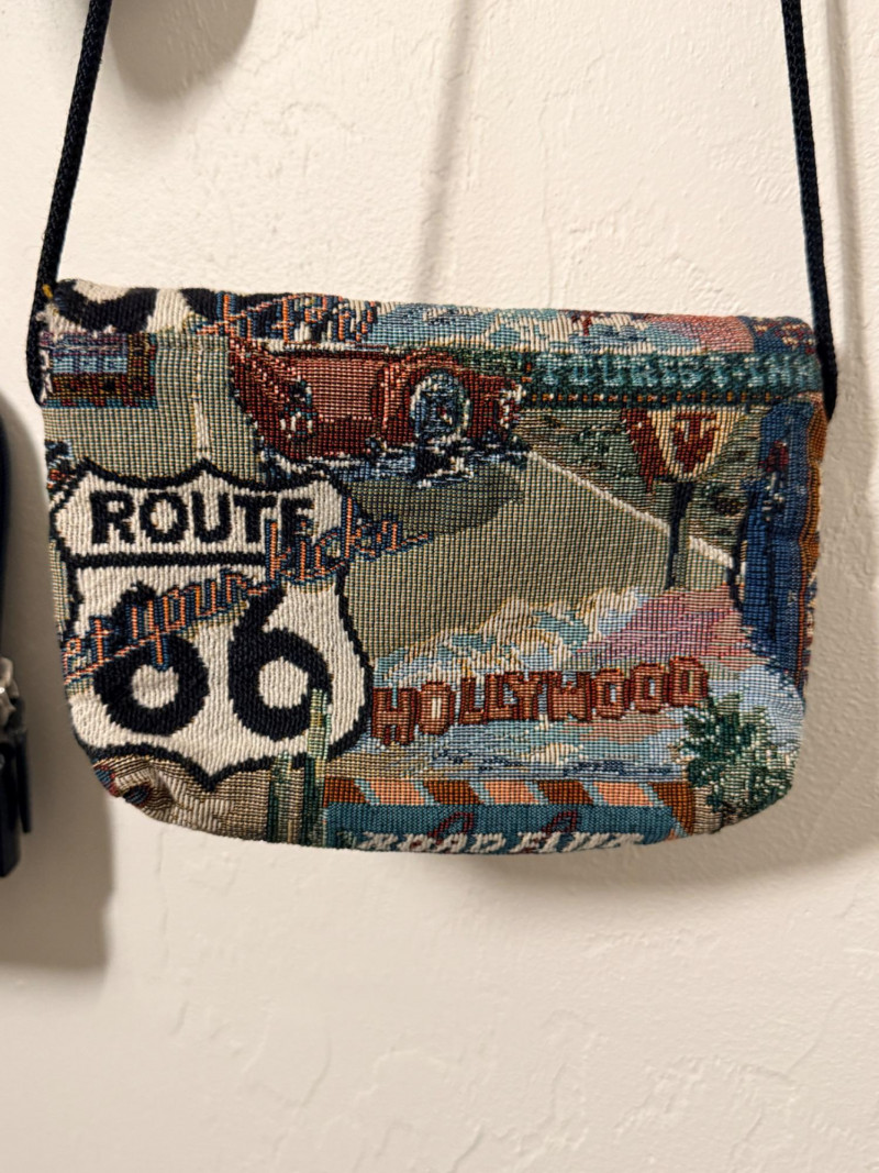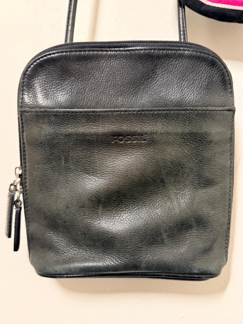Black Leather Fossil - Mola Cat & Tapestry Crossbody Bags Black pebble leather Fossil crossbody with zip over opening and exterior pocket. 7”x8”x2” Route 66 tapestry crossbody Plus a green vintage needlepoint lined soft glasses case.