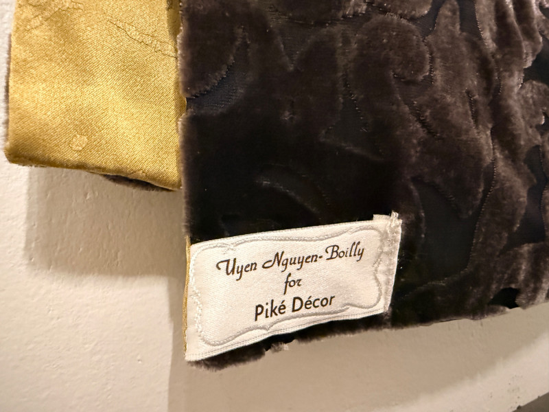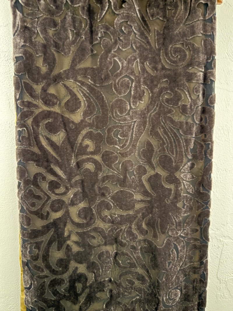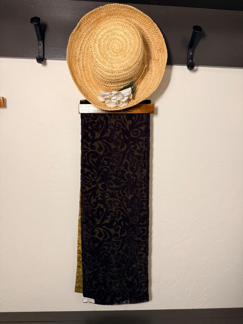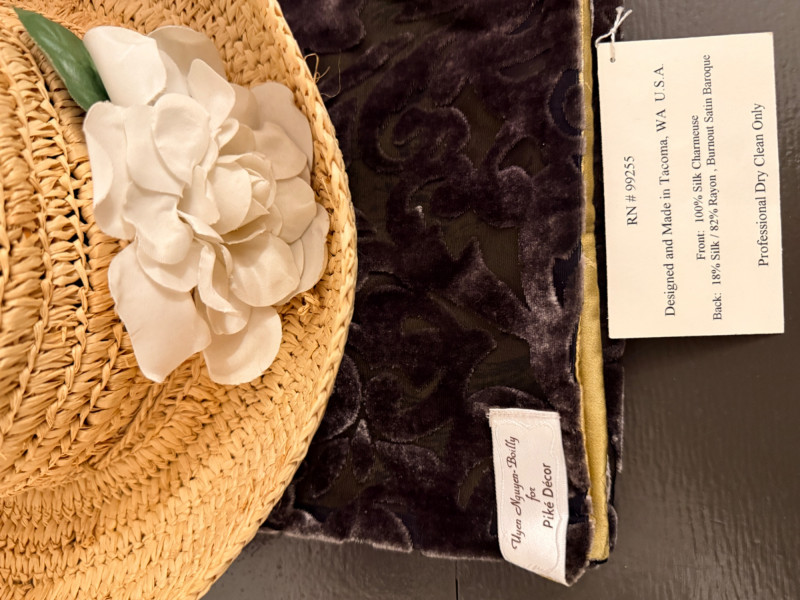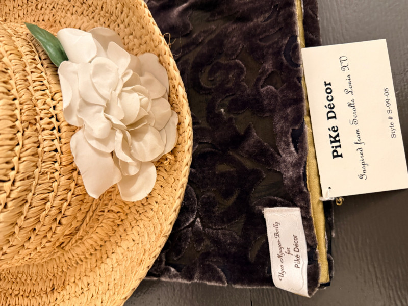 Piké Décor Velvet Burn Out Scarf and Woven Straw Sun Hat 10” wide dark gray velvet burnout scarf with gold satin backing, designed and made with fine fabrics in Tacoma by Uyen Nguyen-Boilly for Piké Décor. 13” straw Sun hat.