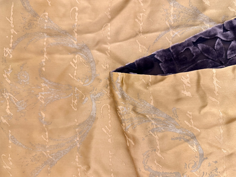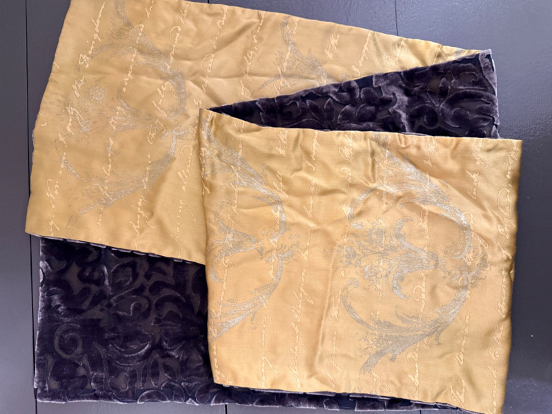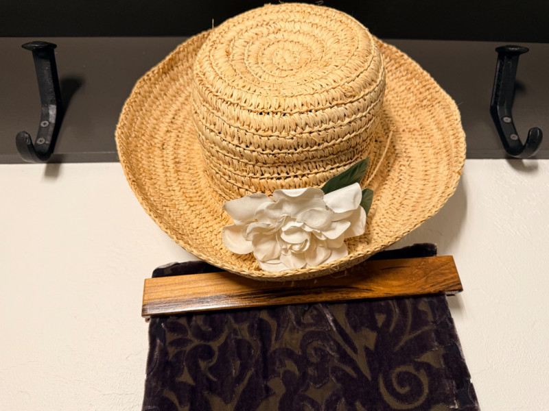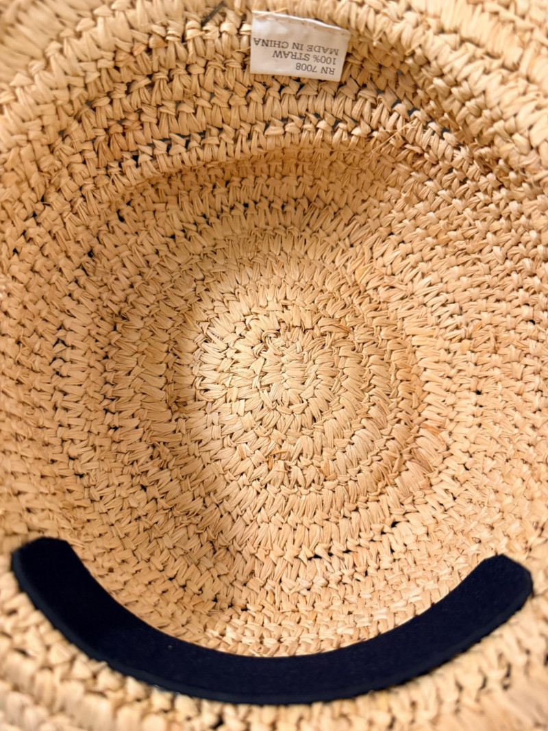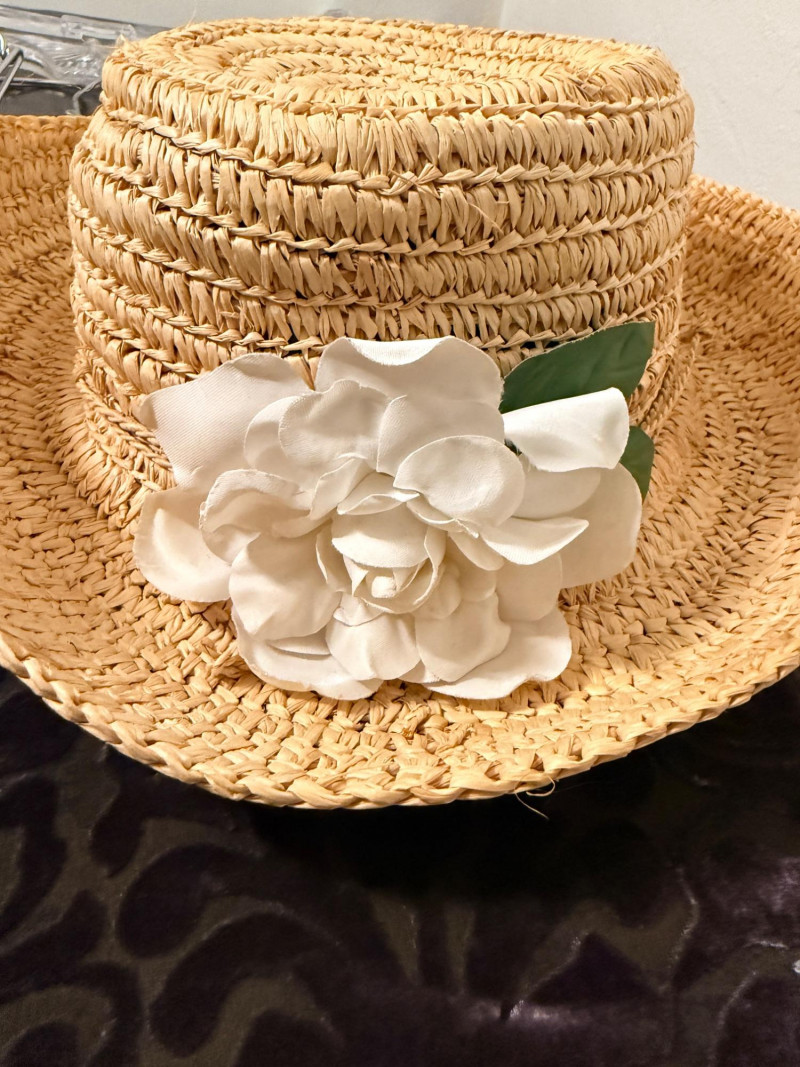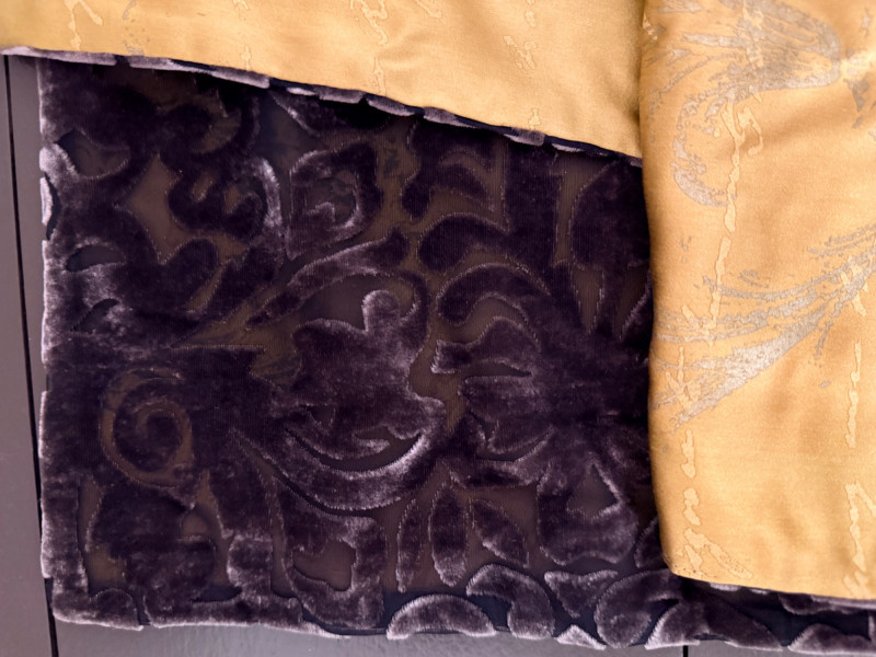 Piké Décor Velvet Burn Out Scarf and Woven Straw Sun Hat 10” wide dark gray velvet burnout scarf with gold satin backing, designed and made with fine fabrics in Tacoma by Uyen Nguyen-Boilly for Piké Décor. 13” straw Sun hat.